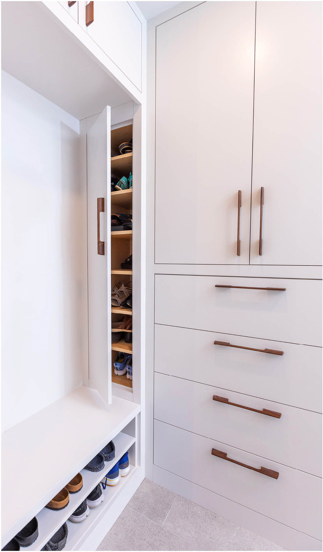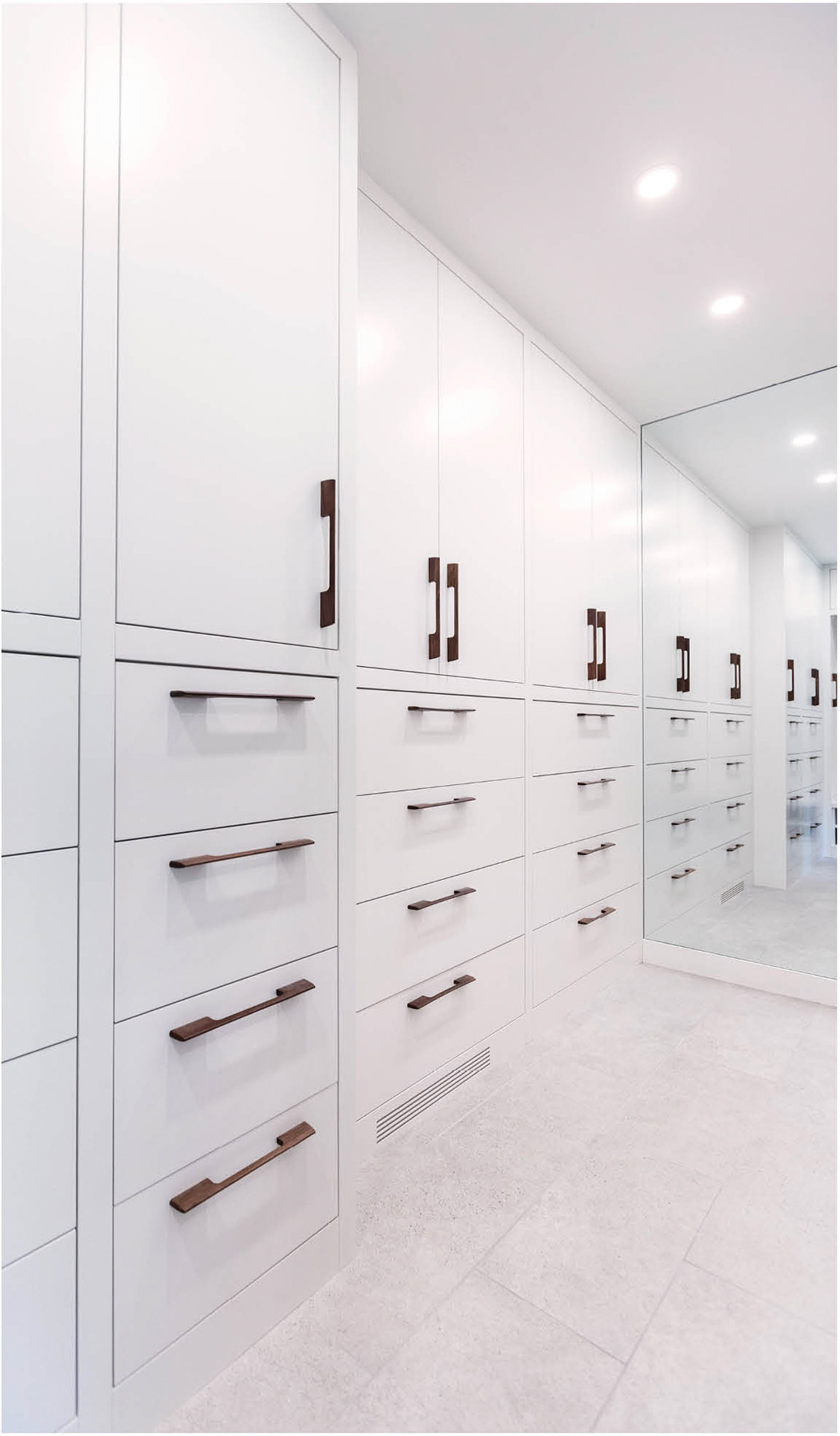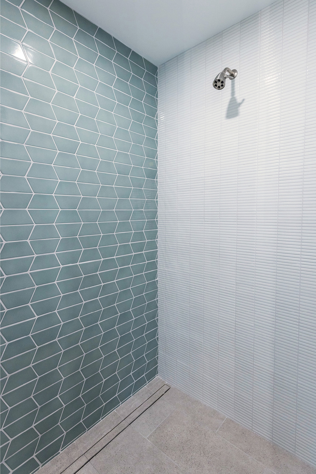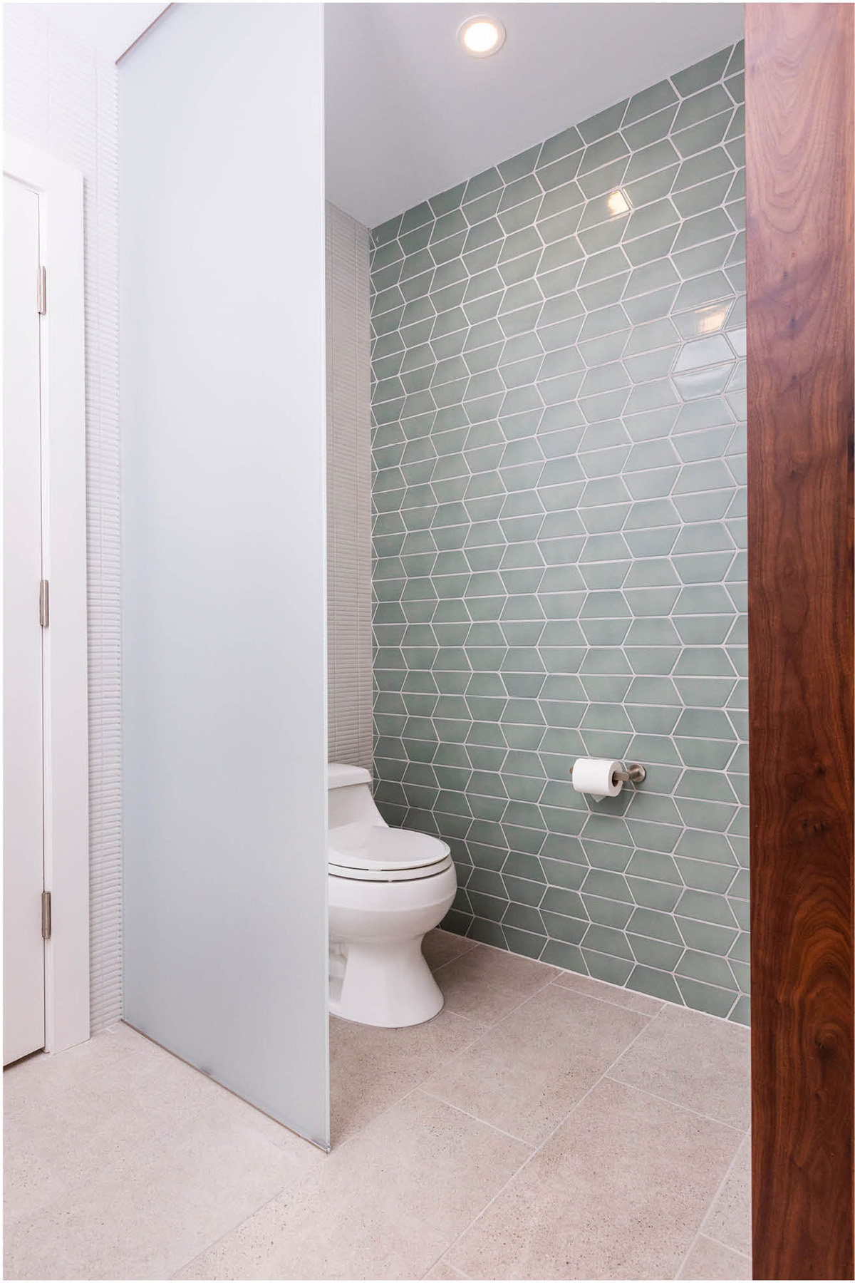 The redesign optimized space by reducing the footprint of the guest bathroom to a powder room and reallocating that area to expand the primary suite’s bathroom and closet. The new layout moved the closet to a darker interior zone, allowing the bathrooms to benefit from enhanced daylight. Privacy was addressed by relocating the Kohler San Souci toilet and shower away from windows and using frosted glass walls to provide privacy while maintaining an open feel.