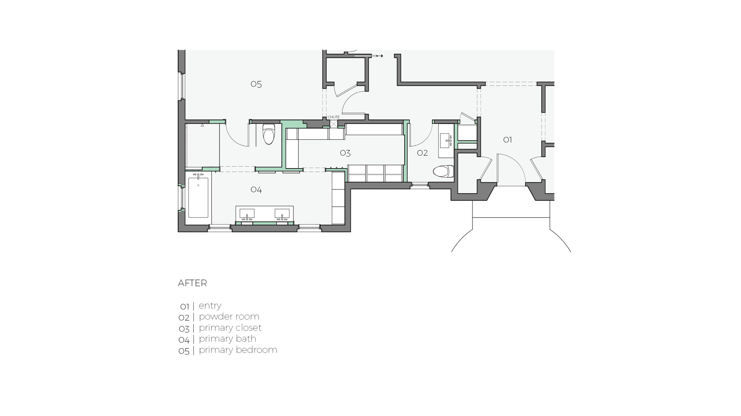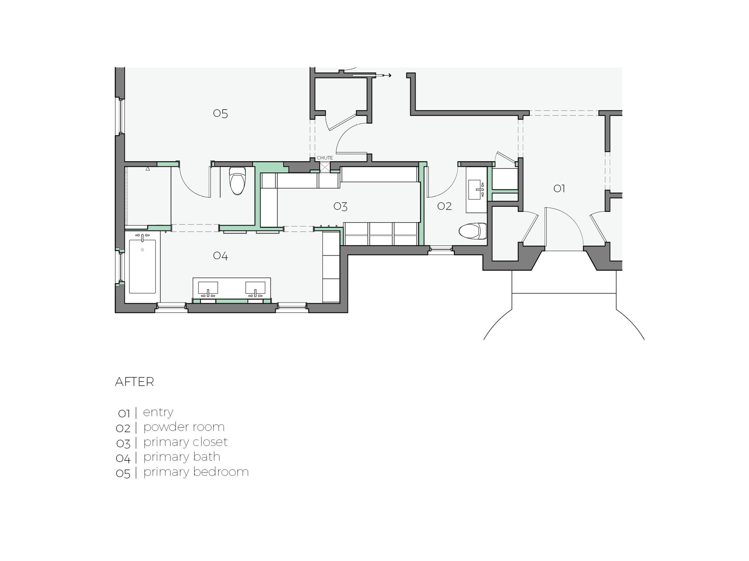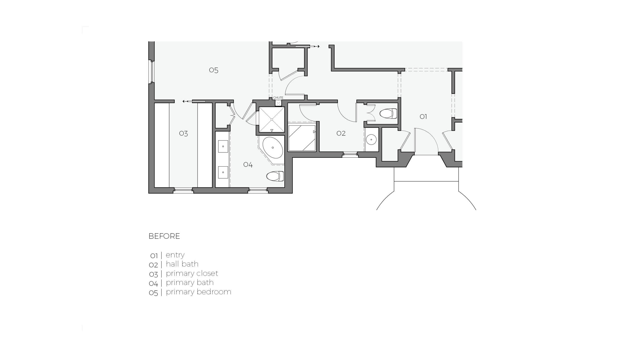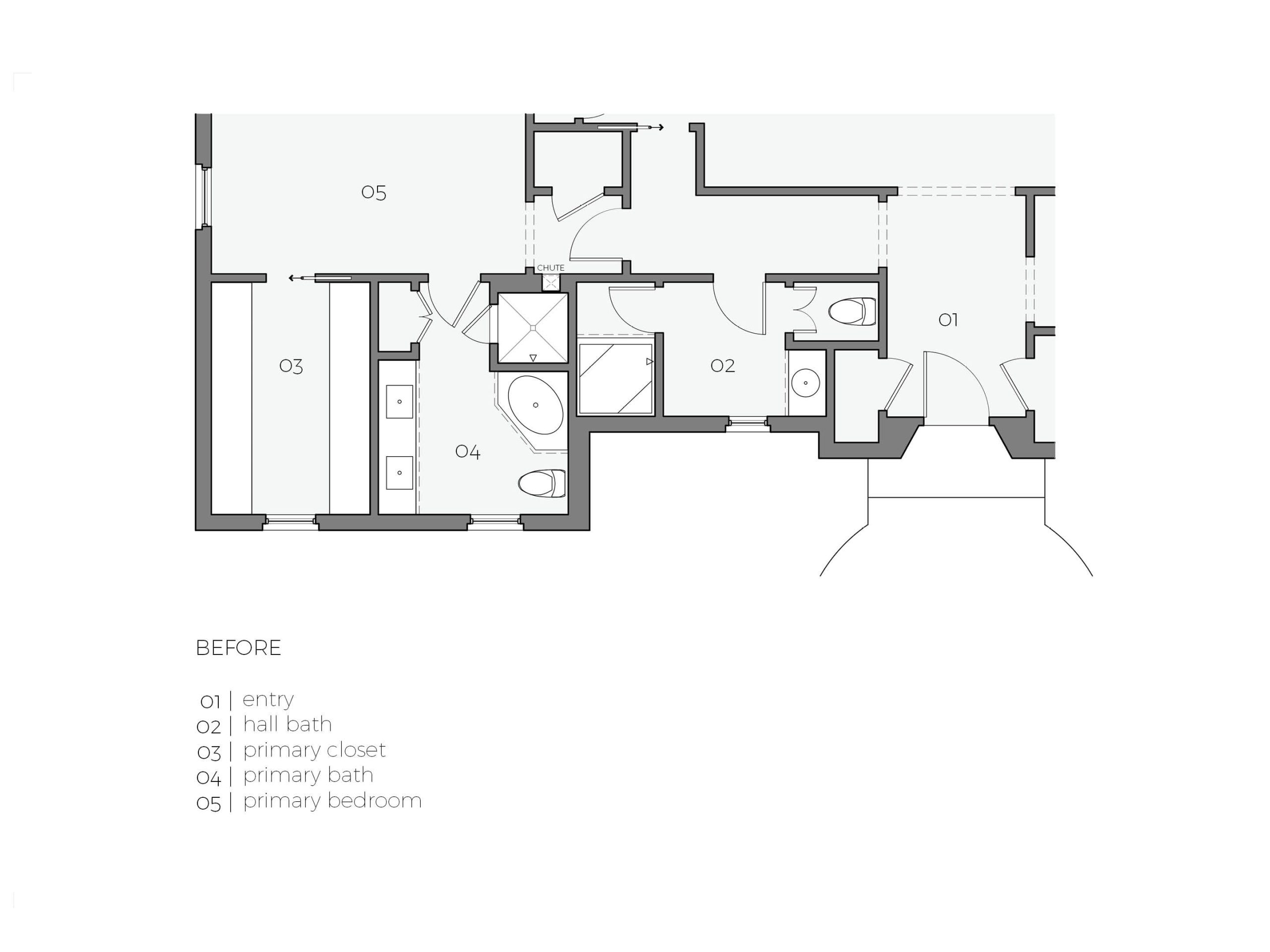 One of the biggest challenges of this renovation was improving the primary suite’s bathroom and closet layout by borrowing space from the oversized guest bathroom. The bath included an unnecessary bathtub and a cramped toilet alcove, while the primary suite’s bathroom felt small and disjointed. It featured a dark shower, an awkwardly shaped and undersized bathtub, and a toilet lacking privacy near a front-facing window. Additionally, poor access to natural light and outdated materials made the spaces feel closed-in and out of step with the rest of the home.