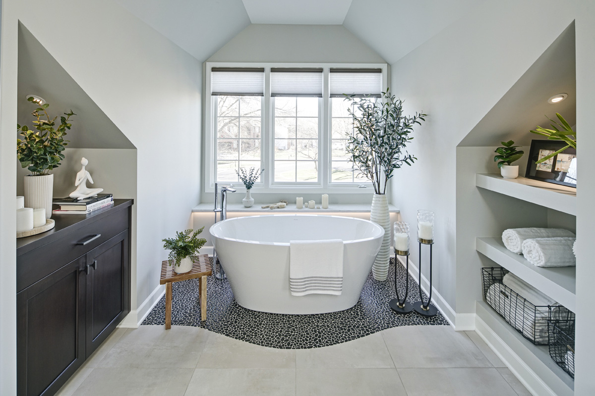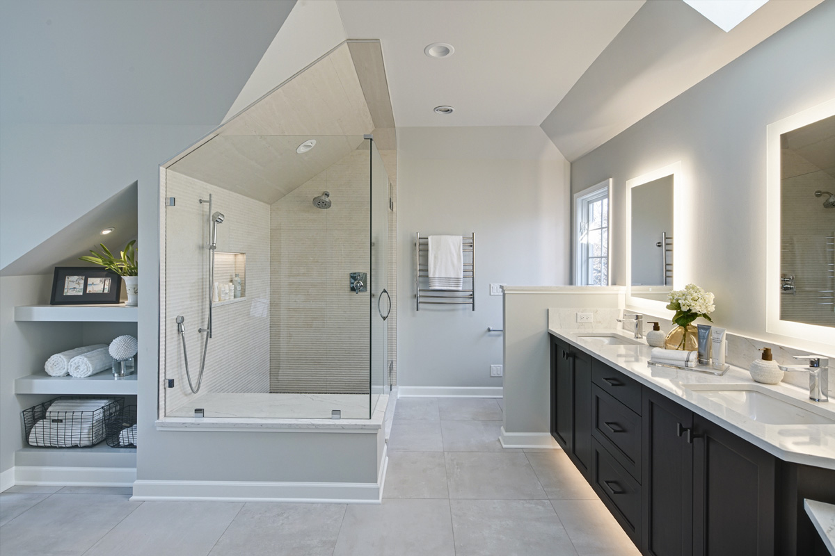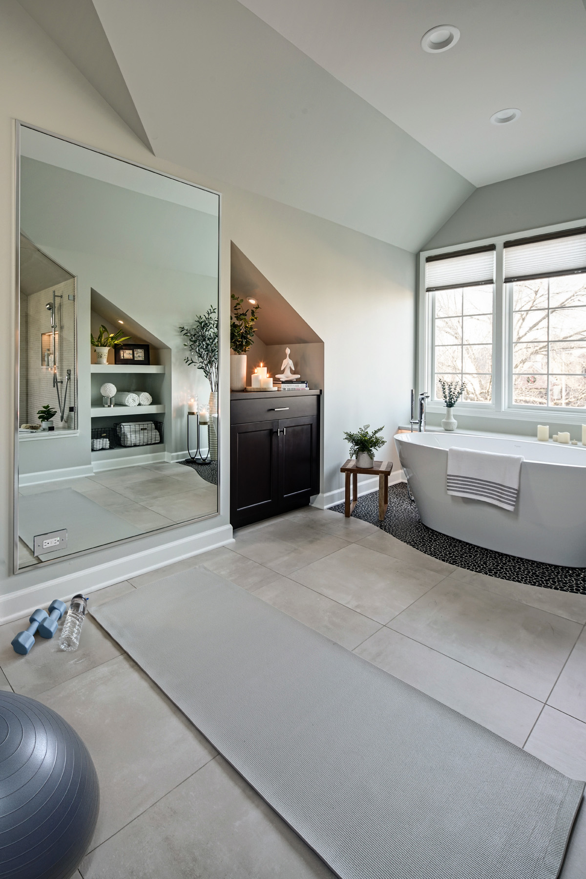 For this primary bathroom project, the homeowners wanted to transform their awkward, T-shaped bathroom into a functional, multi-purpose sanctuary with enough room for yoga and light free-weight exercises while maintaining the bathroom’s aesthetic and functionality.