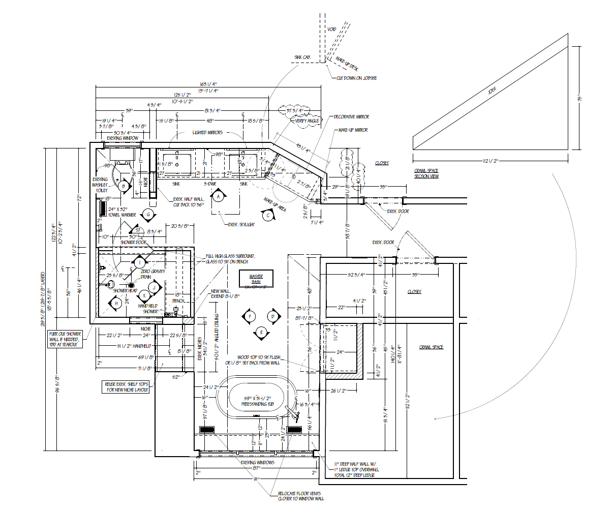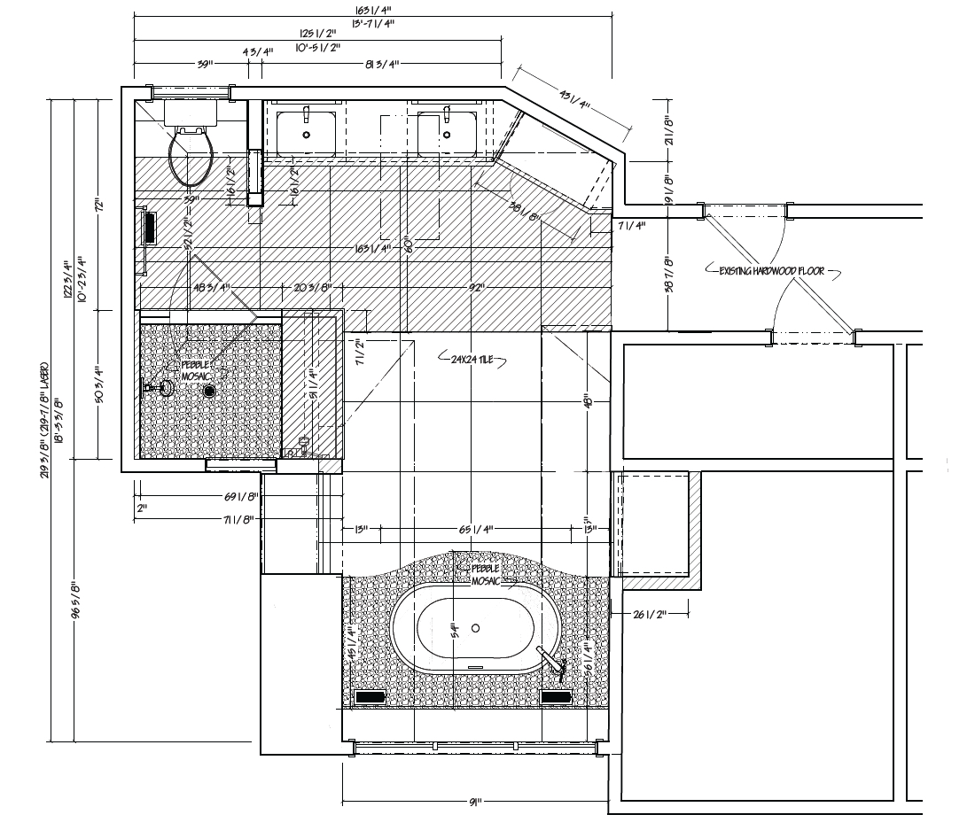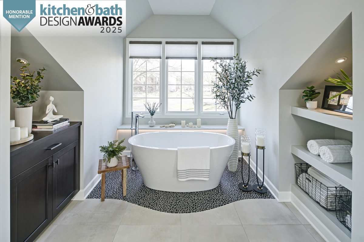 For this primary bathroom project, the homeowners wanted to transform their awkward, T-shaped bathroom into a functional, multi-purpose sanctuary with enough room for yoga and light free-weight exercises while maintaining the bathroom’s aesthetic and functionality.