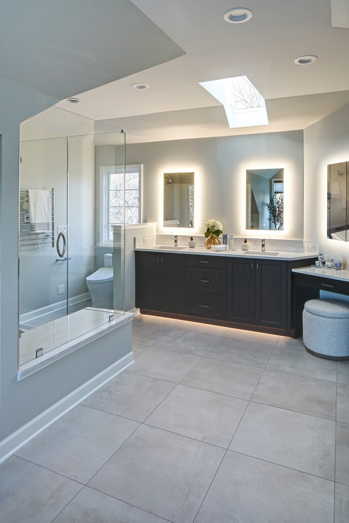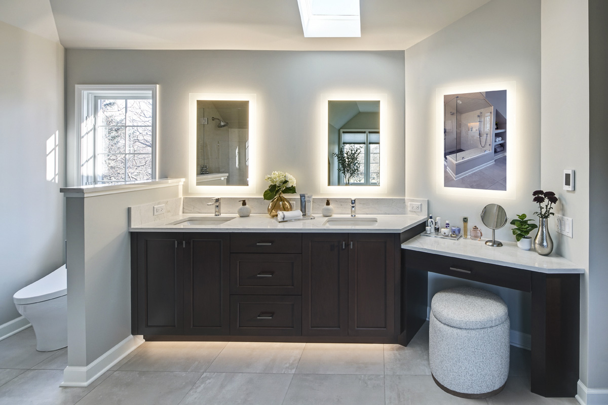 On the opposite wall, a vanity from Grabill Cabinets in Old Town with the deep Sedona finish adds contrast and drama. It is topped with Vicostone Tyrol polished quartz and includes a white Kohler sink and Delta Faucet Starlight Chrome faucet.