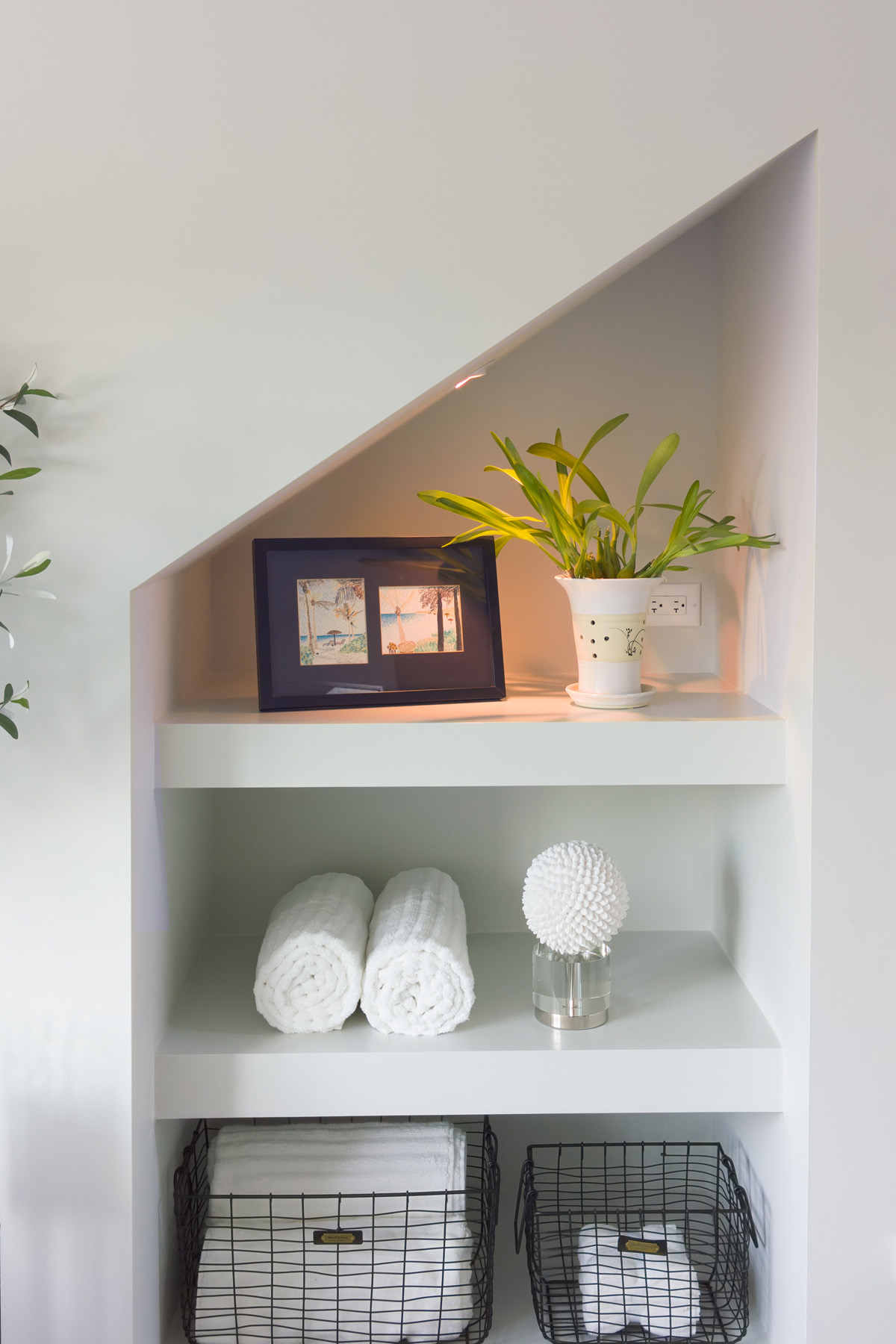 By removing a wall and replacing it with glass, Alicia Saso was able to transform the shower area into an open, airy retreat, allowing natural light to flow freely through the space. The walls are finished in Porcelanosa’s Old Beige tile, while the angled wall and ceiling sport Limestone Cream porcelain tile. Brizo polished chrome shower fittings complete the space.