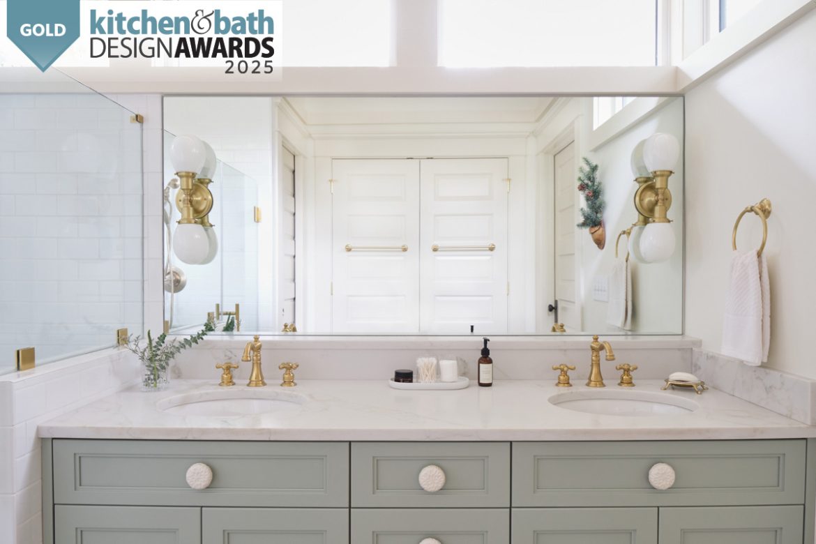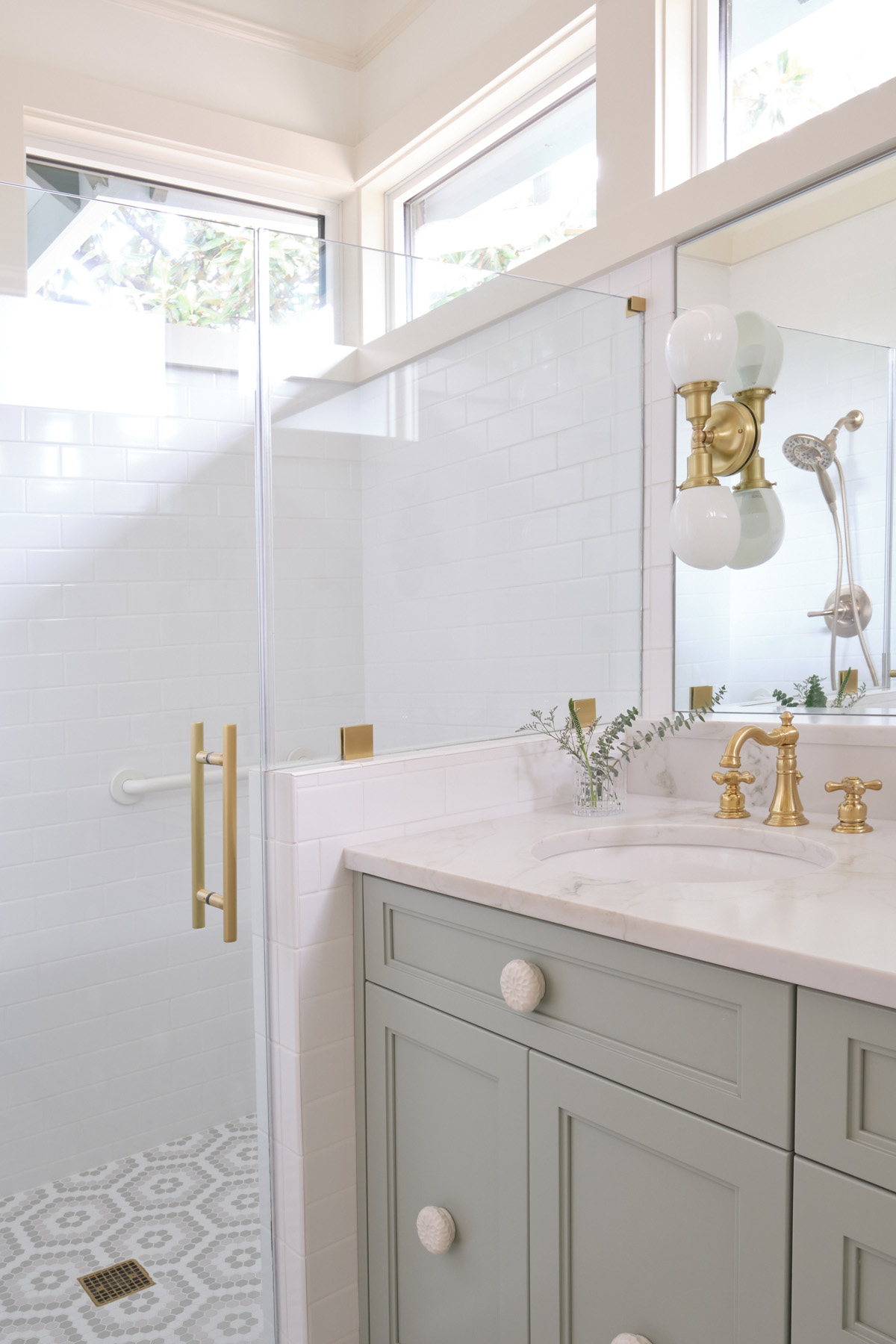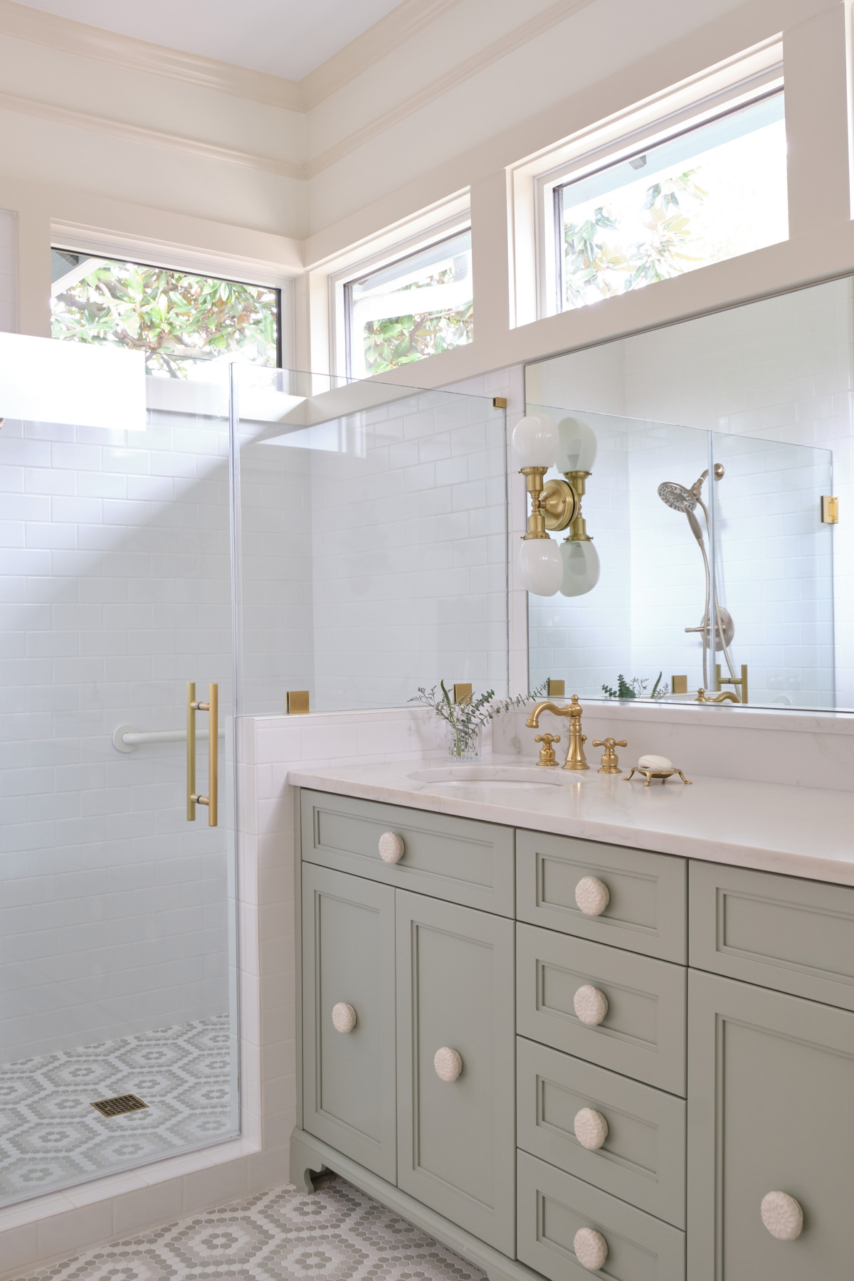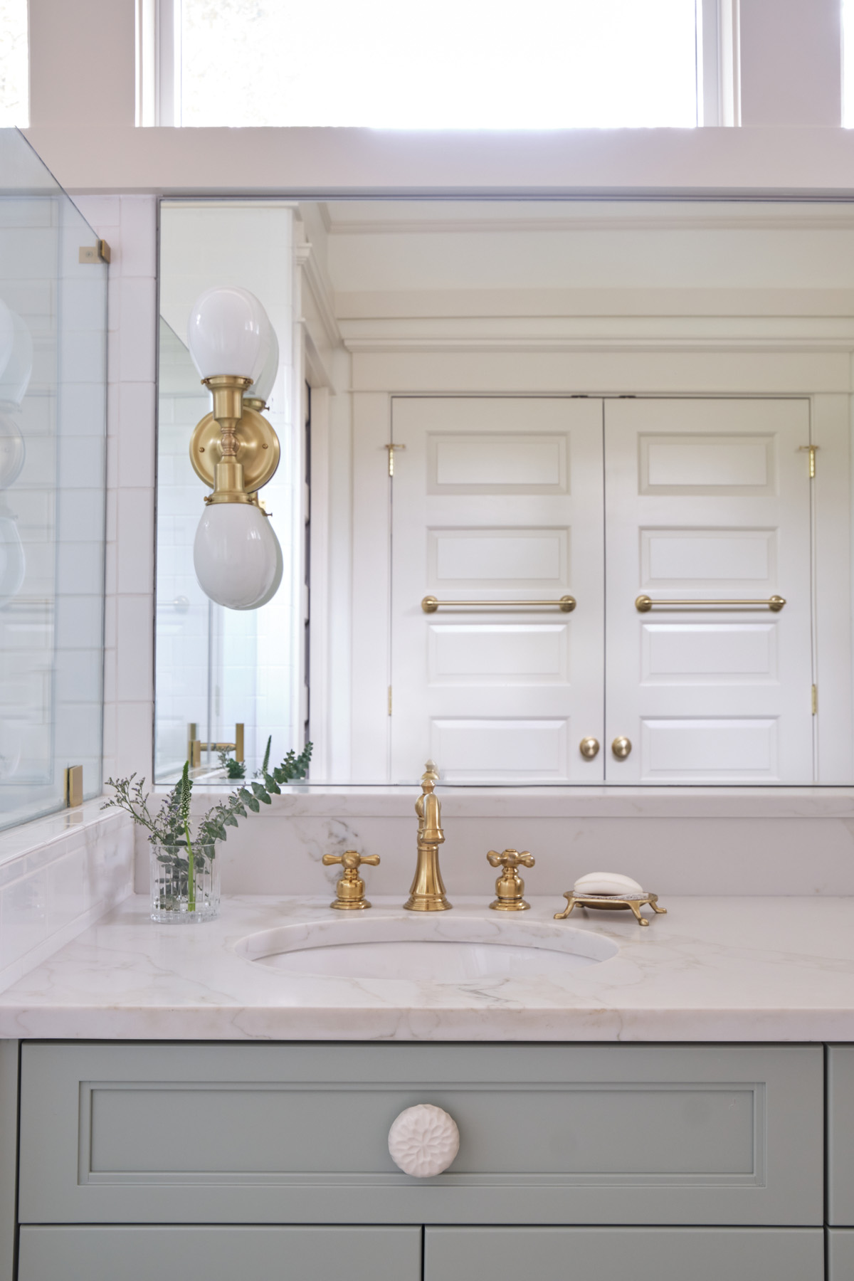 An extensive vanity with double sinks highlights one wall, finished in Sherwin-Williams Escape Gray, and is adorned with Anthropologie Alverta Ceramic Knobs in White, which truly act as jewelry in the space. A quartz countertop in honed Calcutta Michelangelo coordinates with the Sobu Canvas White tile in the shower and Sobu Morning Blend Matte Hex Mosaic on the floor. Brass fittings and accessories, Davis Double Sconces in Natural Brass and Domed Turtle Shade Opal, and Regency Hill Soft Gold White Glass Schoolhouse Ceiling Light finish the space.