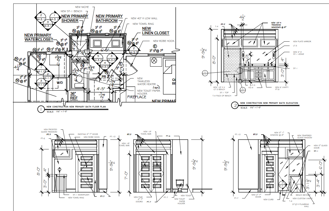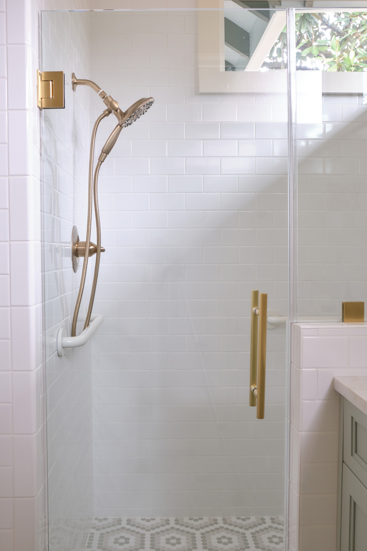 No space had to be stolen from the adjoining bedroom so it was able to stay essentially as it was. Using light finishes throughout and incorporating high windows allowed the space to feel airy and light filled. And though relatively compact for a primary bath, it is still well equipped for the homeowners to age in place.