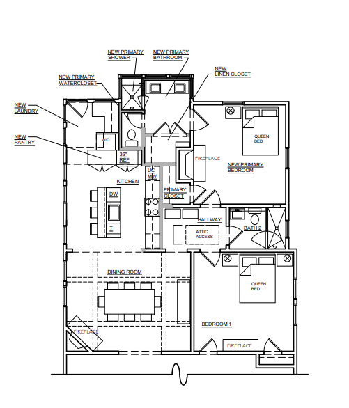 The homeowners were looking to add a second bathroom, a true primary suite, in the existing footprint of the home. By making use of an enclosed porch and modifying the layout to take advantage of hallways and walkways that were no longer useful, Patterson was able to stay within the footprint.