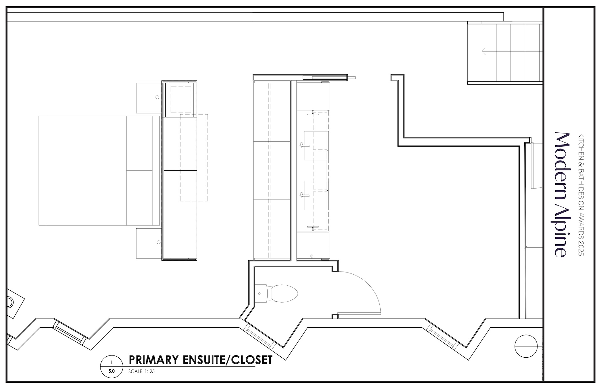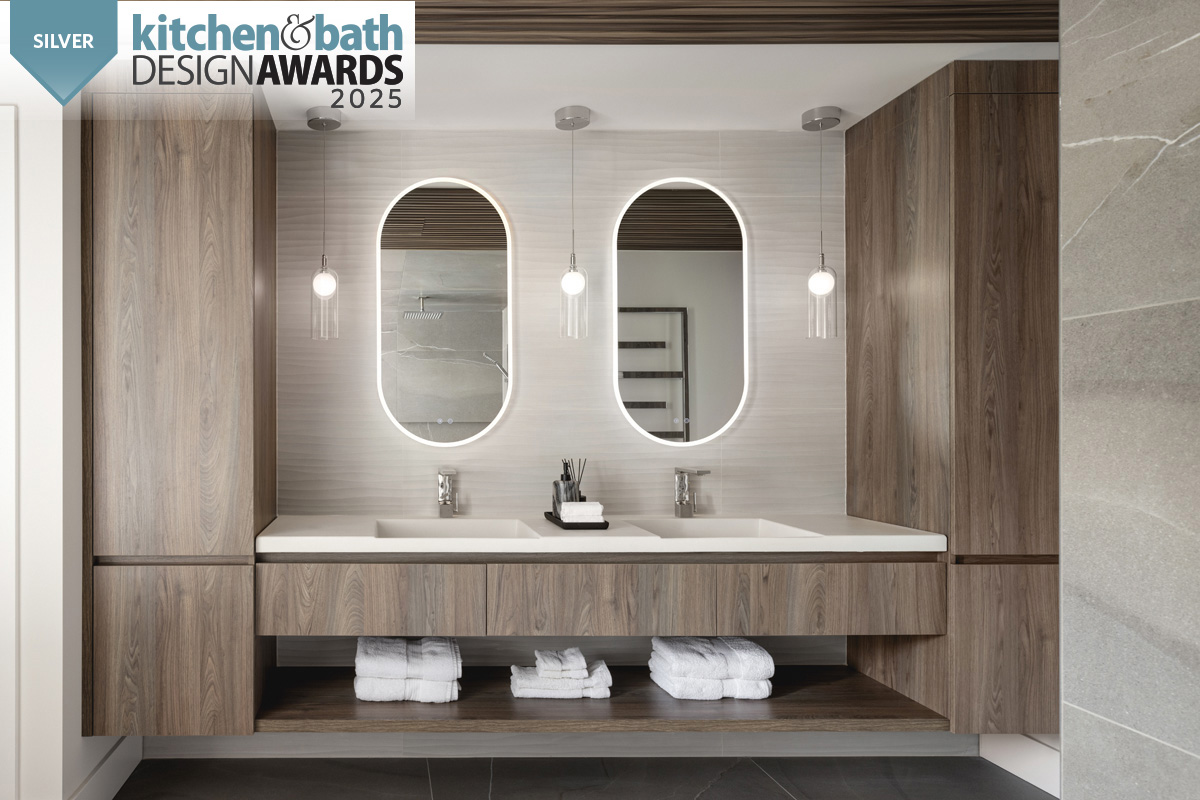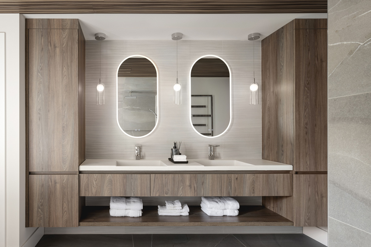 This ensuite was designed as a serene, modern mountain spa, grounded in warm natural tones. Flat-cut walnut melamine was used for all Empire Kitchen & Bath custom cabinetry, offering movement and tone reminiscent of the kitchen’s real walnut millwork while supporting a cohesive material narrative throughout the home. A floating double vanity with open shelf storage created an airy visual while maintaining functionality. Vertical cabinetry towers flank the vanity, offering symmetry and concealed storage. Touch-activated, backlit mirrors bring a subtle layer of technology and ambient light without disrupting the clean architecture.