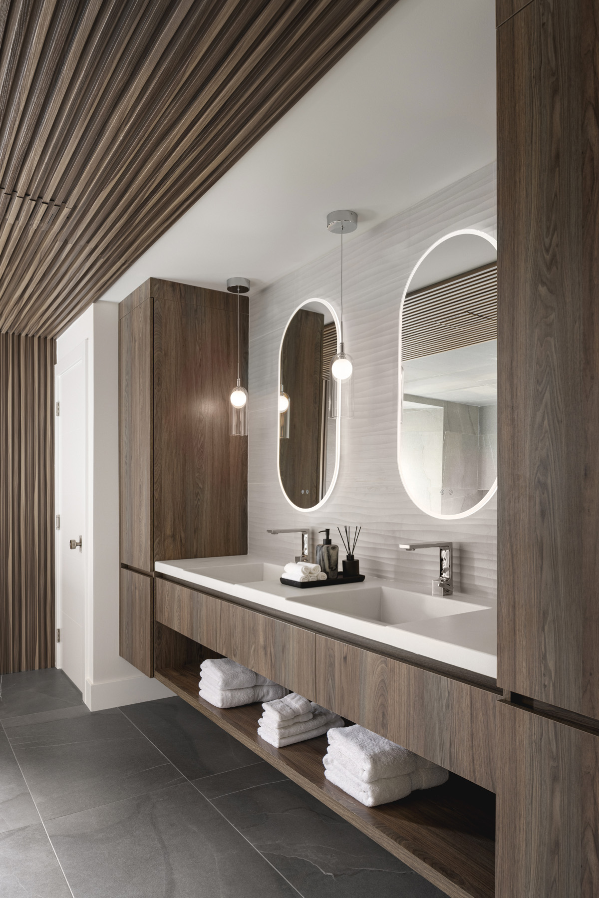One of the defining design moves was the continuation of wood slats across the wall – a gesture that integrates architecture and millwork while enhancing the spa-like atmosphere. The use of large-format natural stone introduces soft texture, reinforcing the space’s warm minimalism.