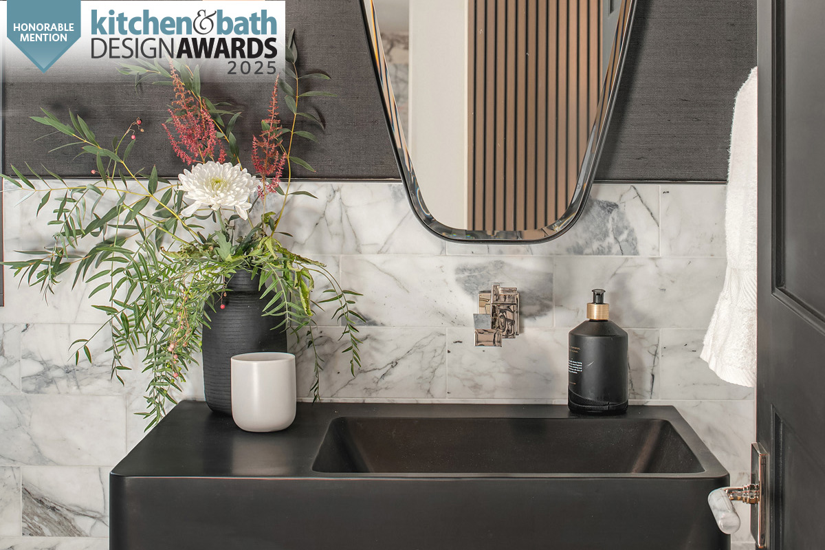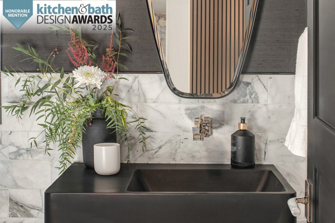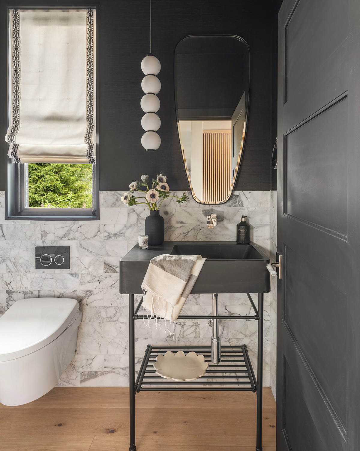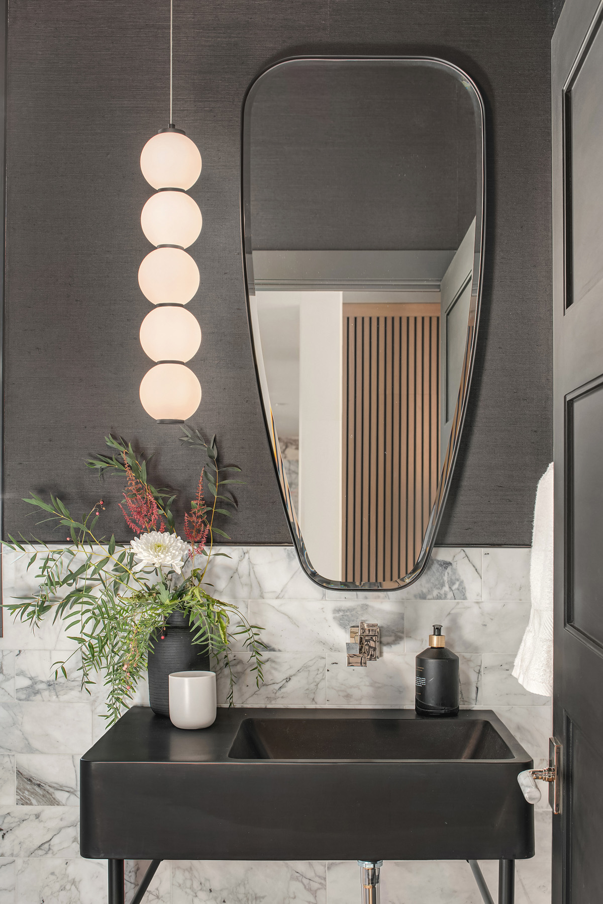 This chic and moody powder bath delivers a precision punch in a mere 35 square feet. For Tristan Gary, in collaboration with Jinny Park Architecture, delivering a curated feel within the monochrome palette was paramount.