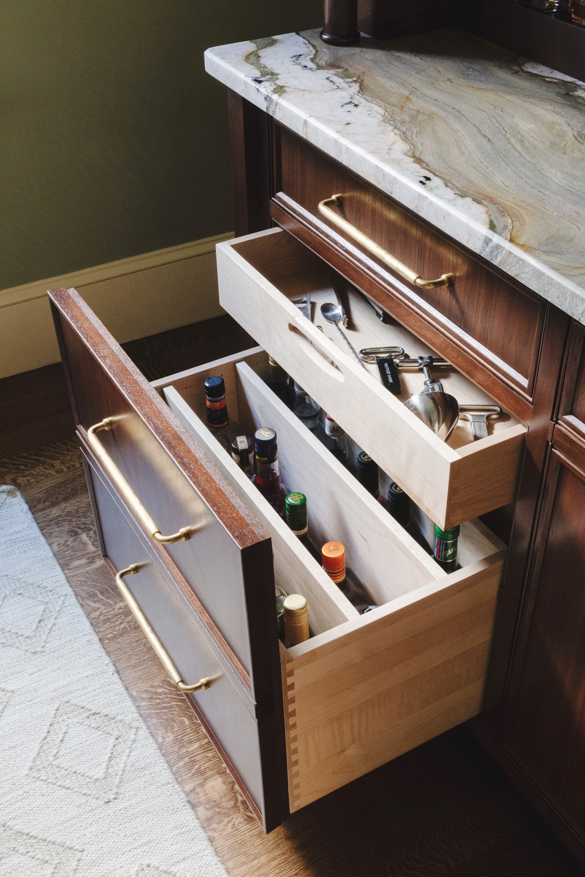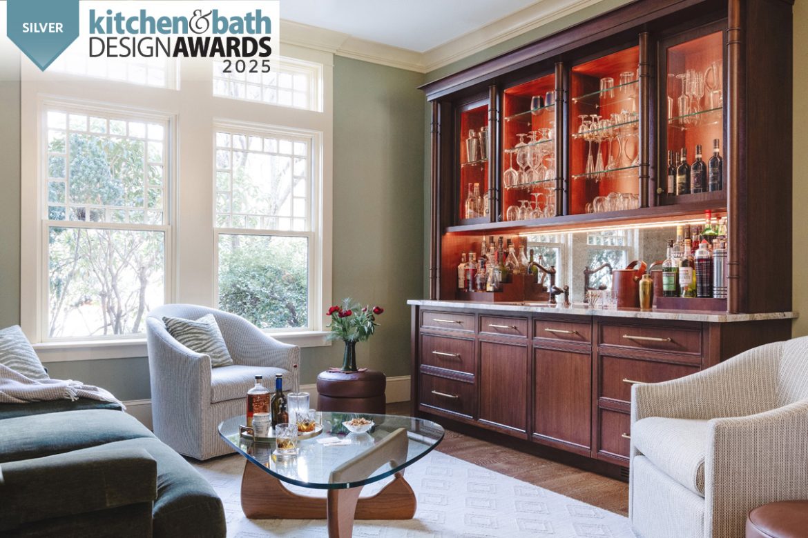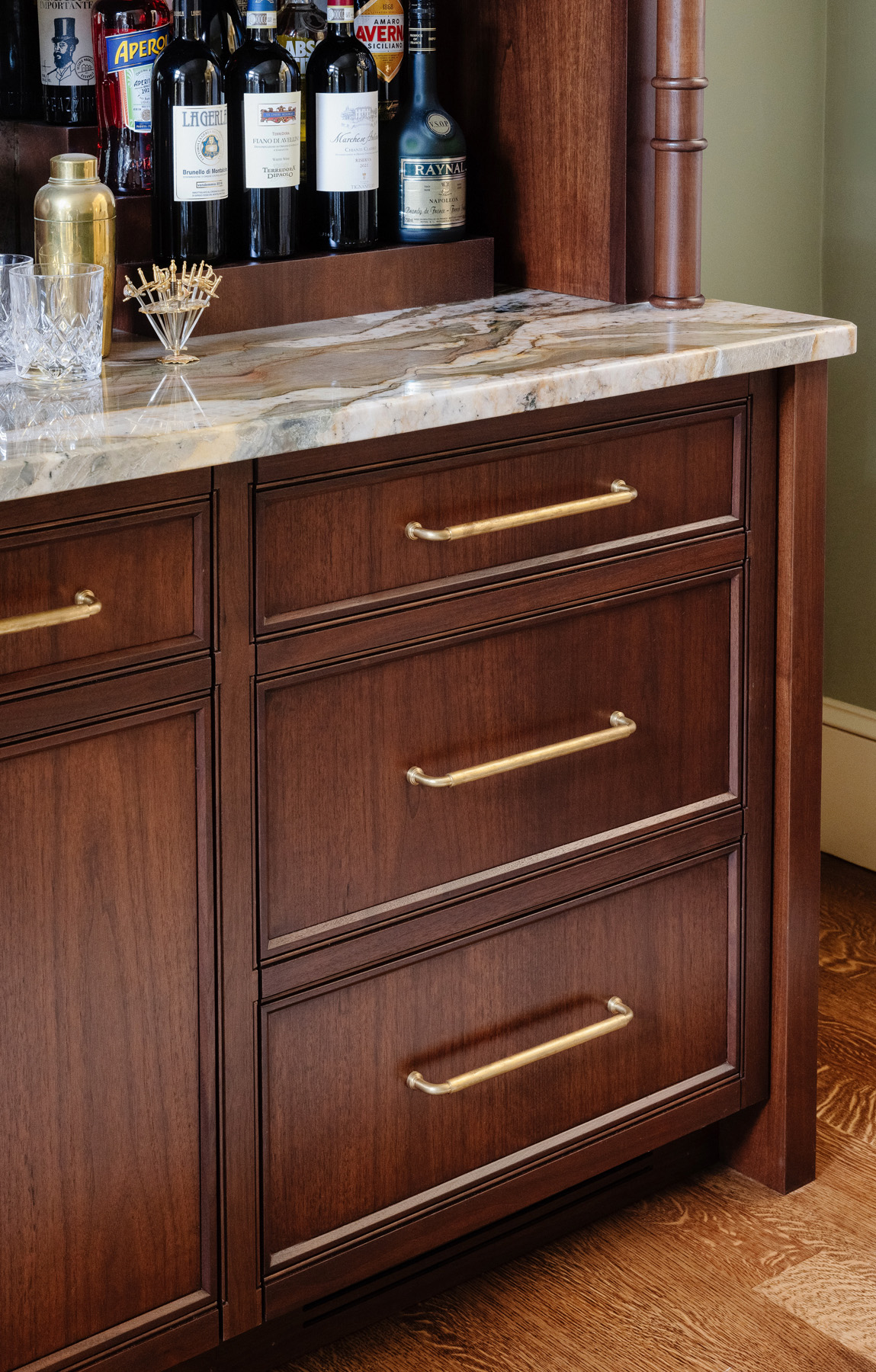 The custom bar structure appears as a freestanding furniture piece in dark walnut with a transitional design and dramatic, built-in lighting and aged brass hardware. It includes ample display shelving, an antique mirror backsplash and marble countertop, as well as cleanup features that include an 18″ paneled Bosch dishwasher, brass and bronze sink and faucet. A 24″ Sub-Zero paneled undercounter beverage refrigerator is also featured.