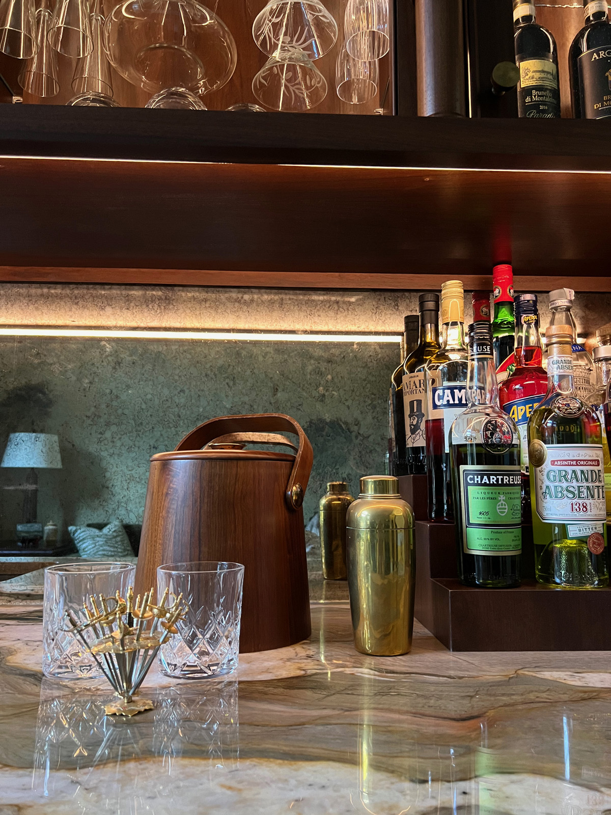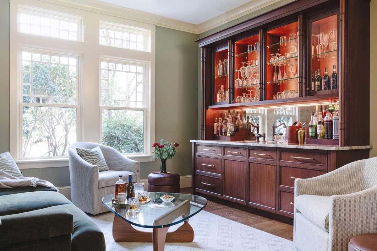 The goal for this project for Cassia Wyner was to transform an existing music room into a sophisticated, dual-purpose space that serves as both a bar and a comfortable family sitting room. The design aimed to create a versatile environment that seamlessly transitions between intimate gatherings and everyday family relaxation.