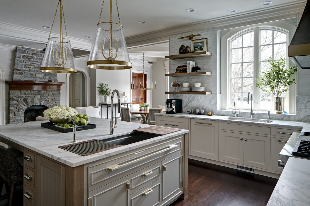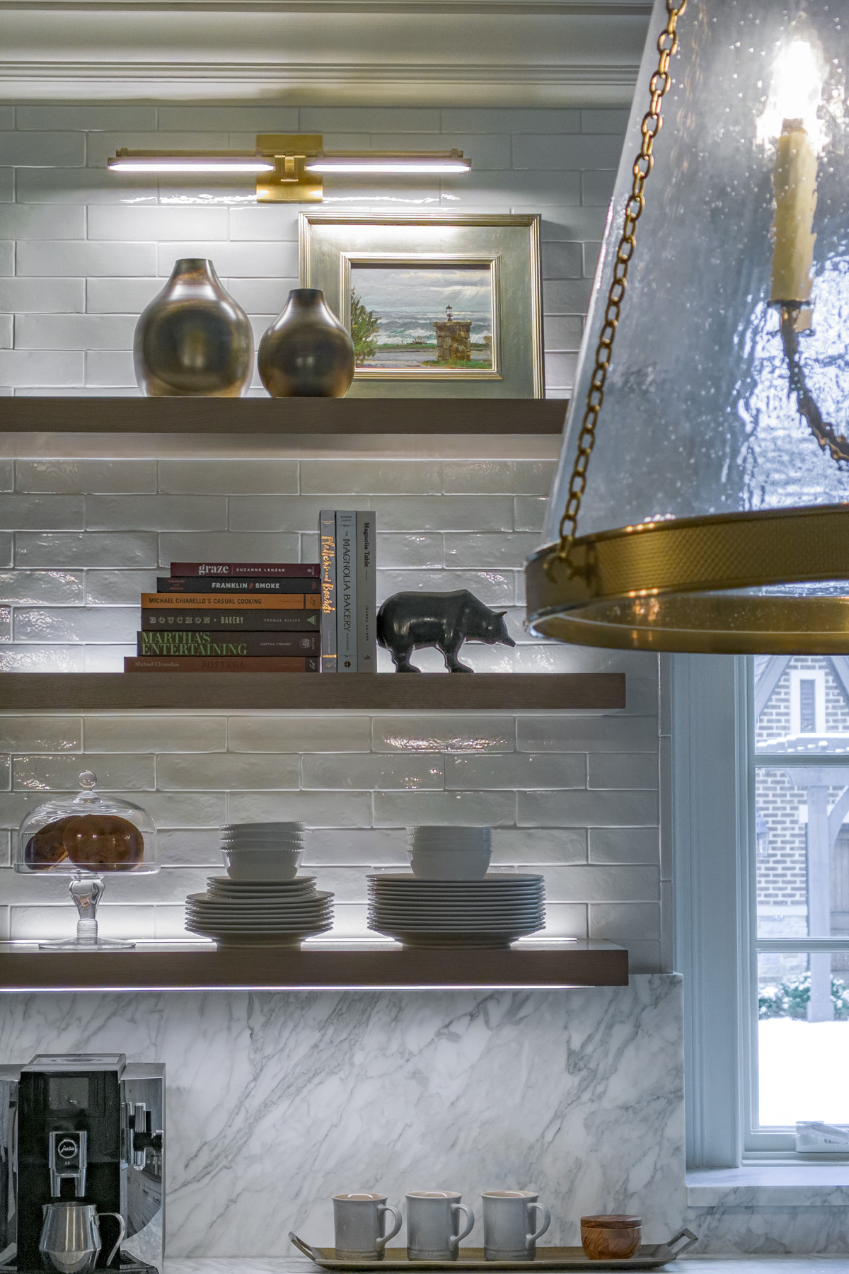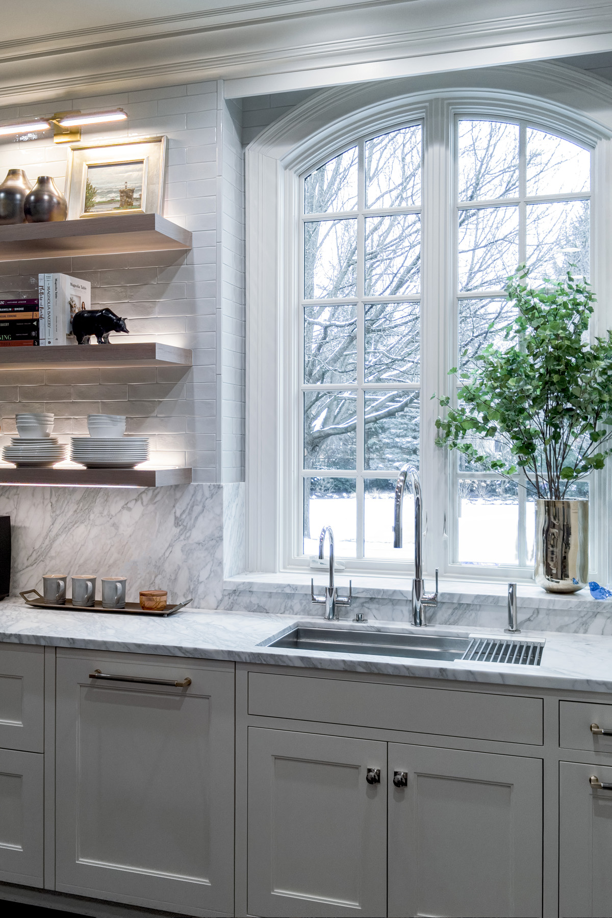 A wall cabinet near the window was removed, allowing for the addition of natural light. It was replaced with lighted open shelves that provide storage but offer a more airy feel. A sink with both a faucet and filtered water faucet sit below the window. Custom cabinets along this and the perpendicular wall feature the Hampton door style in maple with a white finish and feature accessories such as organization for mail and phone-charging drawers. Perimeter countertops are Diresco Supreme White quartz, while the backsplash above the Wolf cooktop is marble.