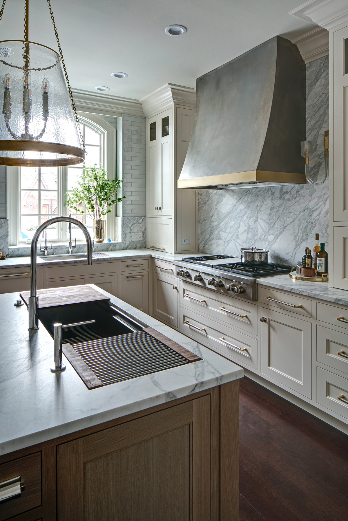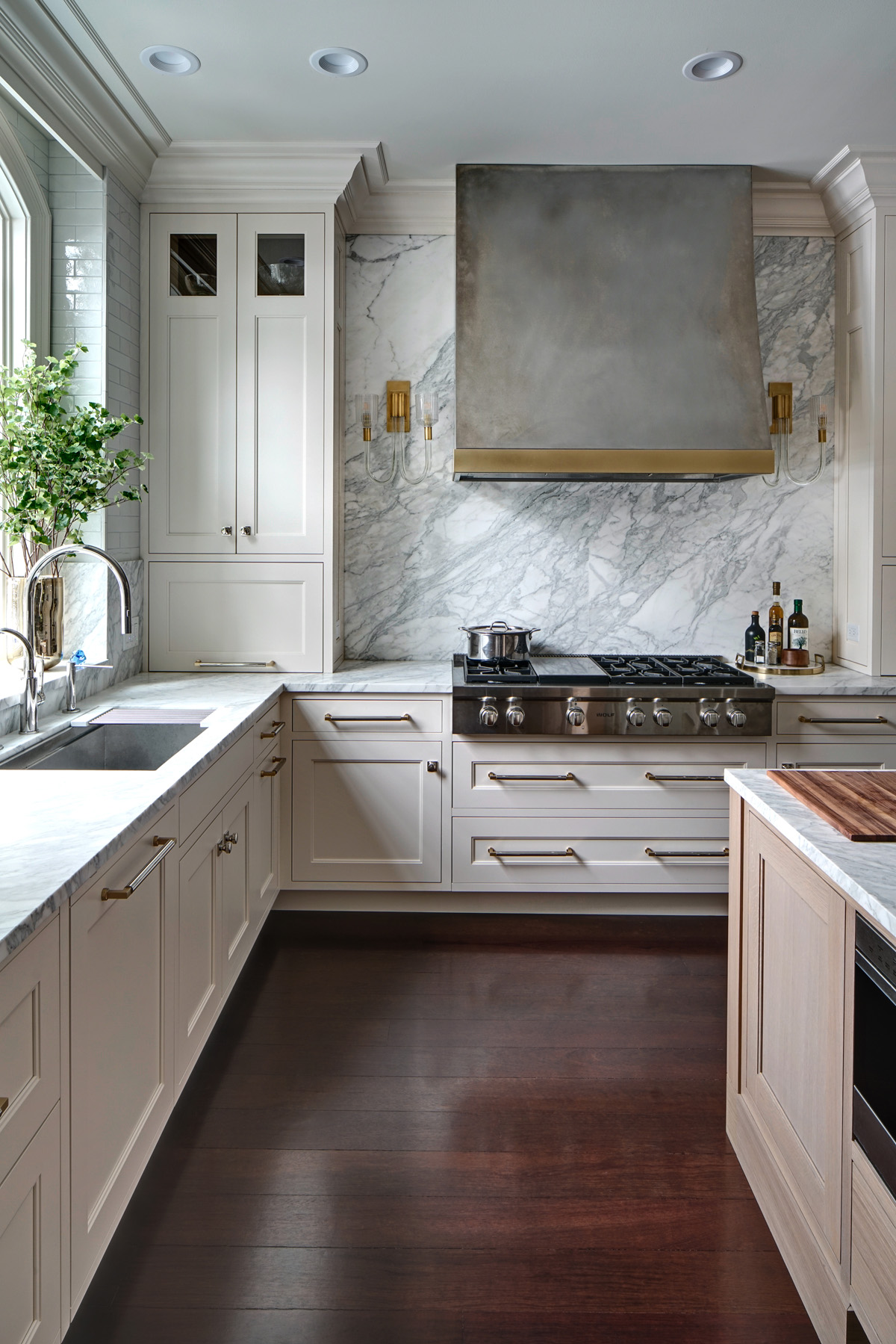 Gold touches on the hardware, lighting and range hood tie the space together.