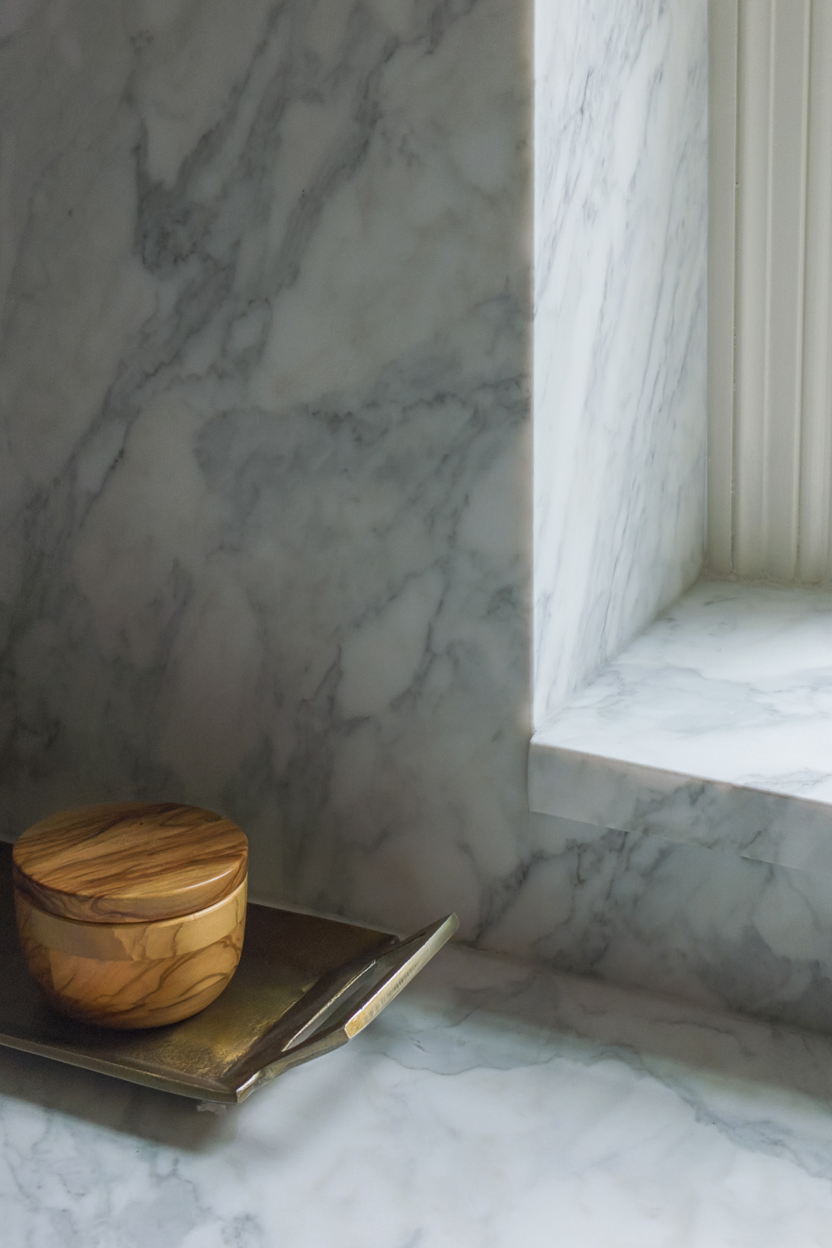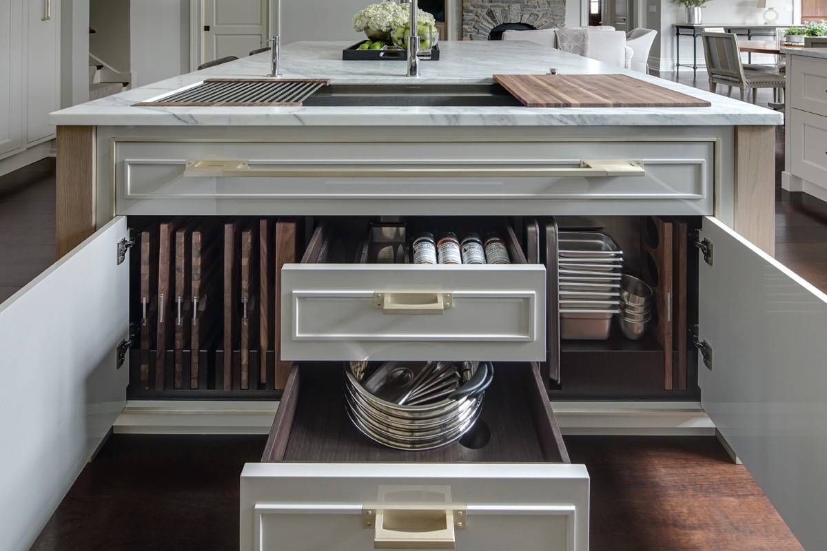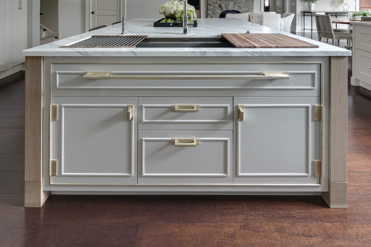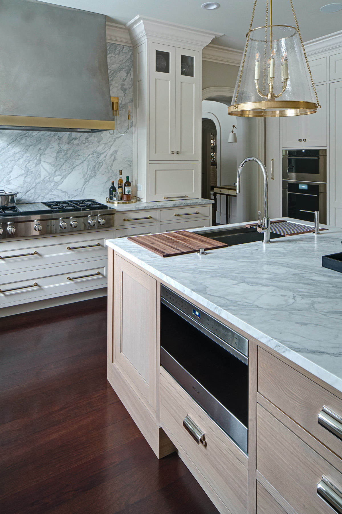 A spacious island provides seating for a more engaging atmosphere when entertaining, as well as ample prep space. Included here is a Dresser and Workstation from The Galley, which provides a workspace as well as storage for all of the sink’s accessories. It is paired with custom cabinetry with the Hampton door style in walnut, finished in Flatiron Gray. Sitting on top is a slab of Calacatta Gold marble.