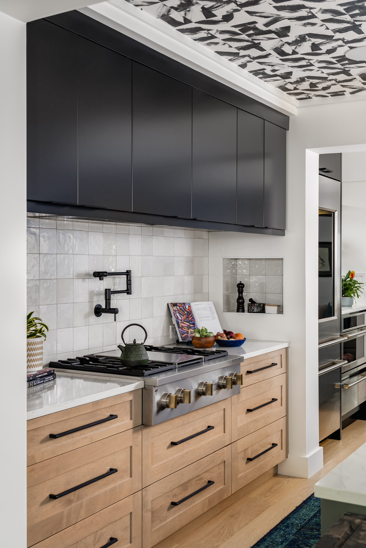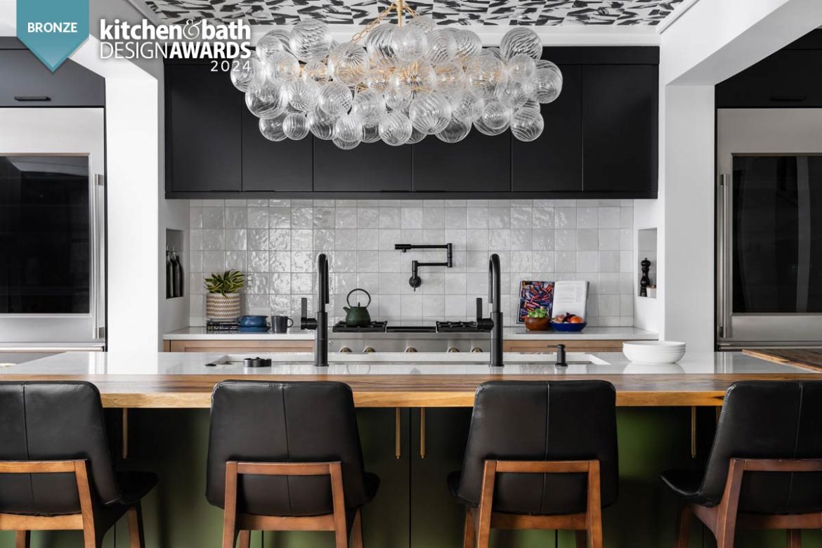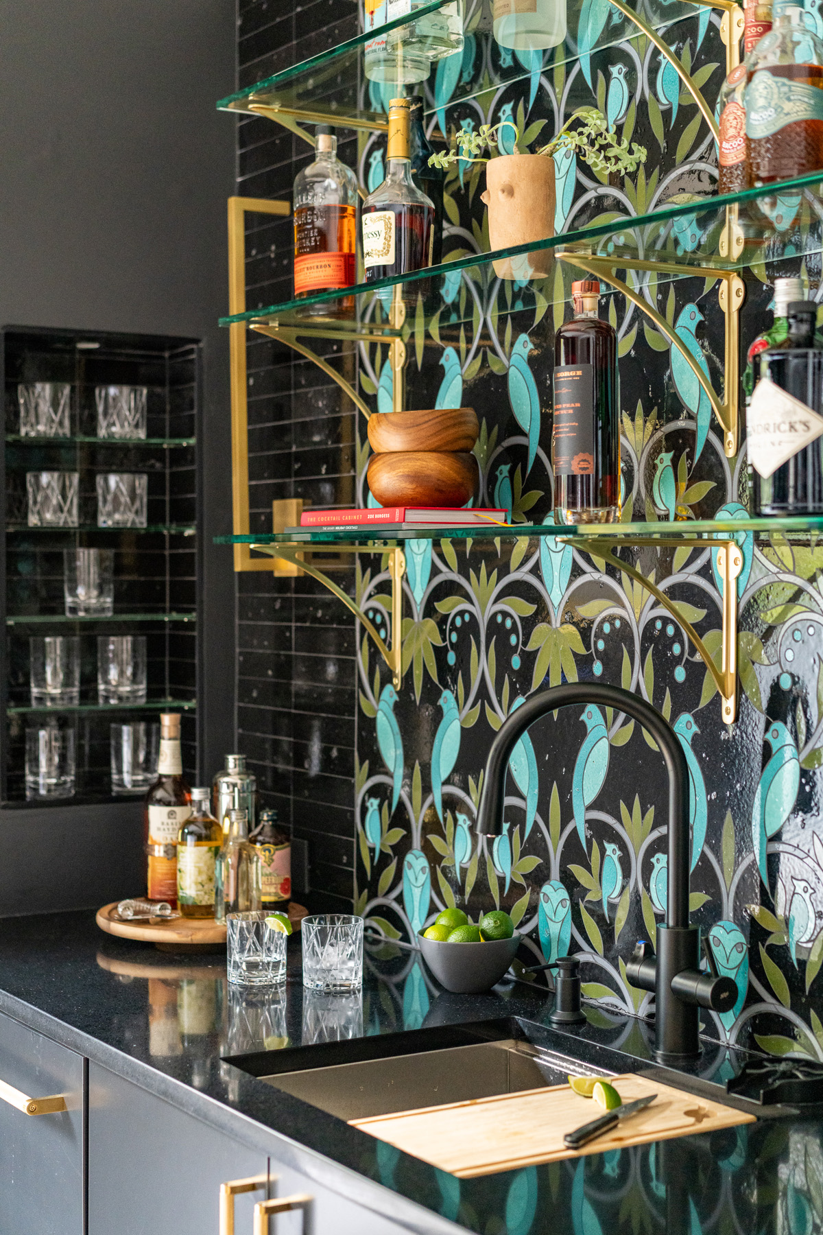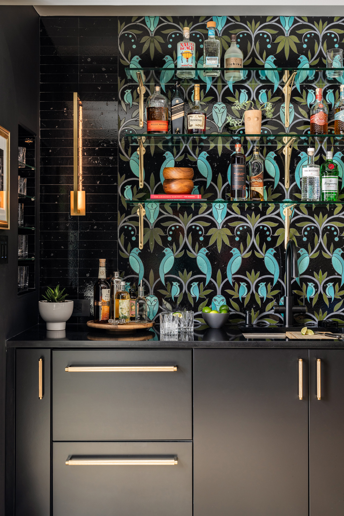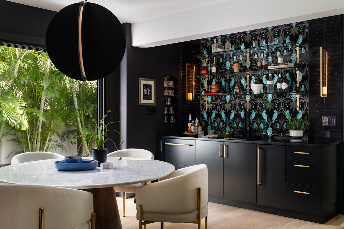 Across from the kitchen, the bar is a statement area that showcases New Ravenna’s Byrd vivid owl and bird tile. Black cabinetry is topped with Cambria black quartz and includes two Monogram 24″ refrigerator drawers.