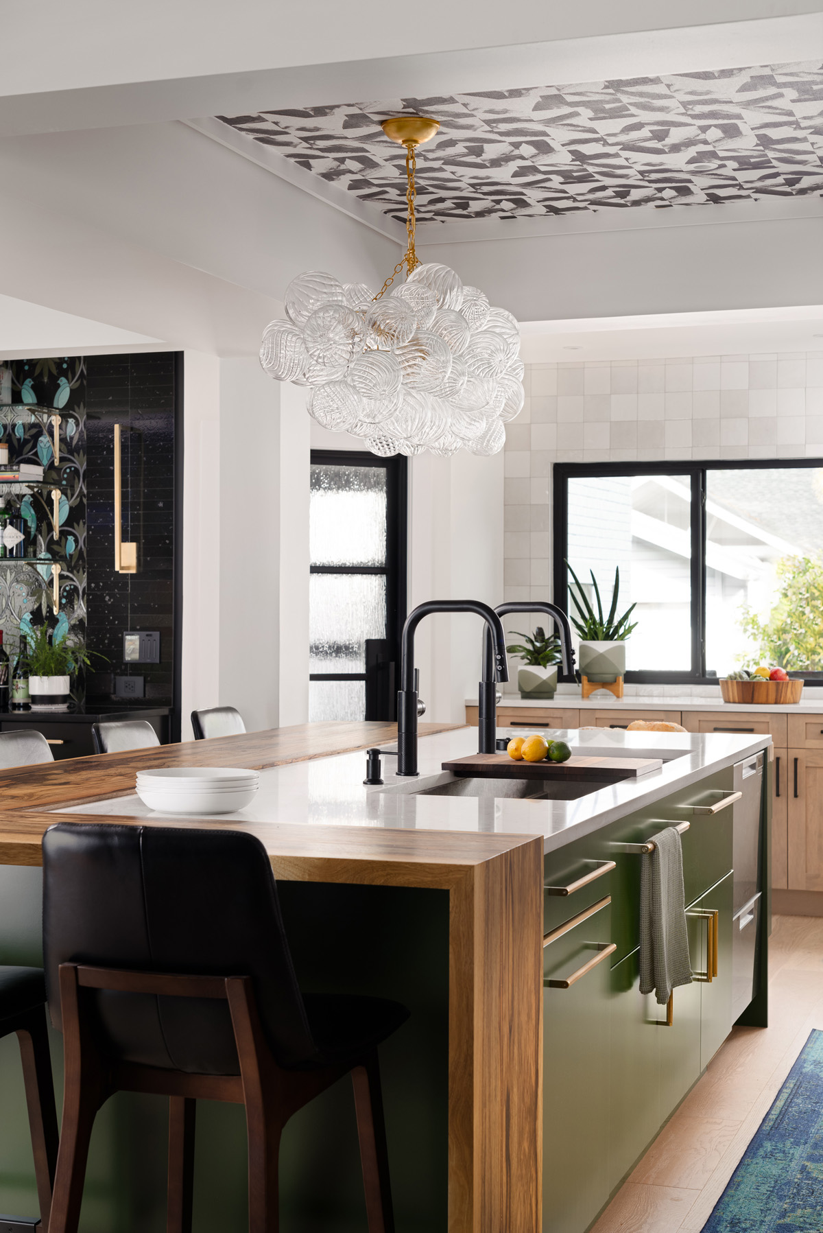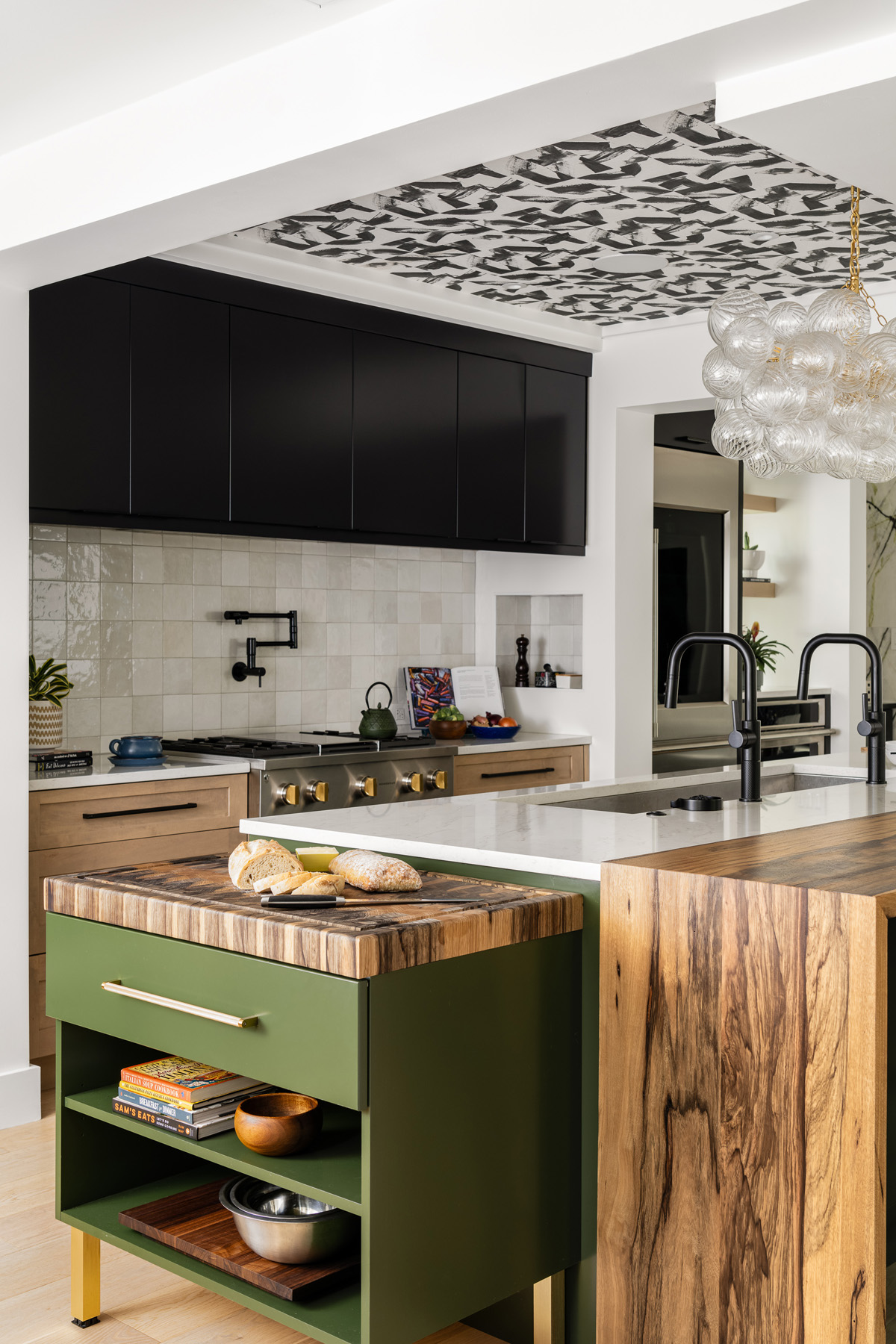 Cabinets from Holiday Kitchens are included in three finishes: Black paint for the uppers, Maple Nutmeg for the lowers and a custom green for the island. Cabinet pulls are Amwell from Top Knobs.