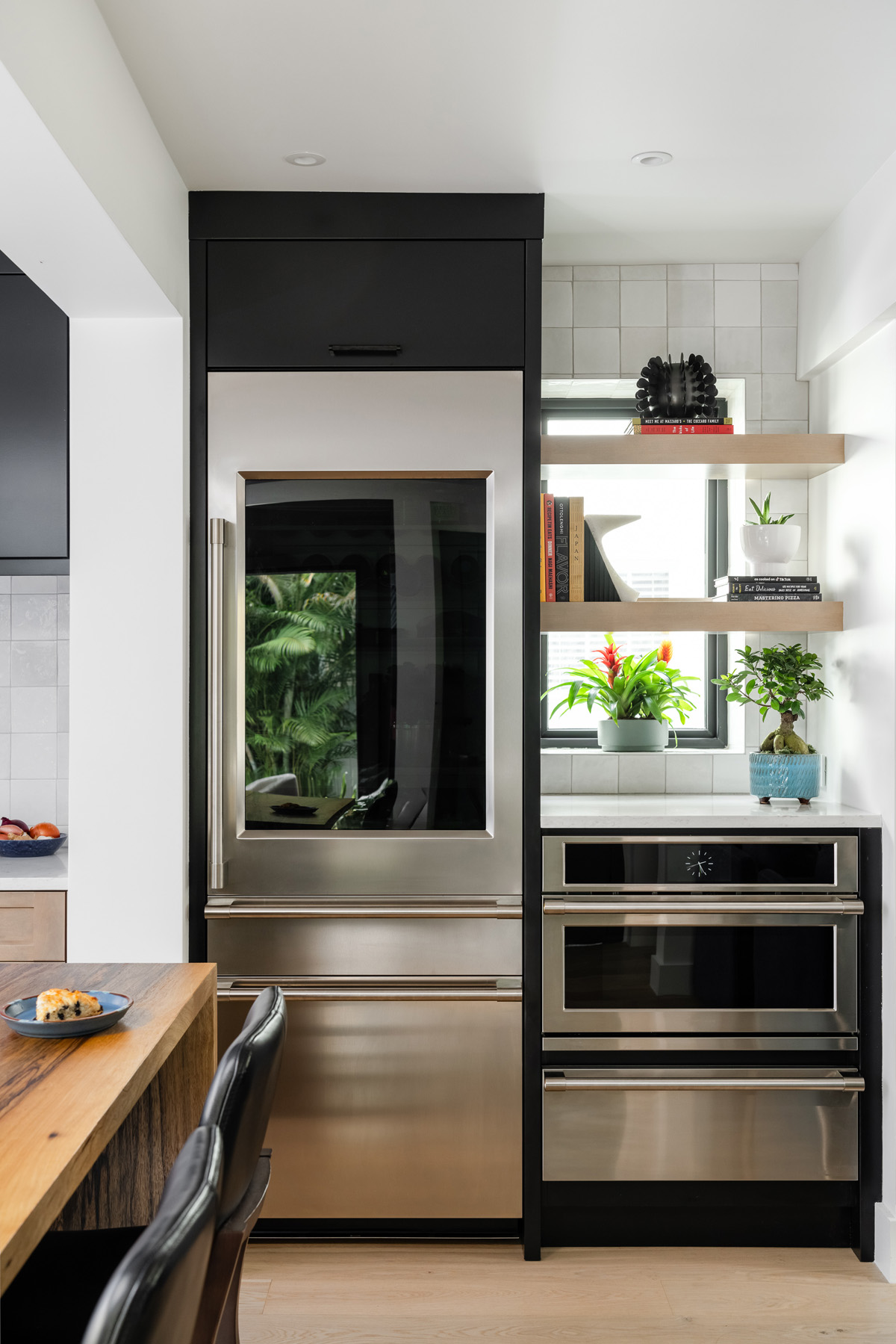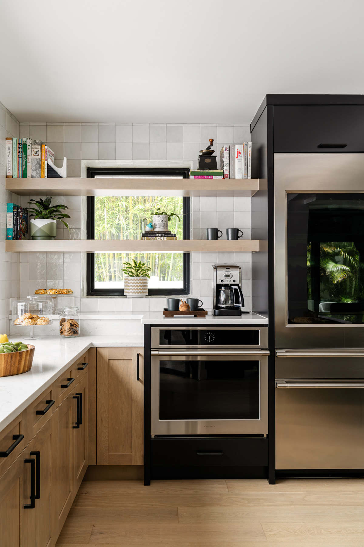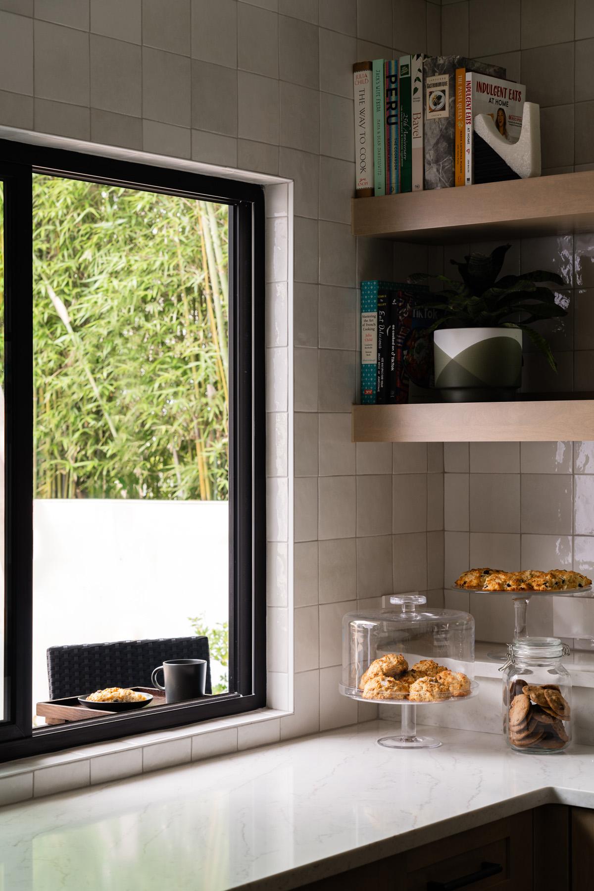 A large window at the back of the house includes an area for baking, complete with a Monogram single wall oven. Floating shelves across the windows hold cookbooks, dishes and plants.