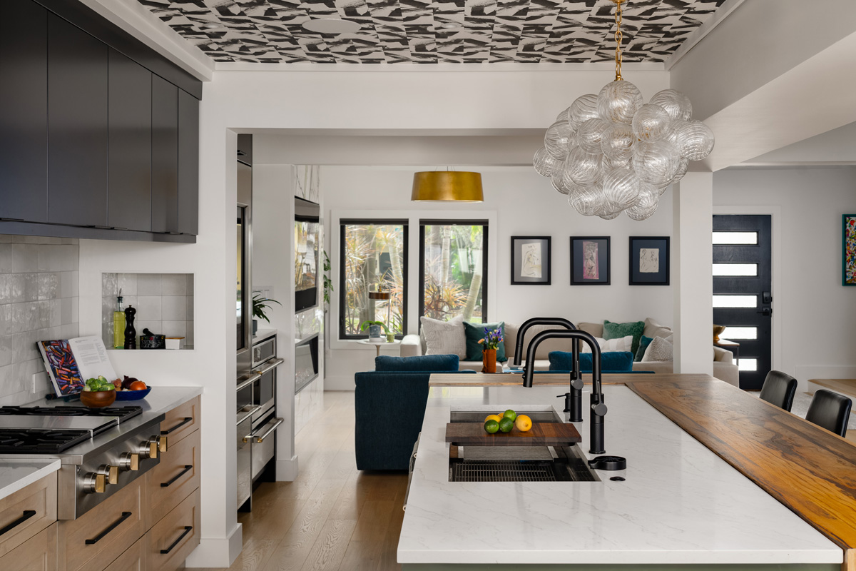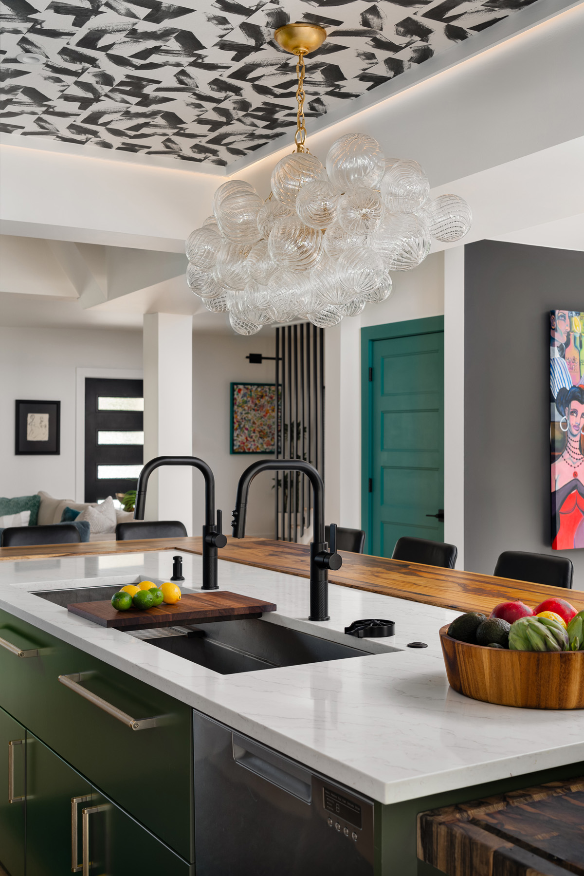 The island acts as a large workstation, with a nearby butcher block top for prepping foods. A large workstation sink is placed near the Fisher & Paykel dishwasher drawers. Countertops here include Pompeii Volaza and Custom Wood Black Limba.