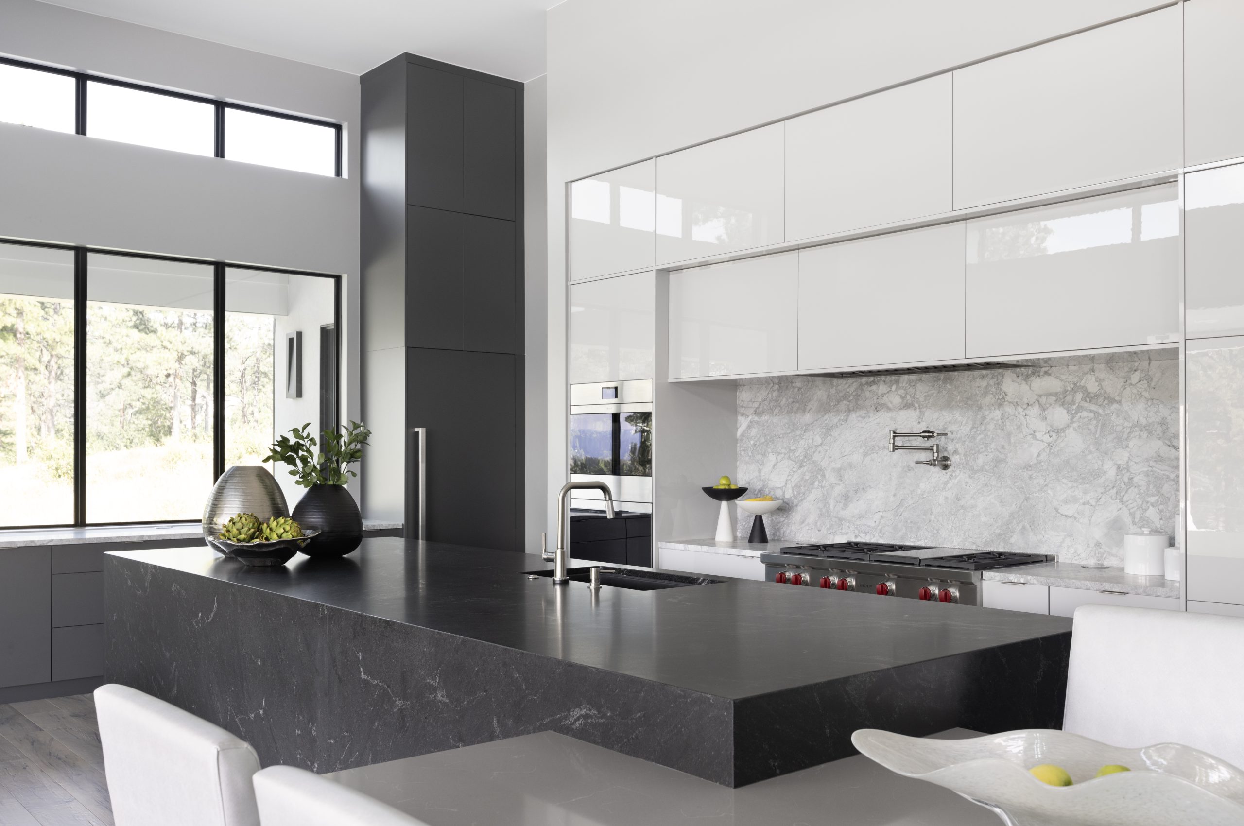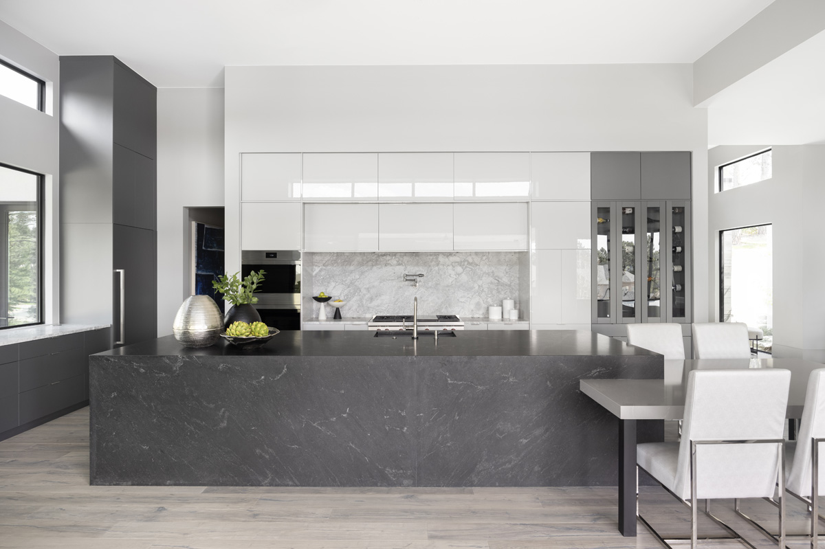 At its core is an island wrapped with sleek, marble-look gray quartz from PentalQuartz. A thoughtful integration of features includes a Franke stainless steel sink accented with a Brizo Litze faucet. Additionally, a built-in table inset on one end of the island invites family and friends to gather around.