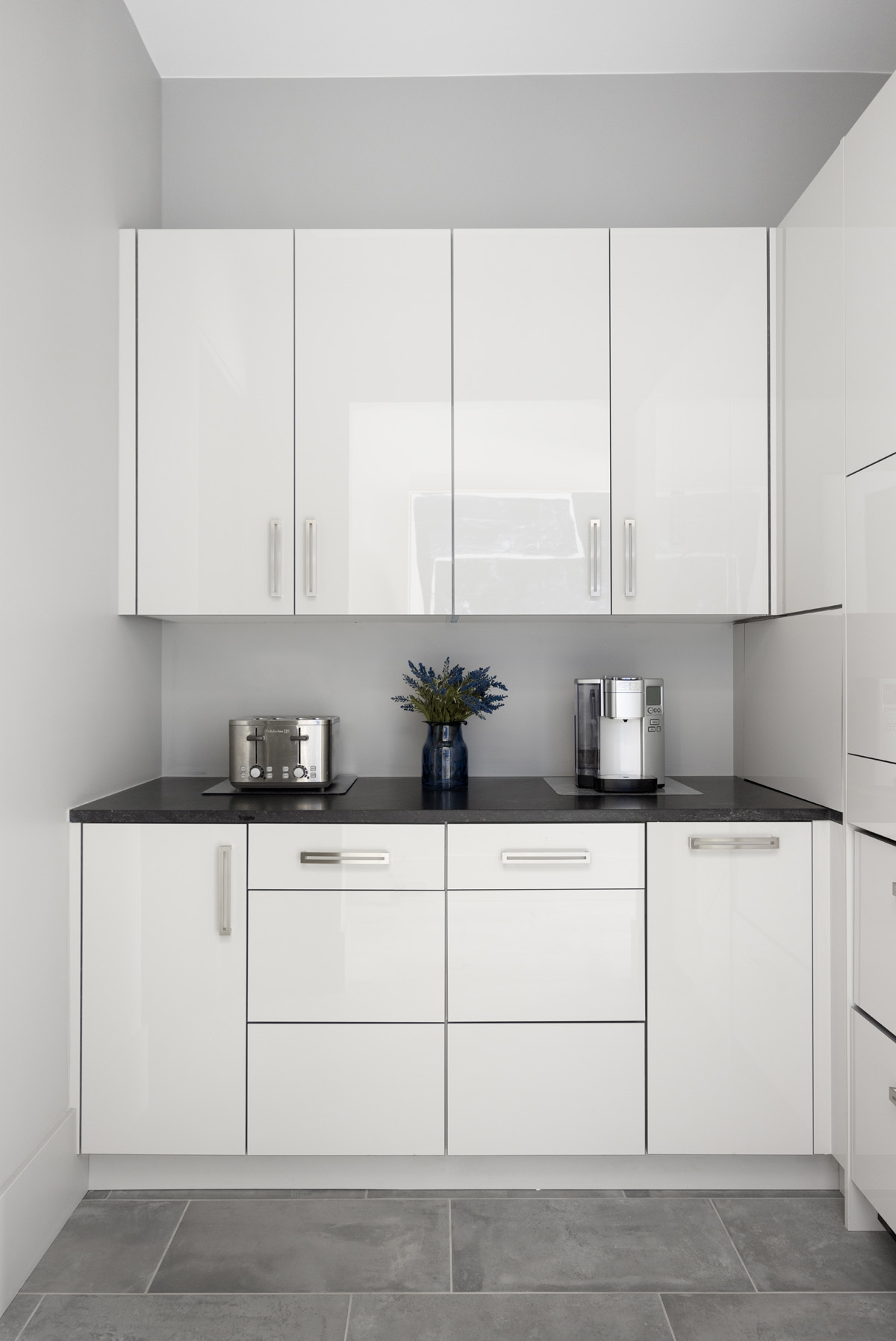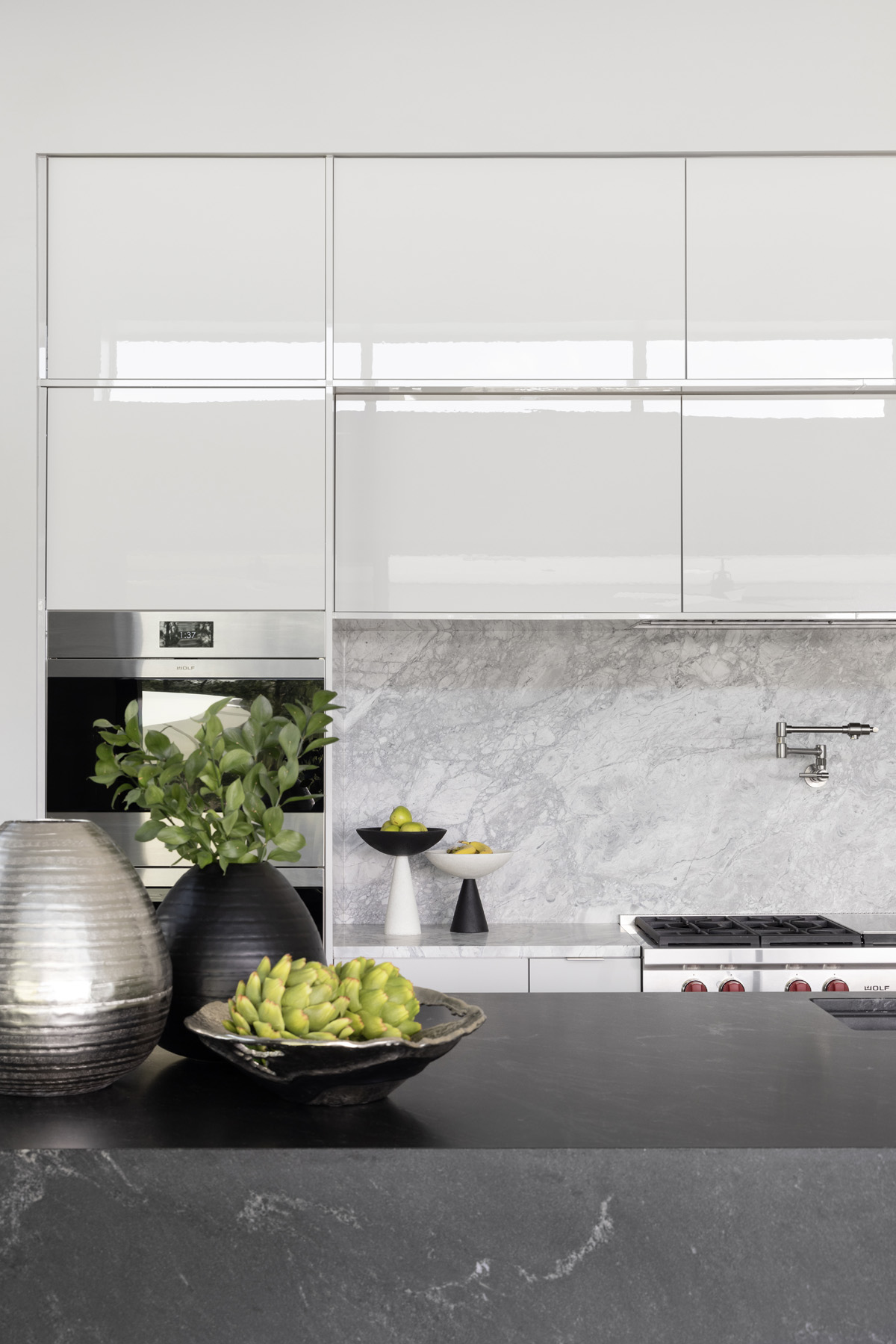The kitchen’s perimeter is equally well-appointed, with expansive windows that illuminate the space with a warm glow, ample counter space and state-of-the-art appliances that combine to make cooking a pleasure. Paneled appliances, including Sub-Zero refrigerator drawers, a Sub-Zero 30″ column refrigerator, a Sub-Zero 30″ column freezer and a Cove dishwasher, integrate seamlessly with the ultra-matte and high-lacquer slab cabinetry from Primary Kitchen, which includes cleverly designed storage solutions that keep clutter at bay. The cabinetry’s gray and white hues complement the slab-style quartz backsplash, which is a focal point for the cooking wall that features a Wolf range and custom exhaust hood, and a Wolf oven and speed oven.