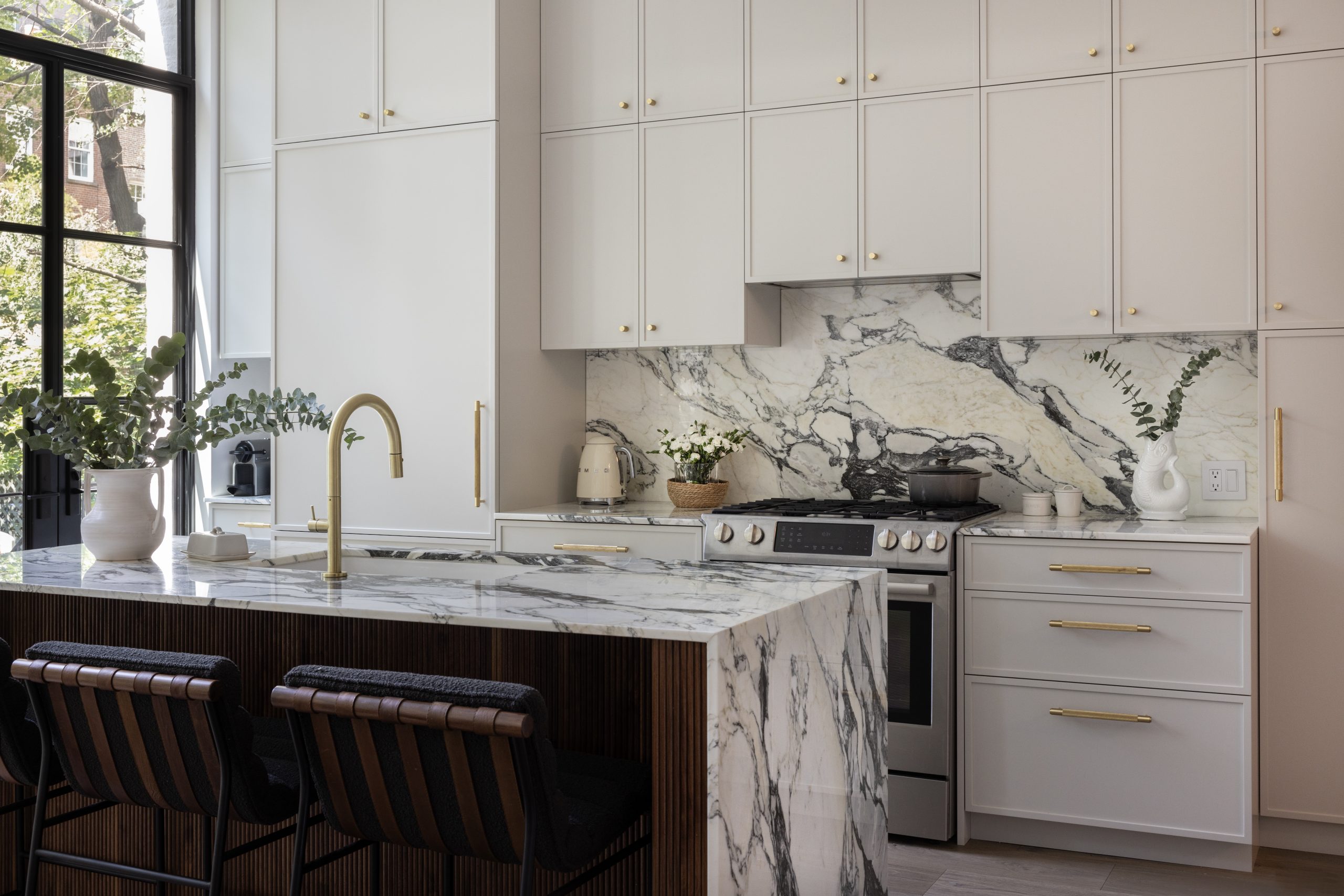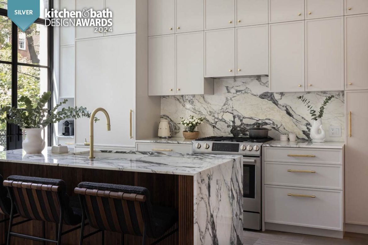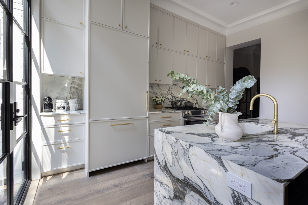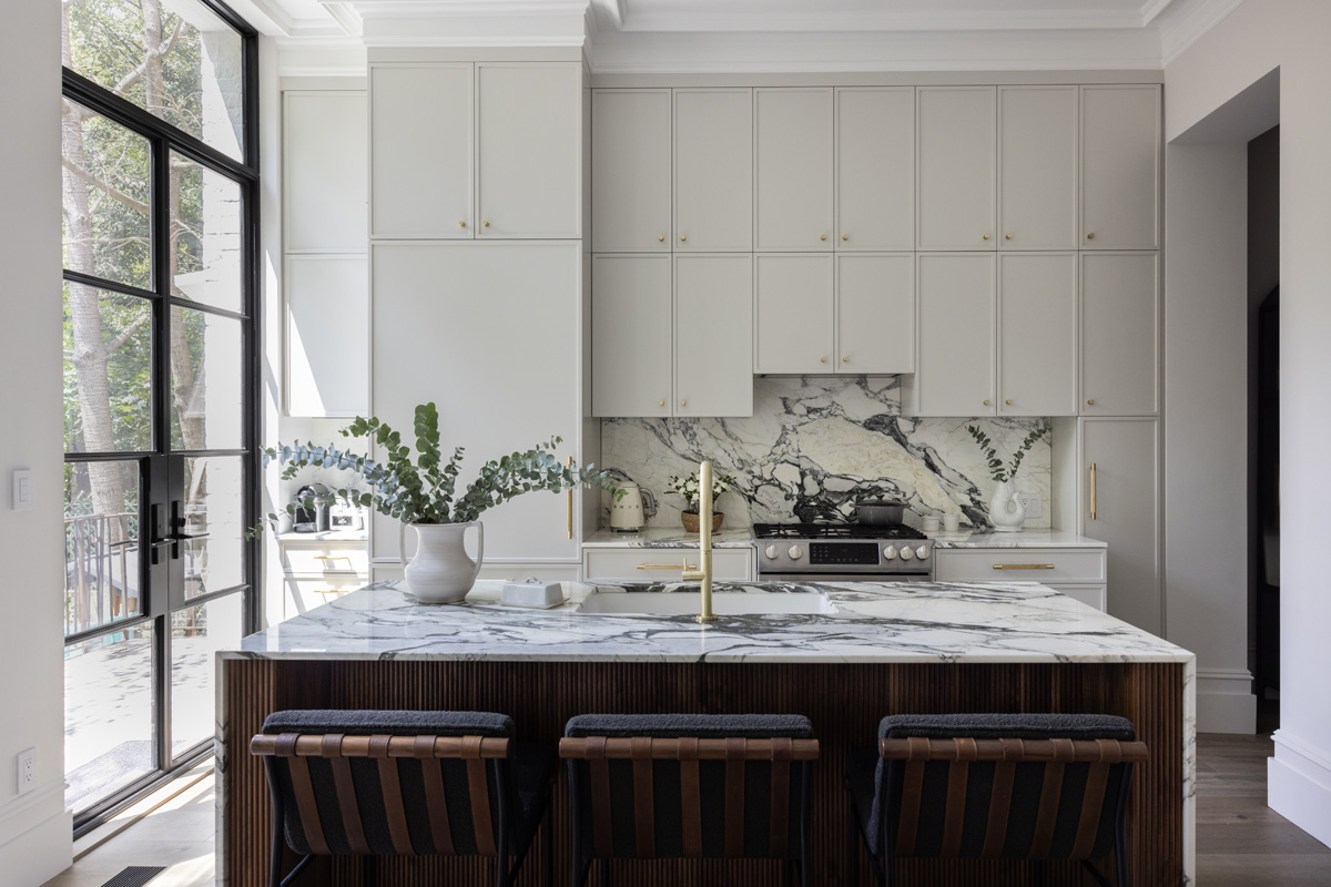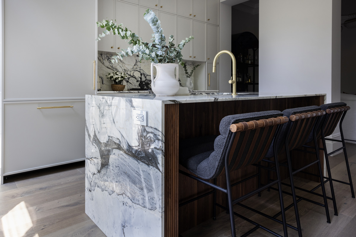 The face of the new island is clad with fluted walnut for added interest, and a Bosch dishwasher, Rohl Allia sink and Poetto faucet from California Faucets enhance functionality. Calacatta Corchia marble, from ABC Stone Marble, serves as the countertop surface where waterfall edges showcase the natural stone’s gray and warm-toned veins. The marble is repeated for the perimeter and backsplash behind the Bosch range and Faber exhaust hood.