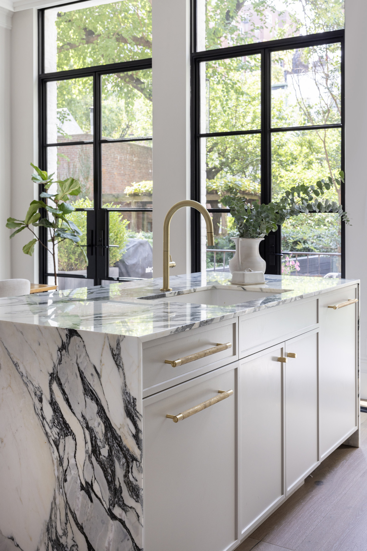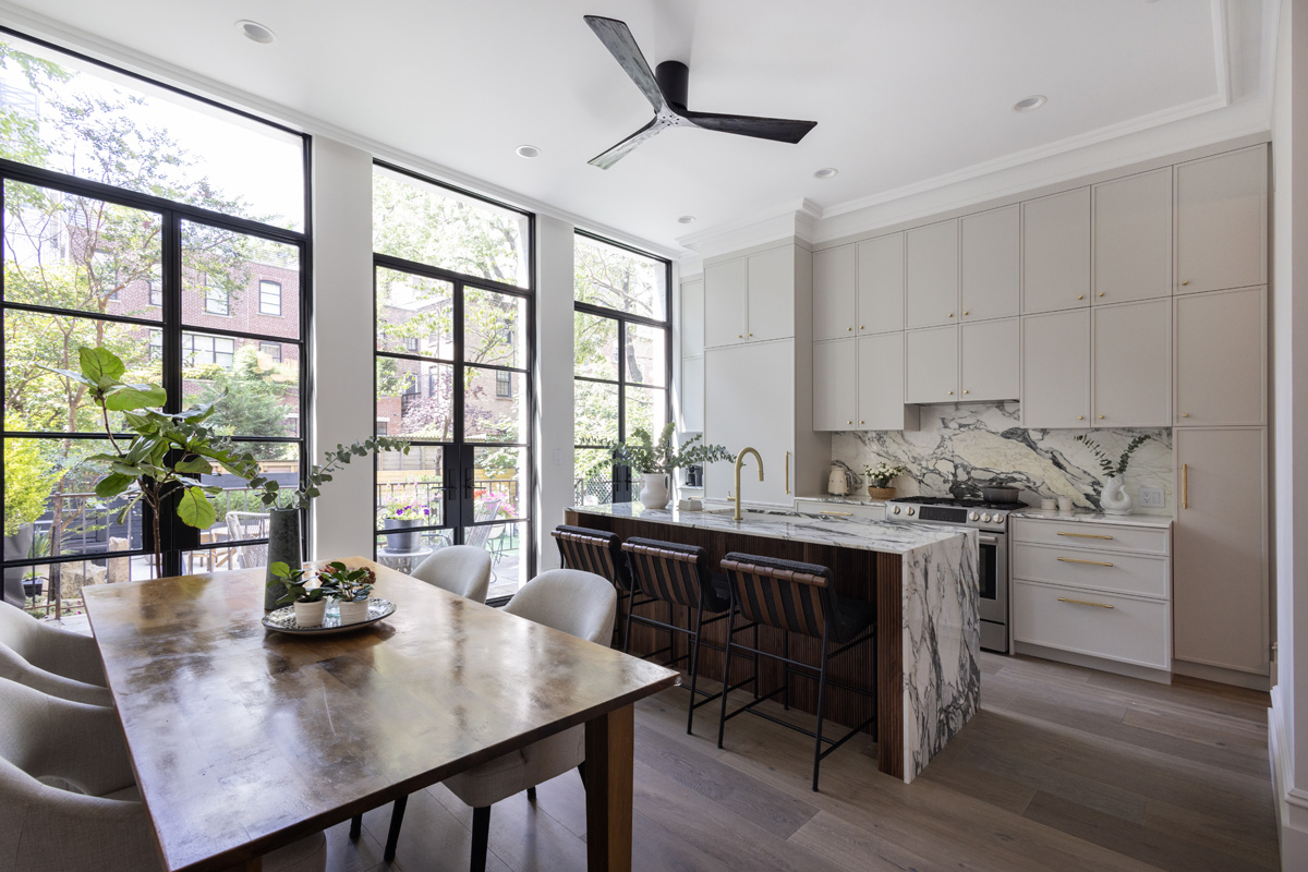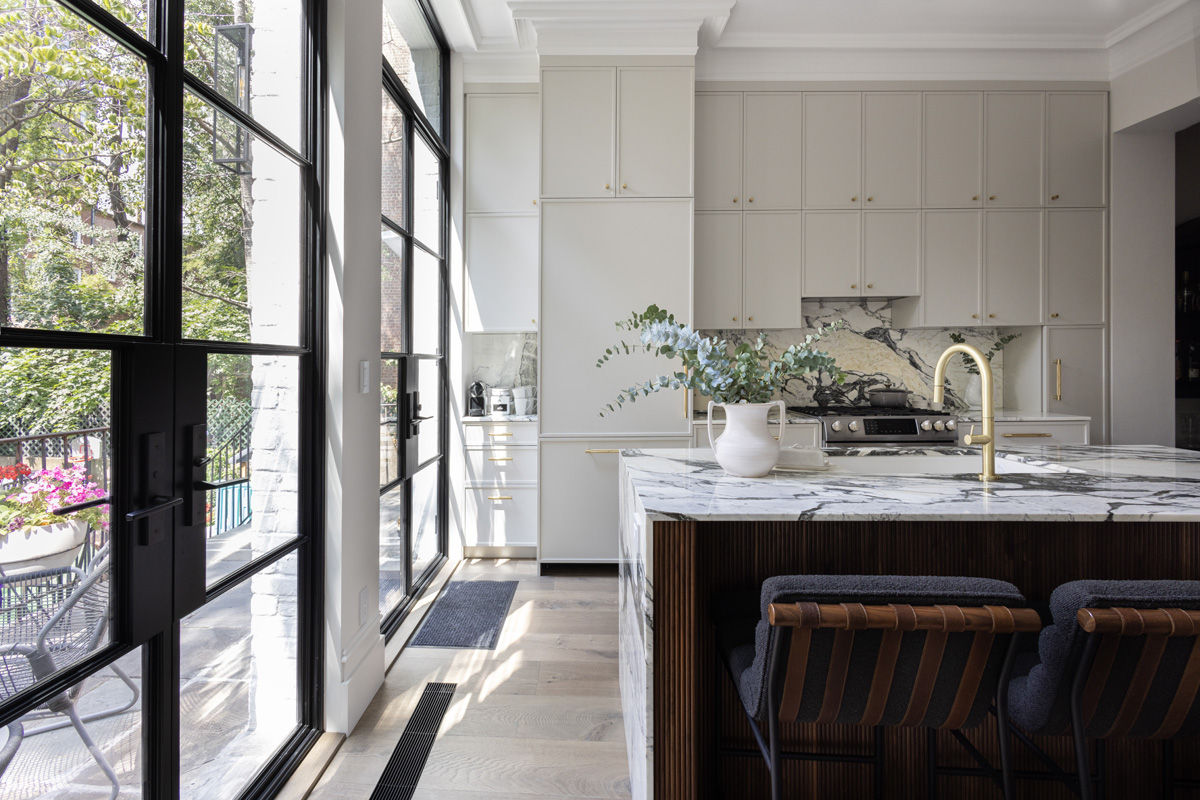 For starters, the original kitchen was located on the basement level, right off of the primary suite. Moving it to the first floor, where it joined the dining and living areas, allowed the designers to take advantage of those openings, which were updated with new blackened metal doors.