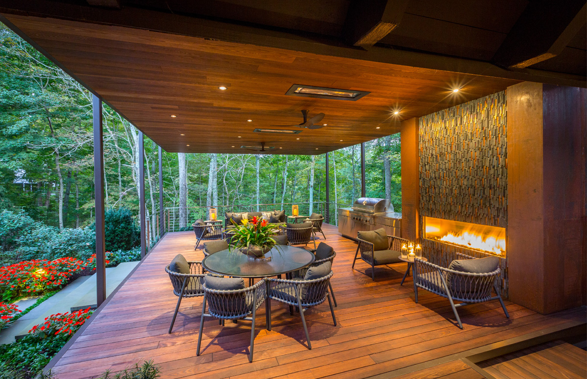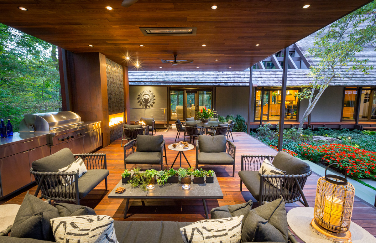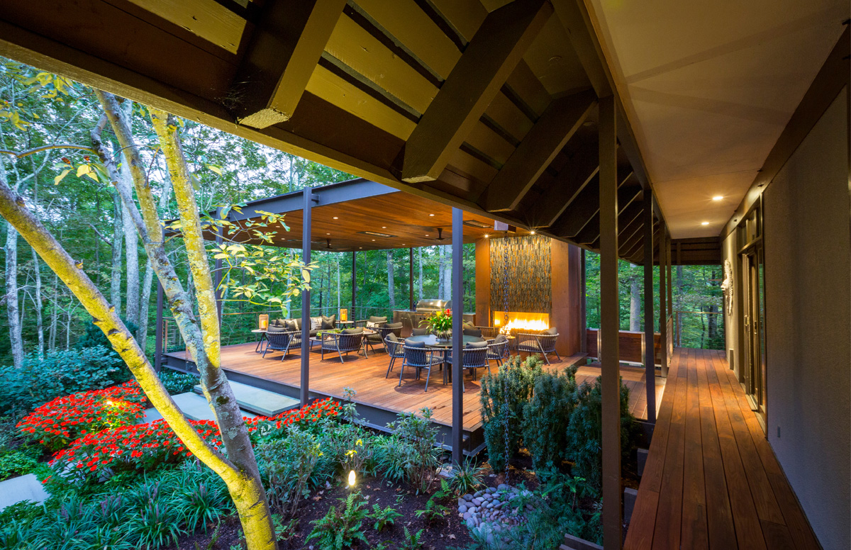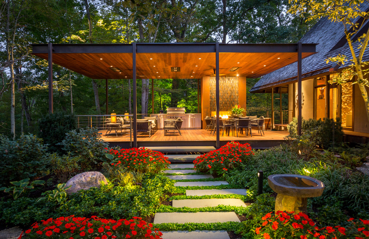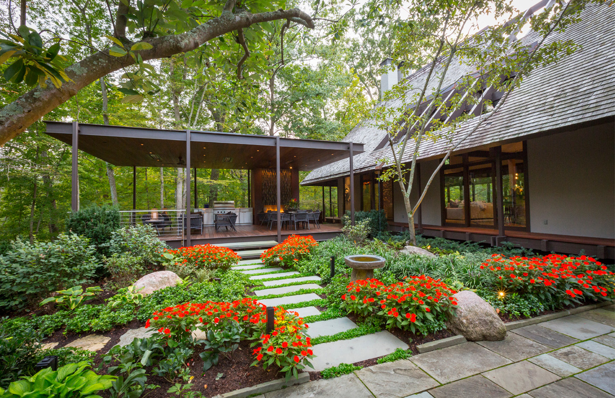 Between two steep ravines sits this mid-century modern home and grounds designed by iconic Cincinnati architect Carl Strauss and landscape architect Dick Ammon. The owners of the property approached the design team at drawing dept with a simple and direct aspiration: to improve their outdoor living opportunities, including a covered place to grill and eat. Due to the nature and configuration of the existing house and the steep ravines at either side, site access for construction was very difficult. Designed components had to be craned over the top of the home.