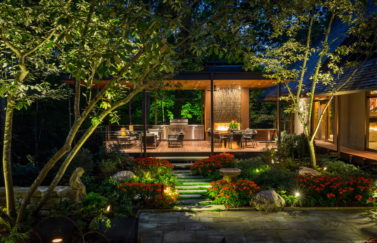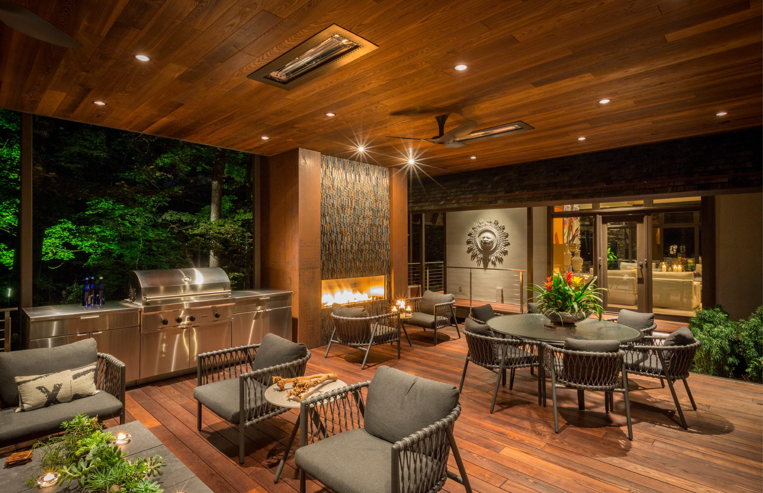 Starting with the removal of an existing wood deck, the project hinged on the addition of a new covered pavilion, complete with outdoor grilling area and numerous seating areas. Positioned near the end of the existing house, and at the point of topographic transition, the pavilion creates a habitable edge that redefines a courtyard bounded by the L-shaped home. The hardscape patio footprint was reduced and a new curated green space was allowed to invade the courtyard, resulting in a lush, resort-like garden.