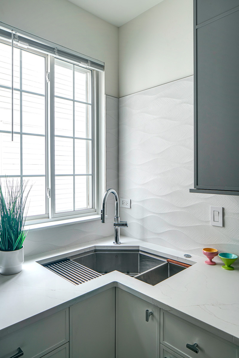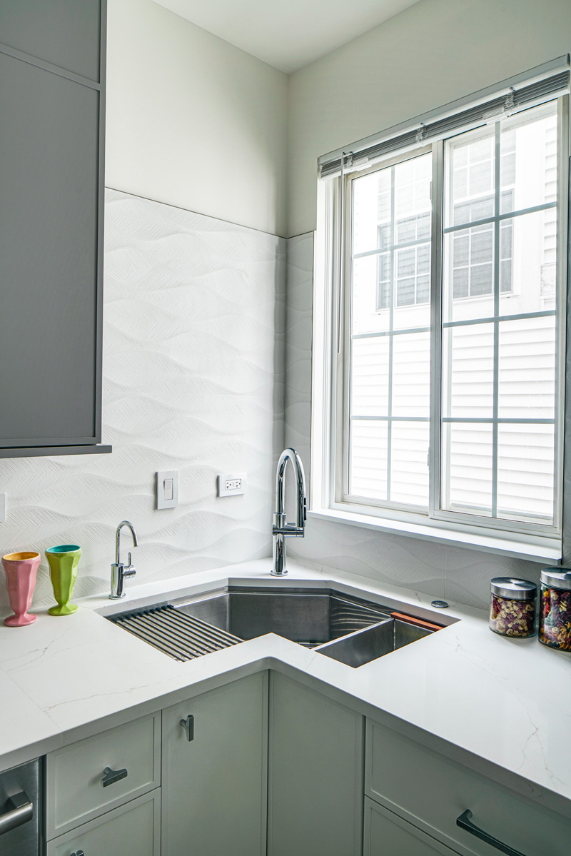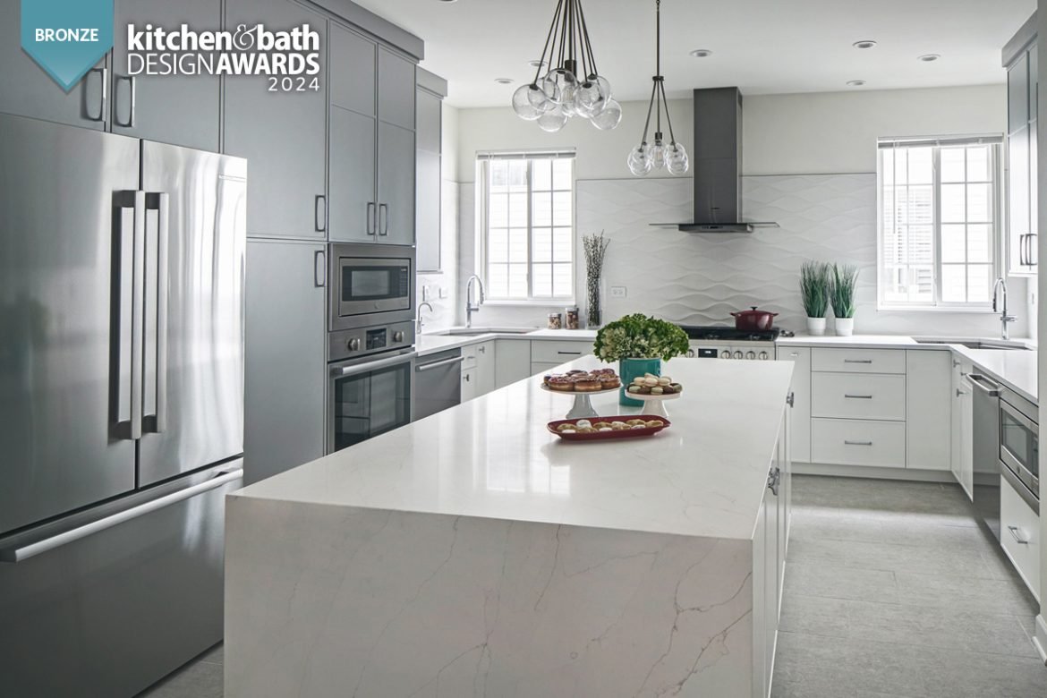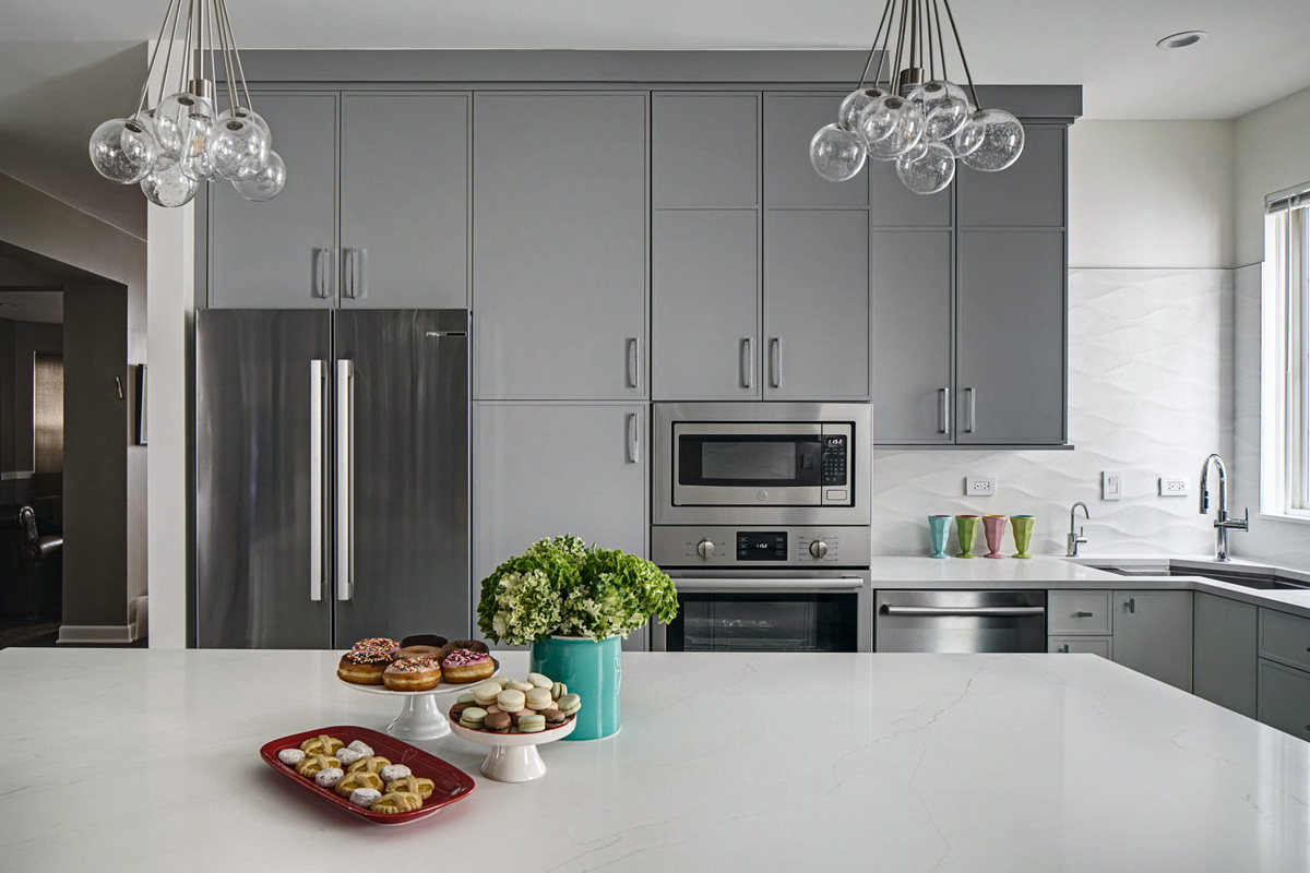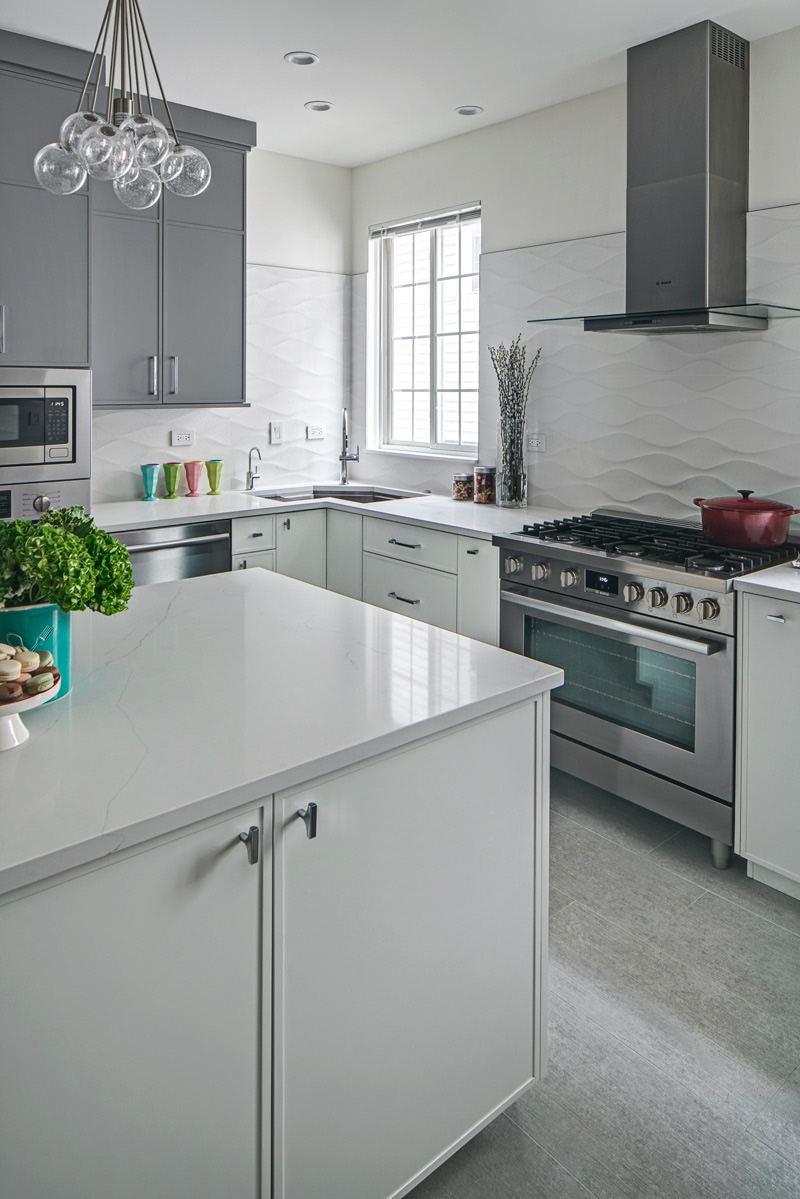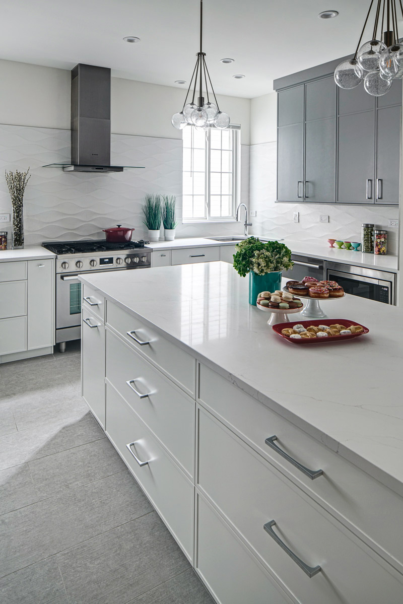 The gas range, hood, dishwasher and refrigerator/freezer are also from Bosch. Mouser Cabinetry supplied the cabinets throughout, which includes upper and tall cabinets in Ice, and island and base cabinets in Titanium. Aurora white countertops from Vadara are paired with undulating tiles from Porcelanosa. Hardware from Top Knobs and two over-island pendants from Bronzeville in brushed nickel finish the space.