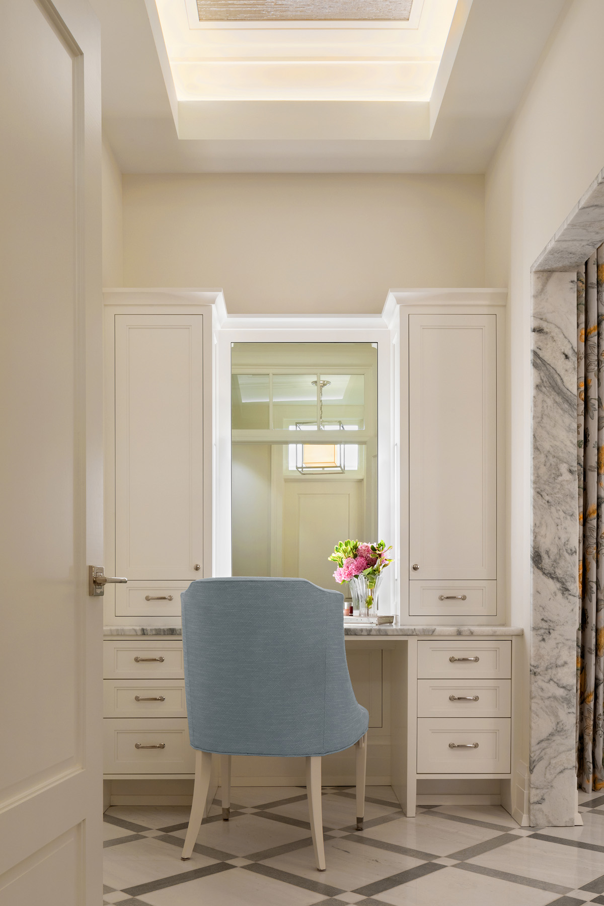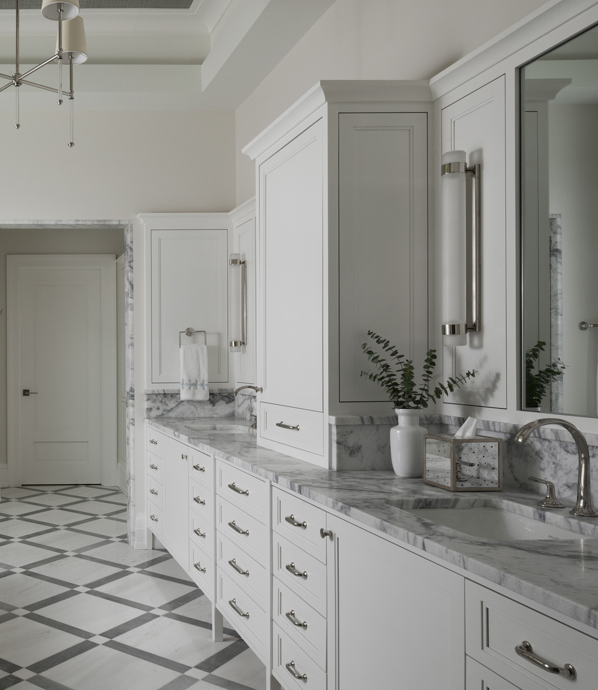 Script bath accessories and faucets in Nickel Silver, Vir Stil and Script Nickel Silver shower and bath fittings, as well as Perfect undermount sinks, Papion bathtub and Plie toilet in Stucco White are all from Kallista. Oculus knobs and oval pulls from Top Knobs grace the extensive vanity along one wall, which is topped with a marble countertop. Visual Comfort LED sconces and chandelier offer color changing and tunable illumination to achieve the desired atmosphere and mood, and are programmable for daily routines.