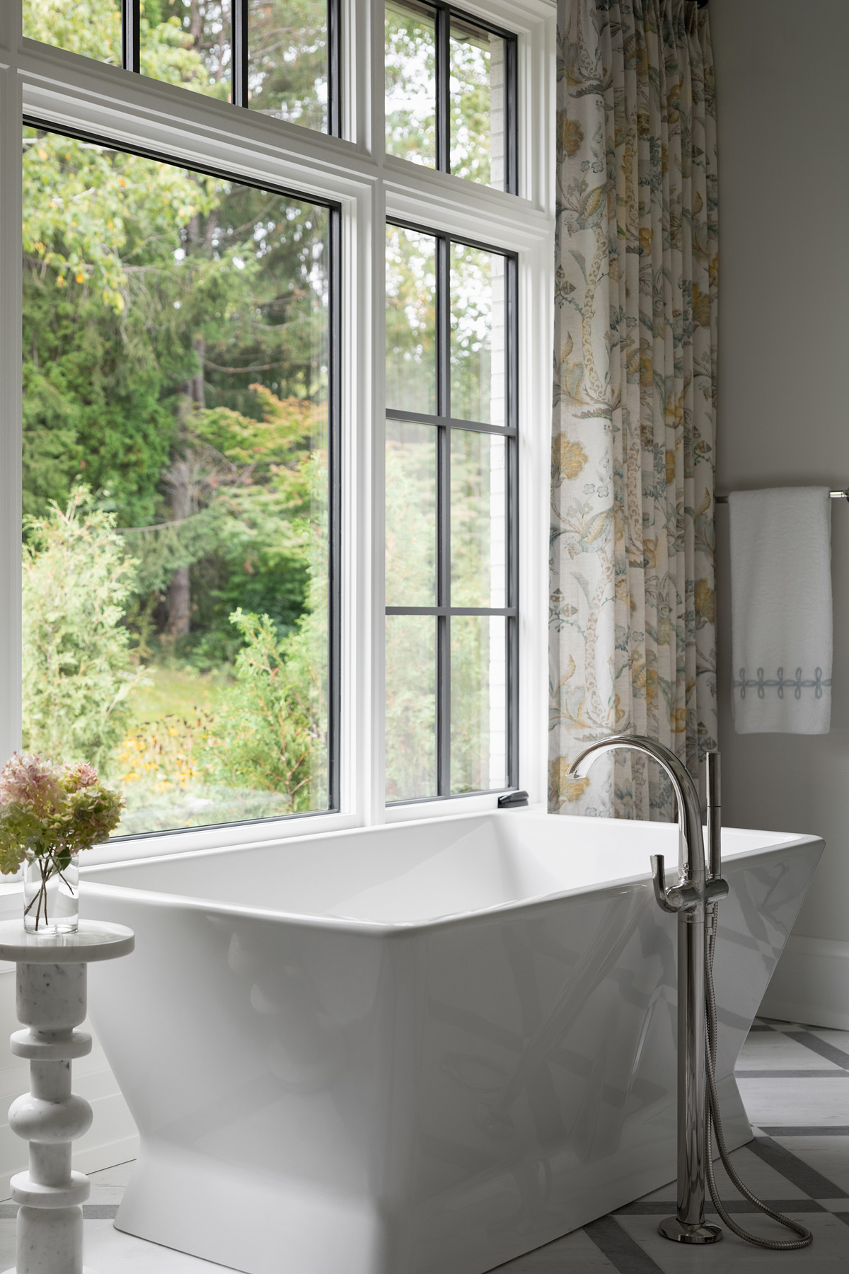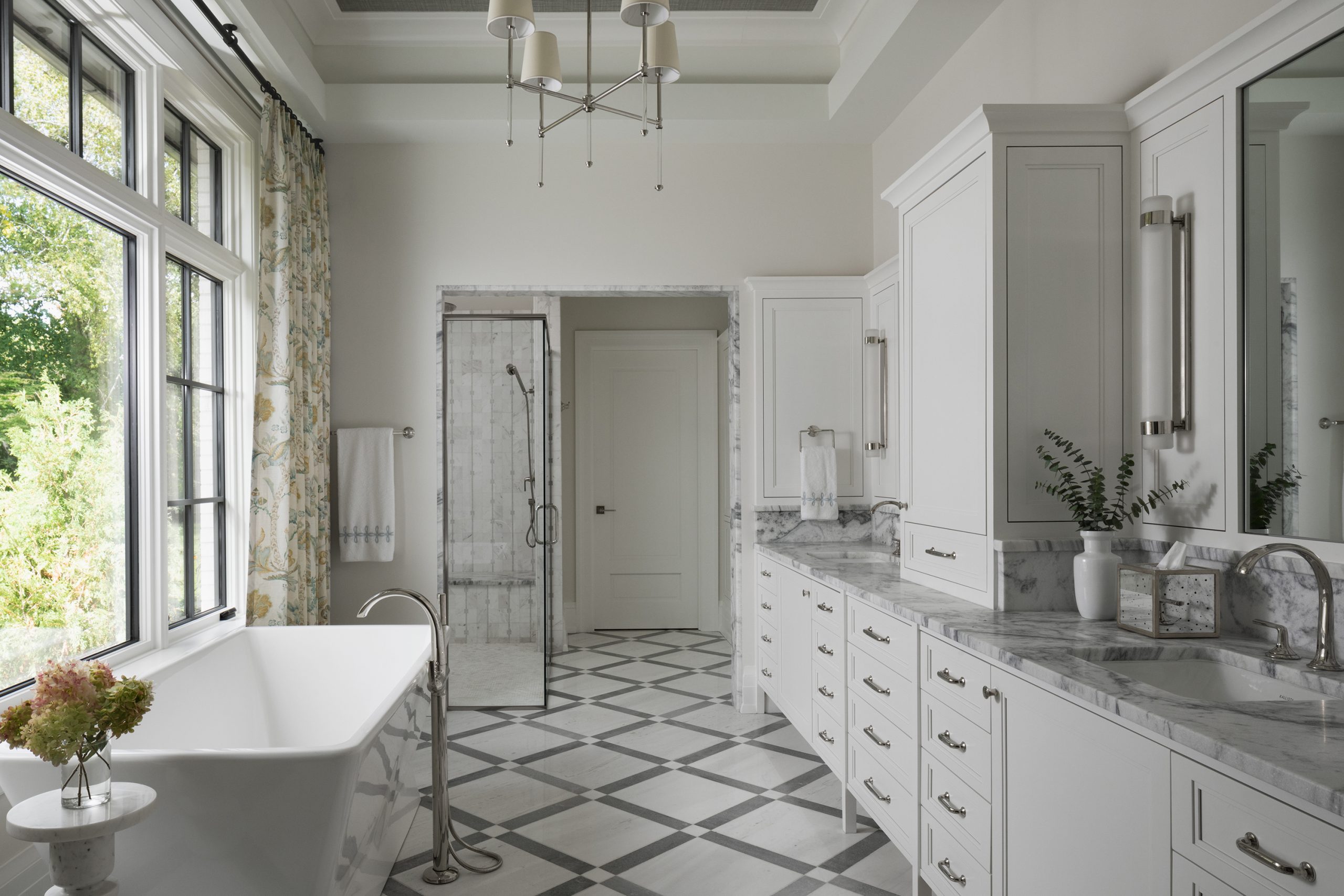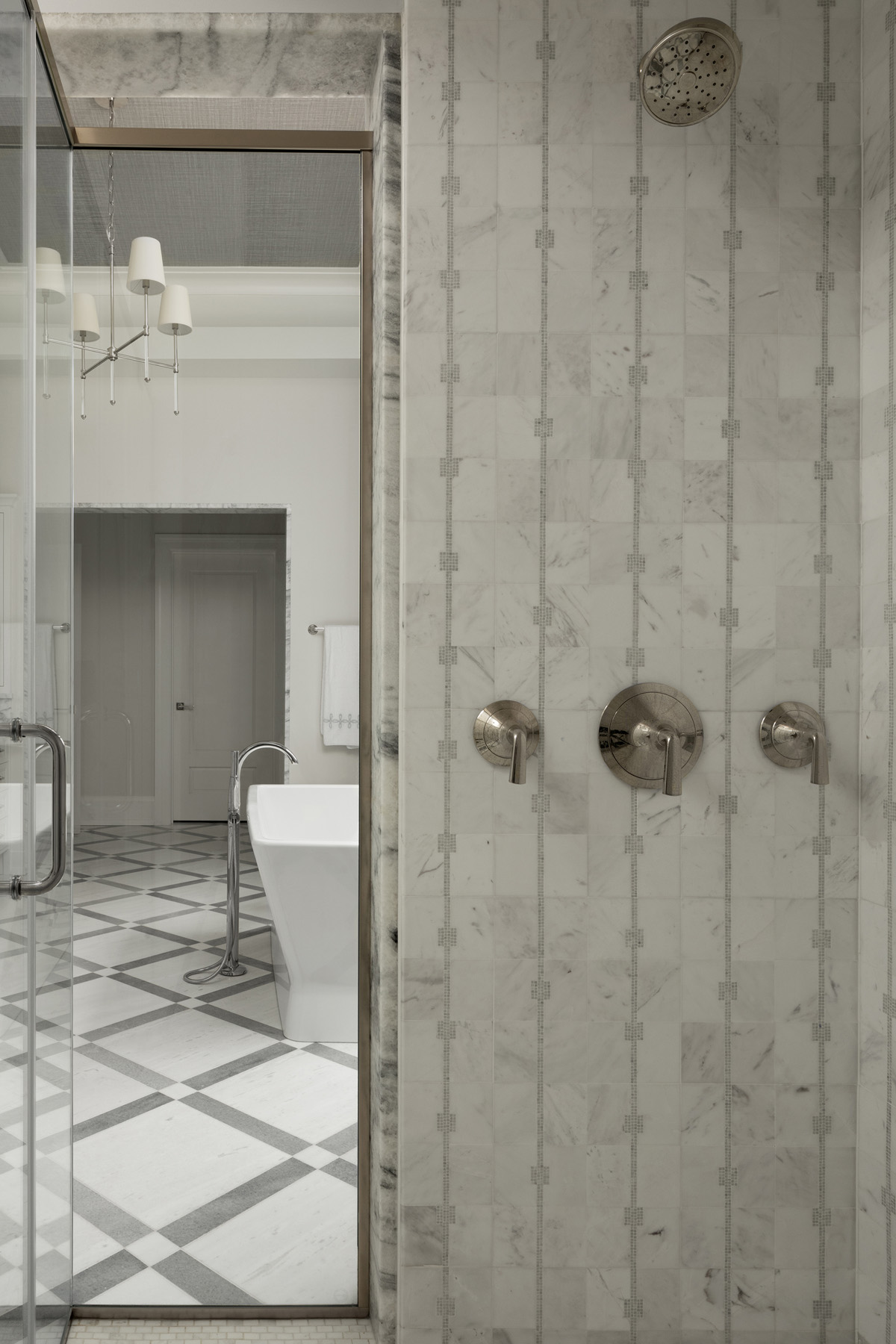 The tile makes a statement throughout the bath. Marble floor tiles from the Ann Sacks’ Alyssa and Cielo Crystal collections create a sophisticated pattern throughout the space. In the shower, gray stone tile from Jeffrey Court complements the company’s white honed mosaic marble on the floor.