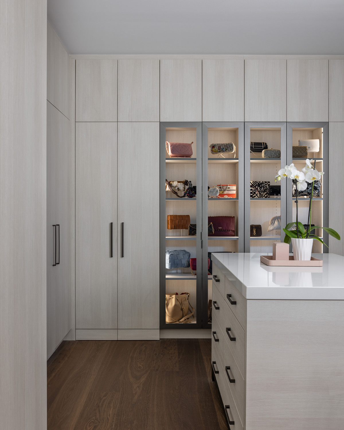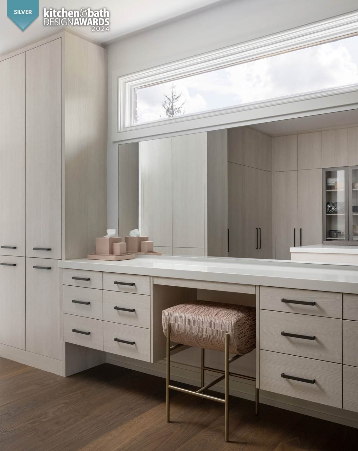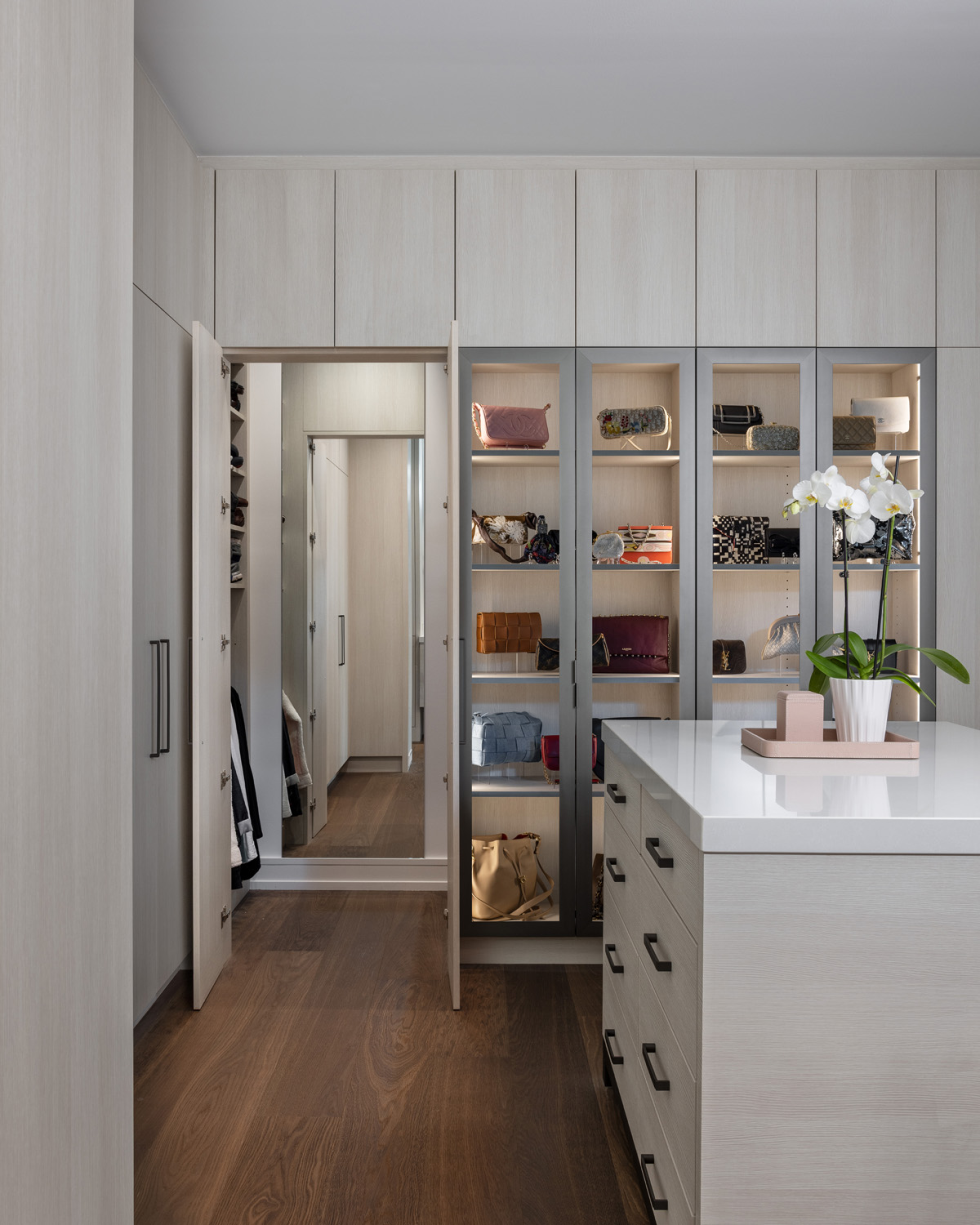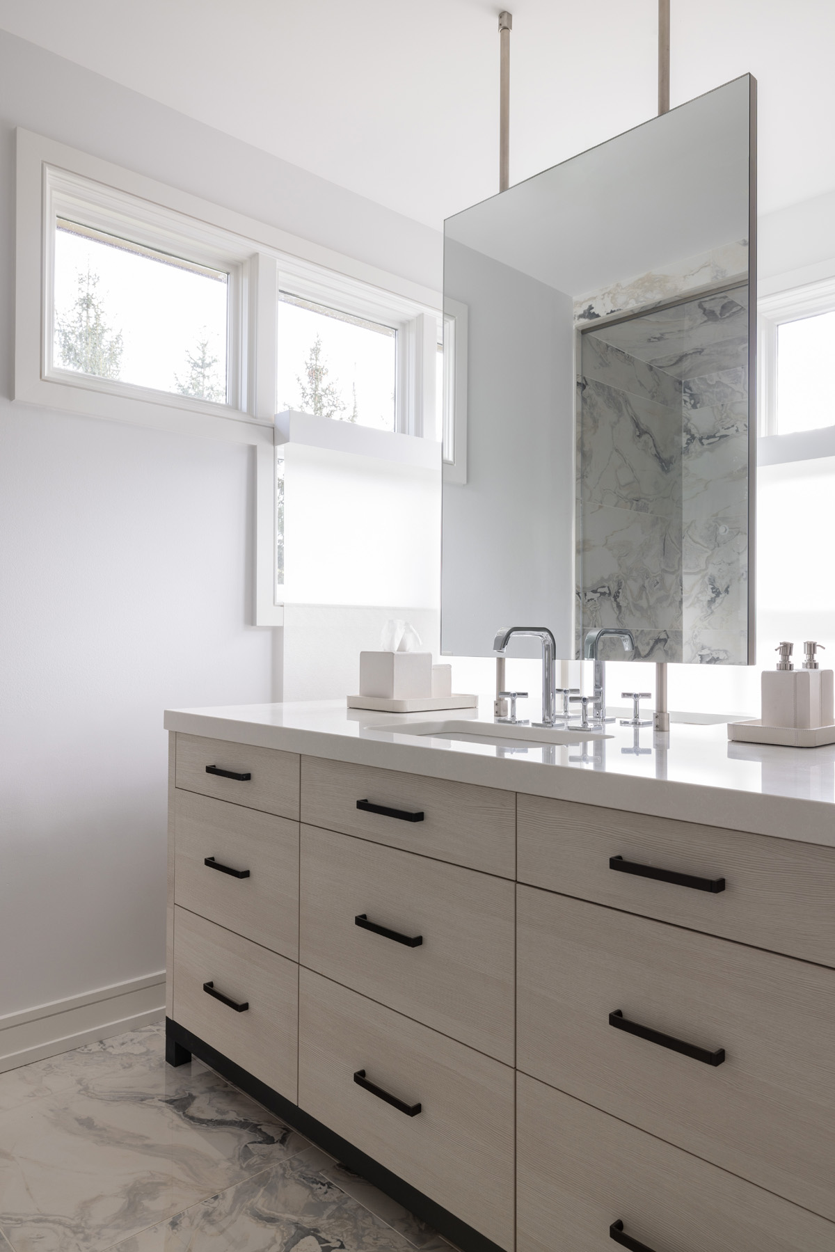 In the bathroom, his and her vanities by Perspectives Cabinetry with Quadrato hardware in Gun Metal from Schaub & Co. are placed toward the center of the room. The two Toto sinks, paired with Hansgrohe Axor Citterio E Widespread Faucets, are separated with a custom, ceiling mounted floating mirror anchored to the Envi Quartz Paradise countertops. Towel bars are placed beyond on the far side of the large central vanity to maintain a clean visual appeal and remain nearby. Each side contains its own trash pull out as well as ample storage for personal items.