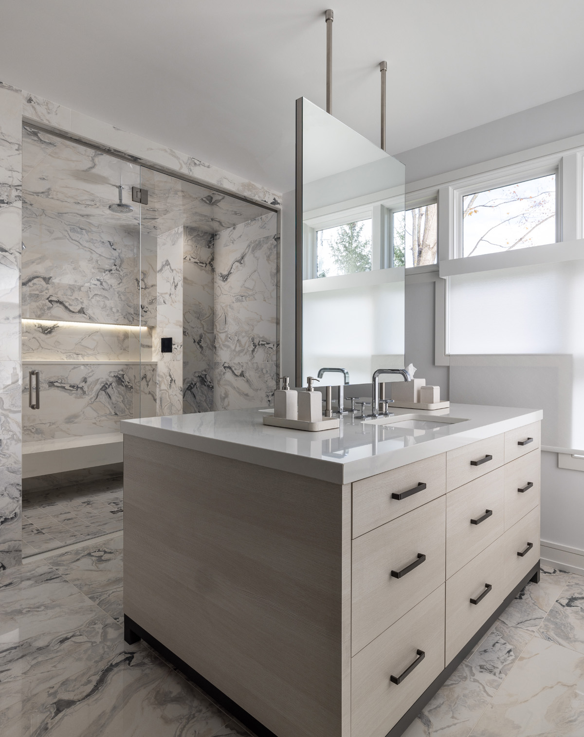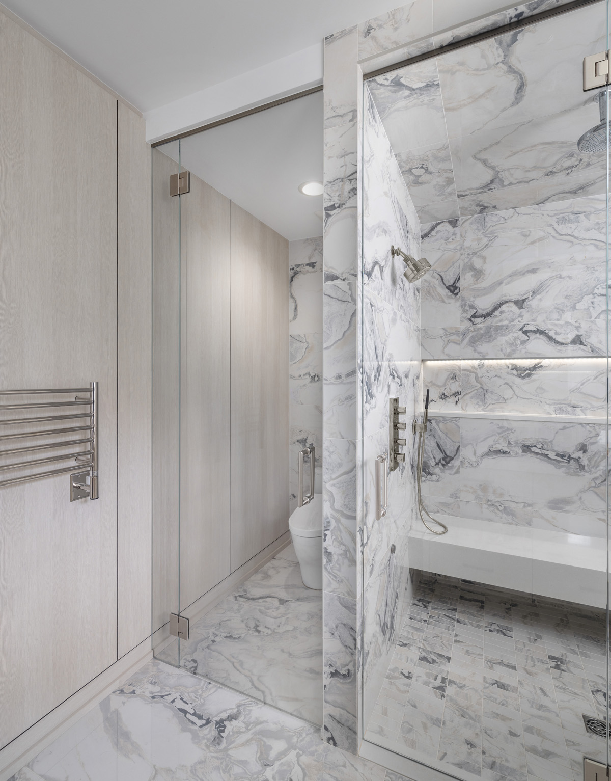 Interno porcelain 24″x48″ Calacatta San Bibila tile is featured on the floor and throughout the shower space, which also includes shower fittings from Hansgrohe Axor and Grohe, as well as a steam shower from ThermaSol. A Toto Nexus with Washslet toilet, heated floors and towel warmers complete the design.