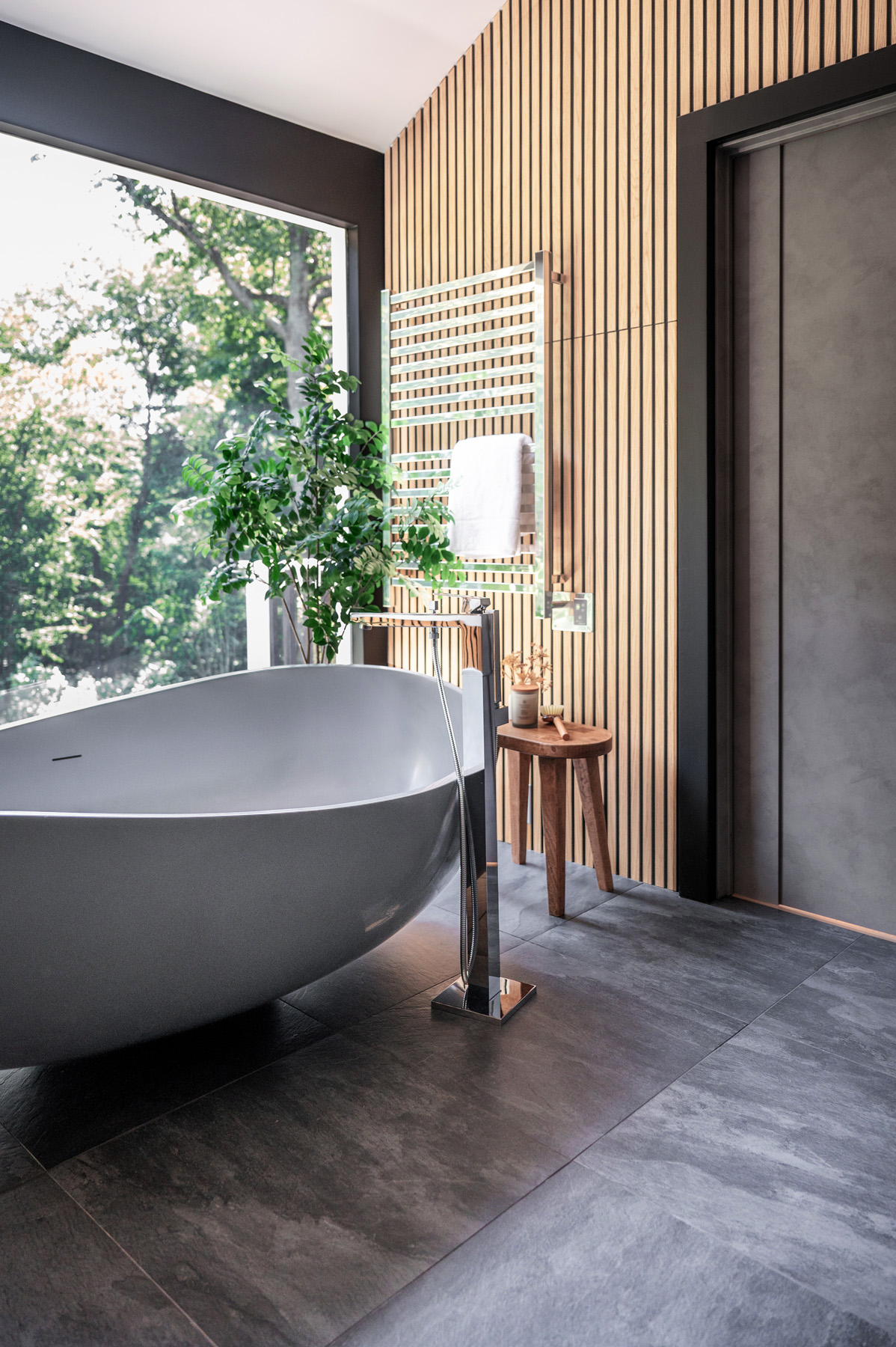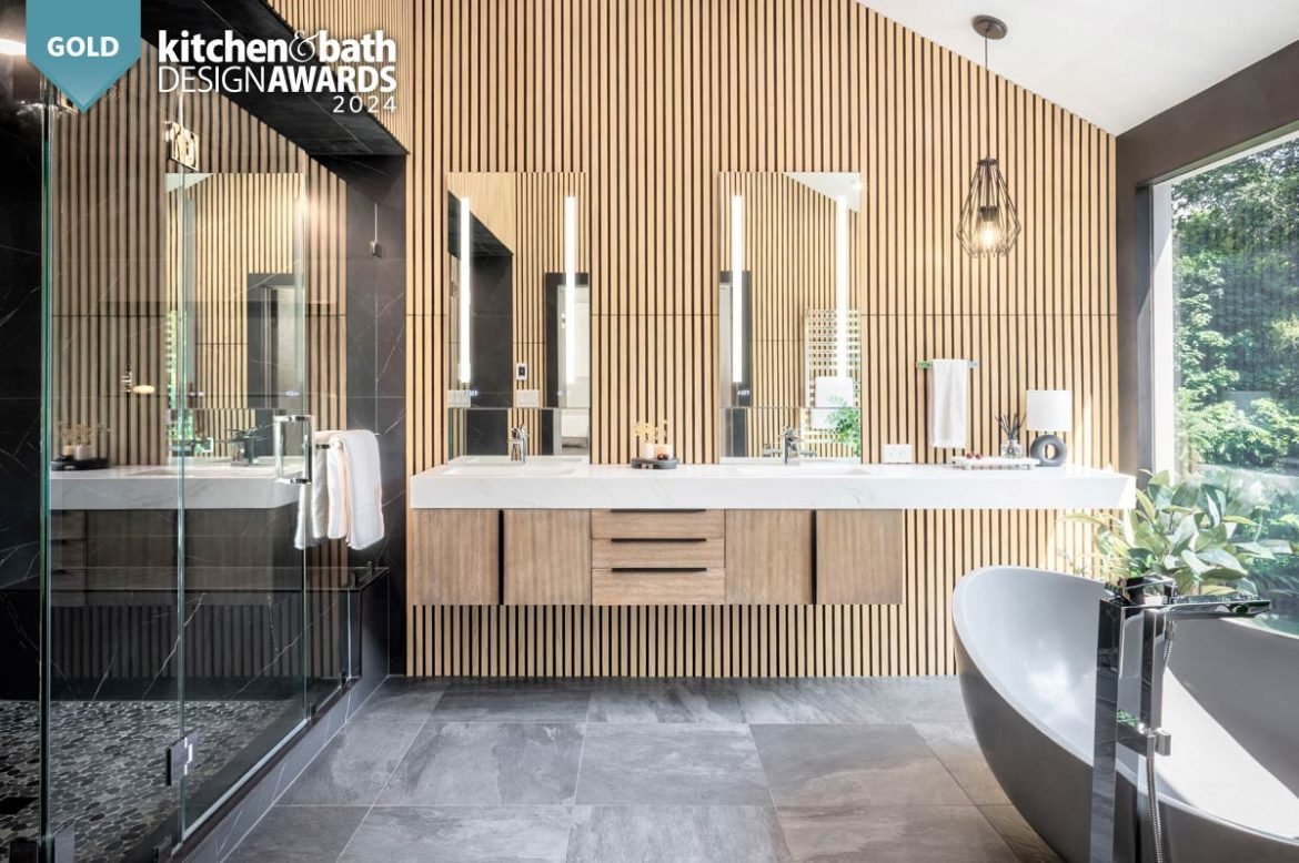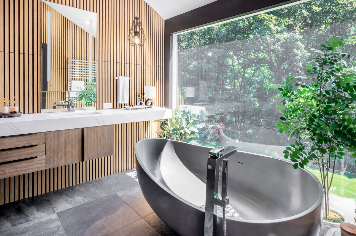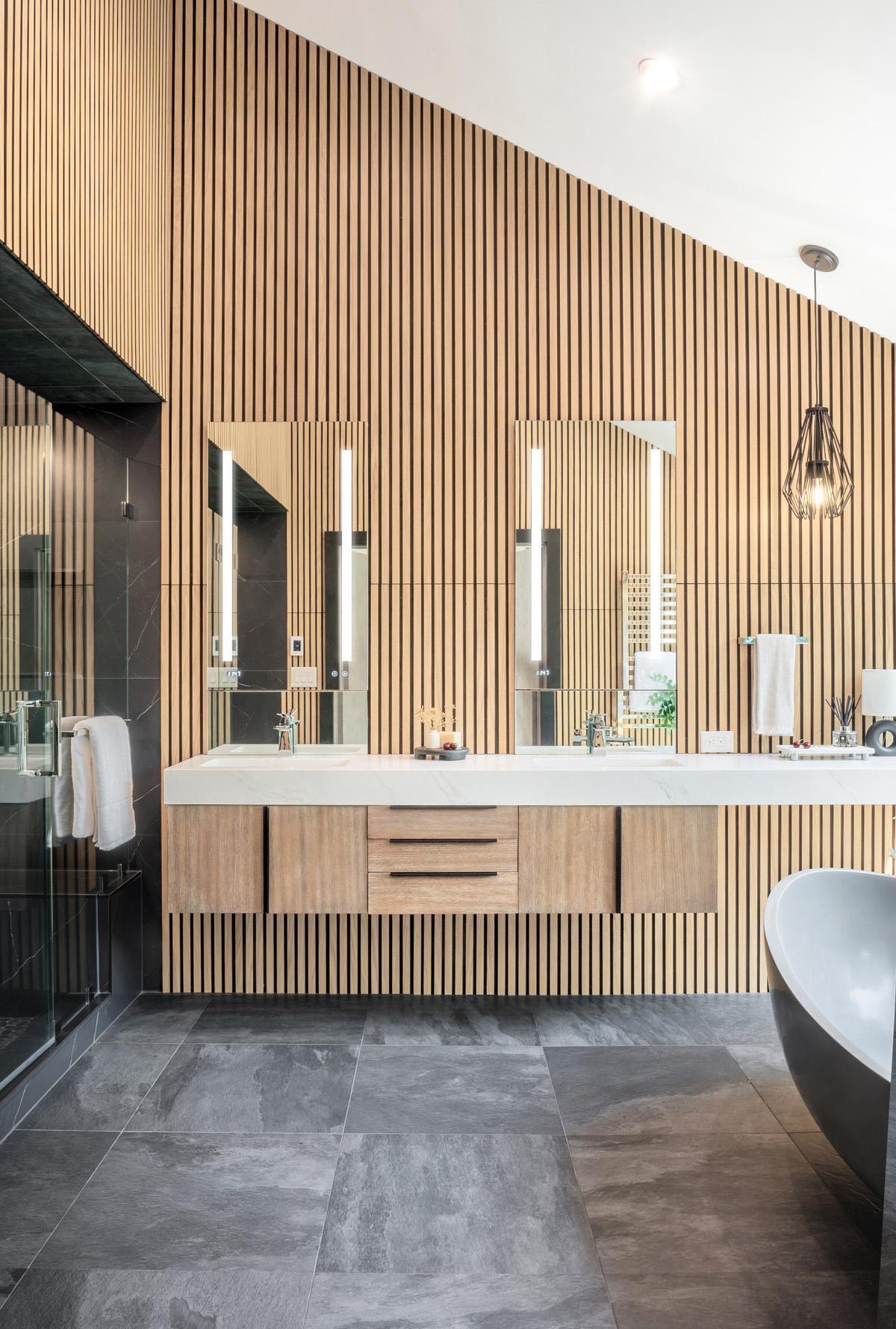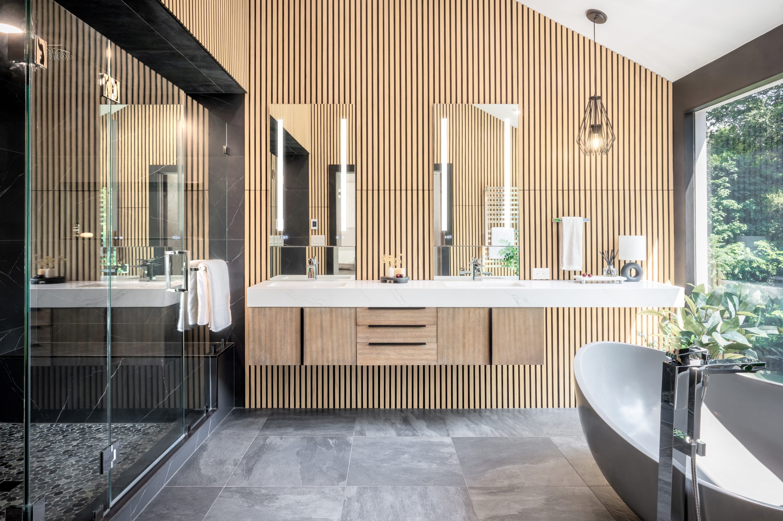 The designer wanted to create a space that was moody and high in contrast, with modern details and natural materials. A large window provides a view of the lush greenery outside, and the Homary 70″ Gray contemporary oval freestanding stone resin soaking tub in front of it makes for a soothing soak. The walls perpendicular to the tub are clad in oak veneer slats, adding a touch of nature and interest. On one wall, the Mercer vanity from James Martin Vanities is topped with a floating quartz MSI Calacatta Miraggio Gold countertop with Scarabeo rectangular sinks. One small All Modern Frankie Single Light Metal Dimmable Pendant helps balance the space yet keeps it symmetrical.