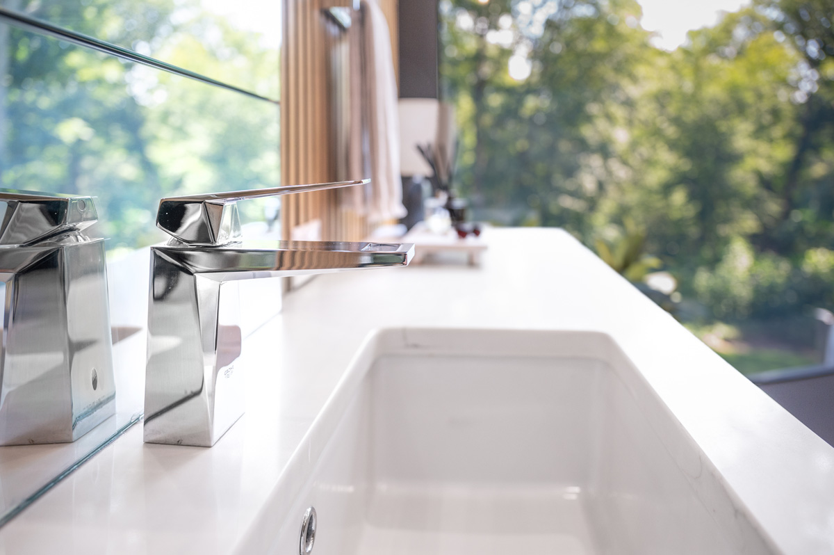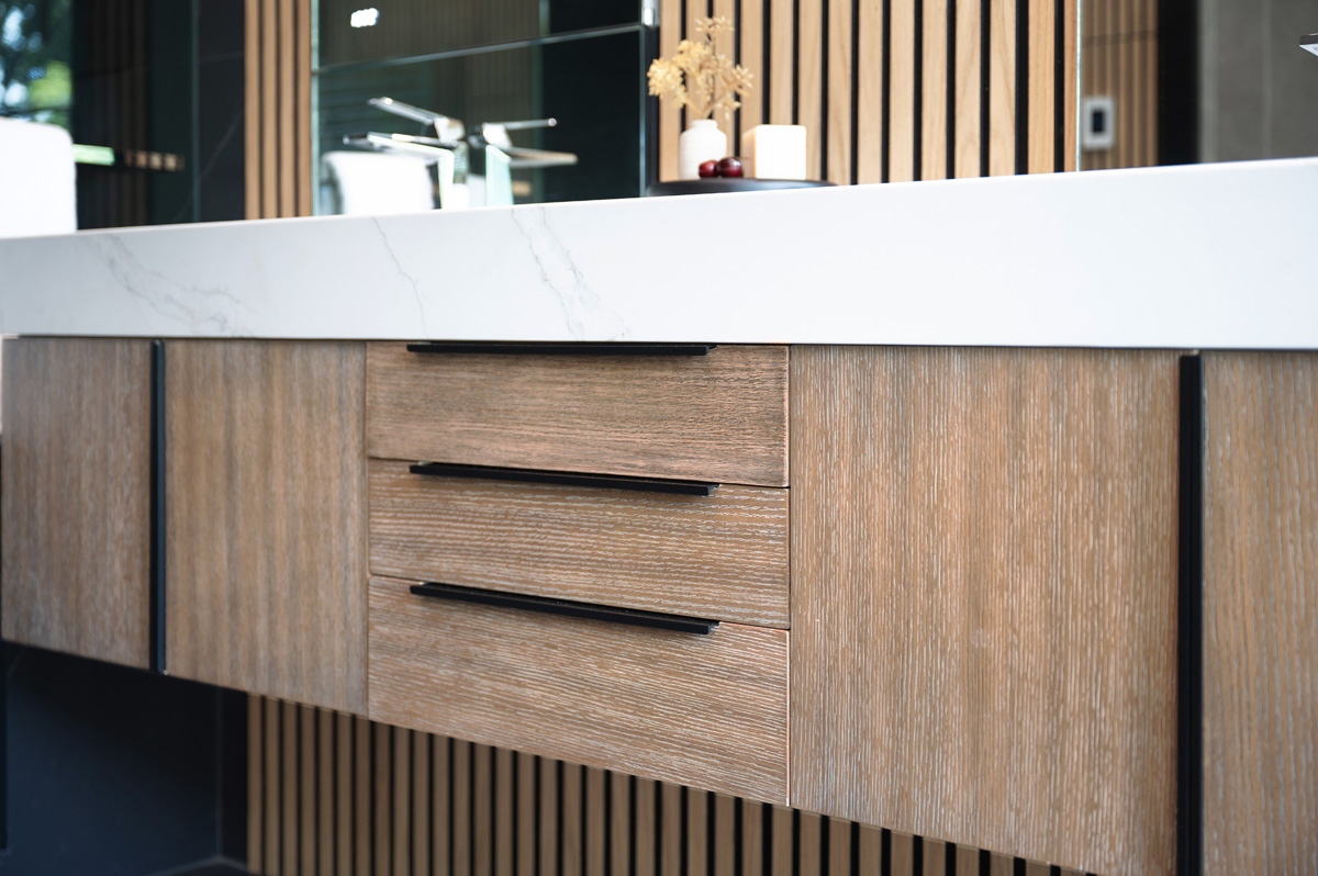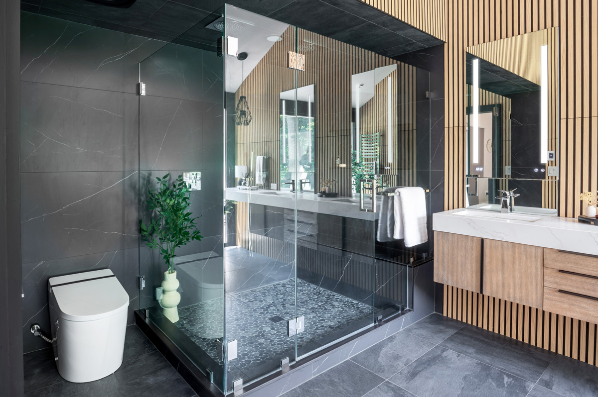 The shower ceiling and bathroom floor are finished in 24″x24″ Gazzini Move black tile, which provides additional contrast with the wood slat walls and natural light. All faucets are from the Grohe Eurocube Allure Brilliant line.