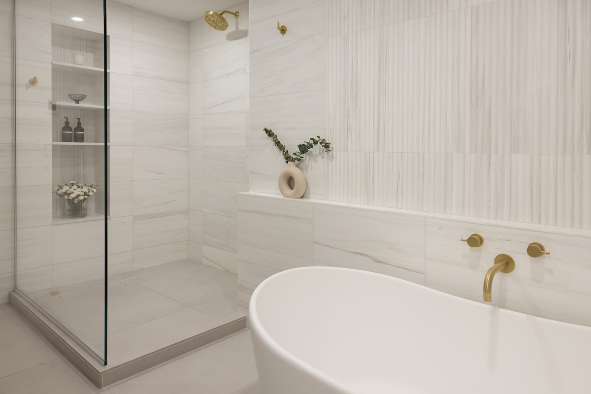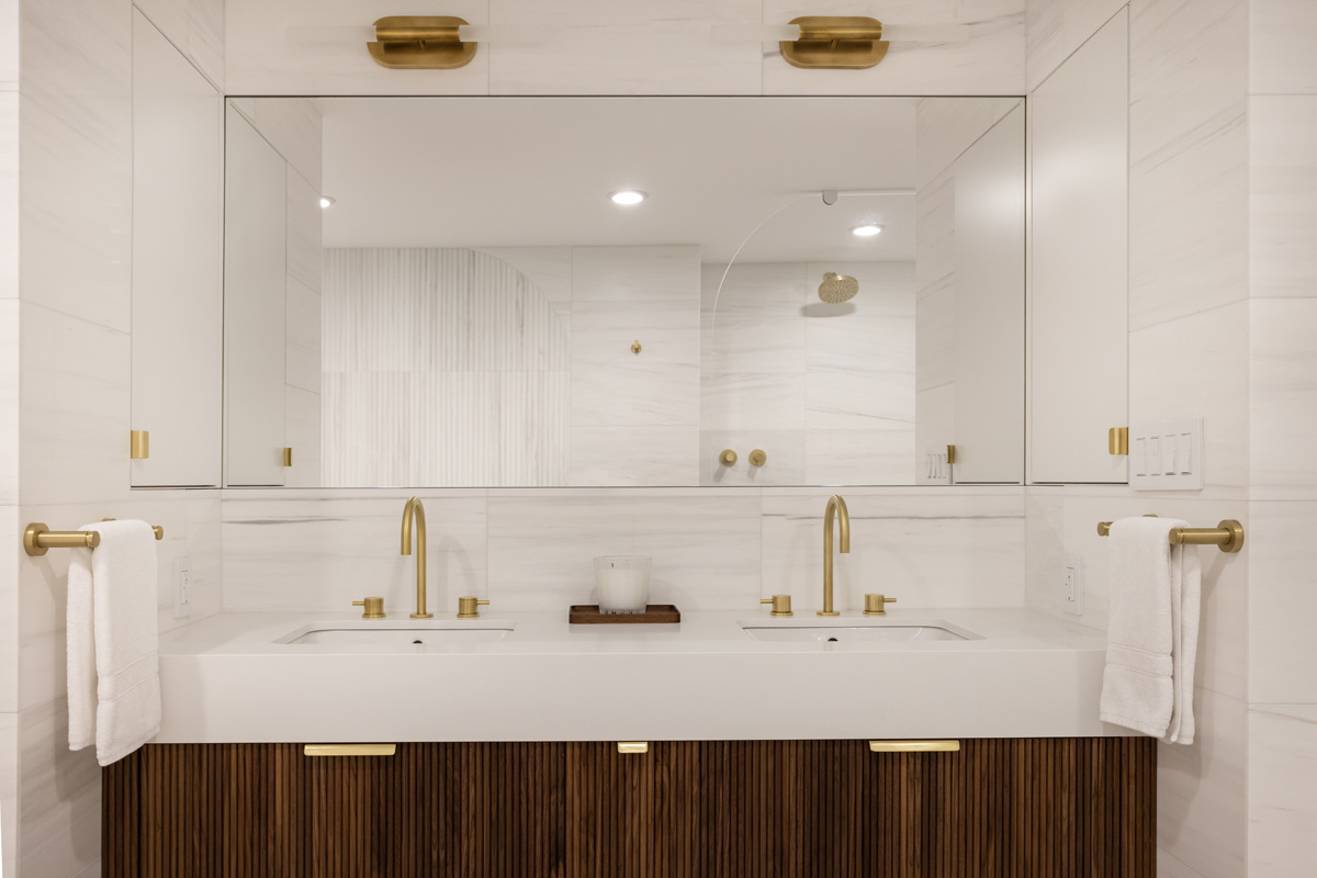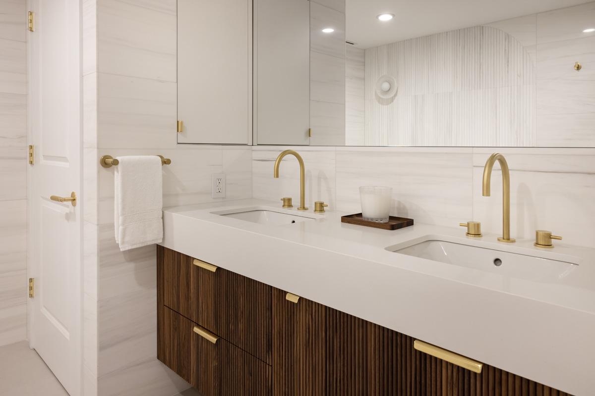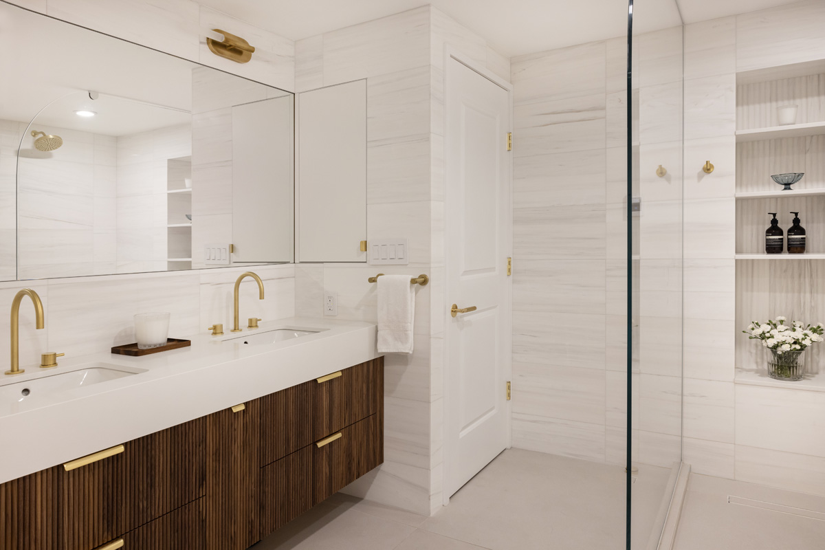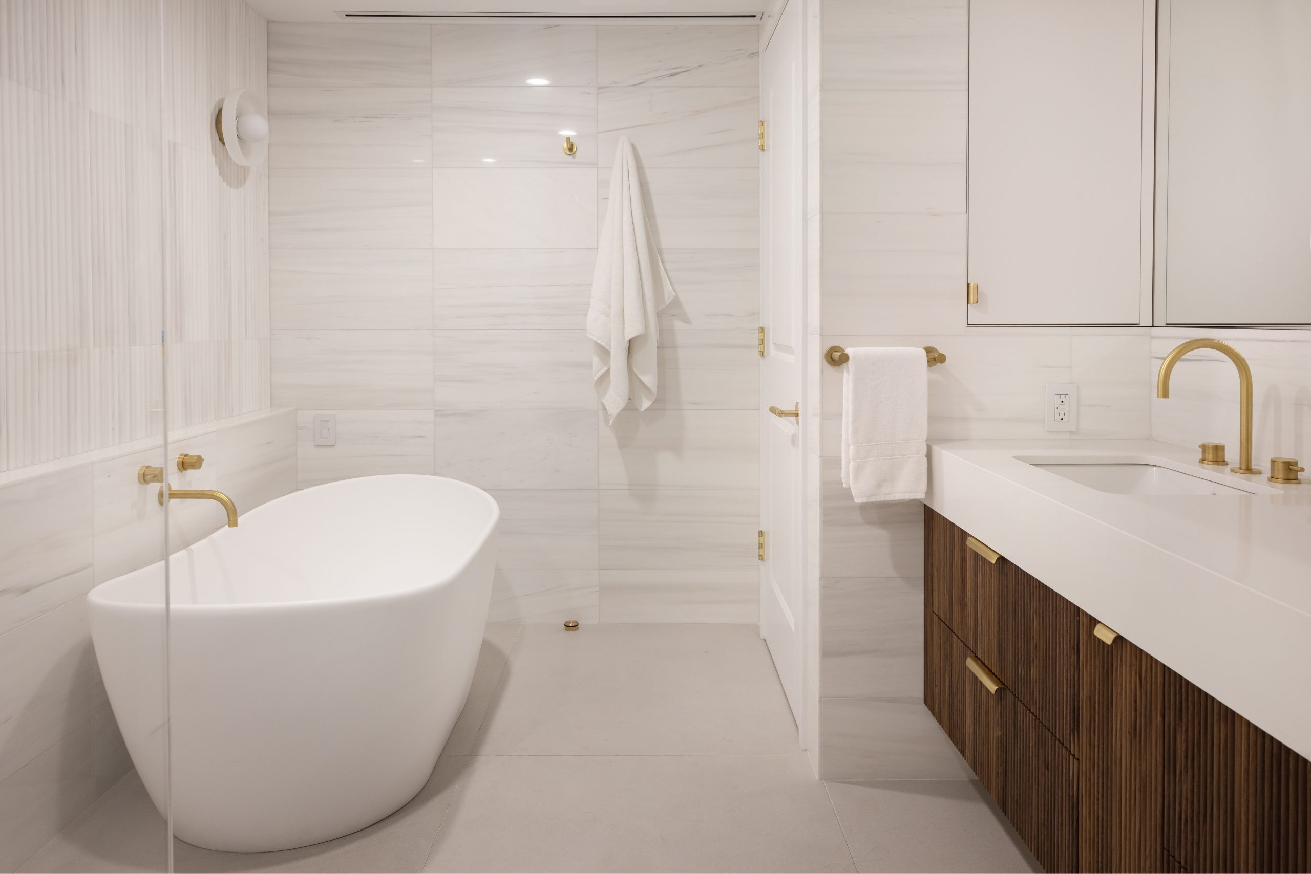 Natural marble tiles on the walls and shower, fluted accent marble behind the freestanding bathtub, natural brass fixtures and hardware by Watermark, a custom walnut vanity and an enormous shower elevate this space to a tranquil retreat. Floor heating was added to the bathroom, including the shower area, in order to provide additional comfort and an enjoyable experience in the clients’ zen space.