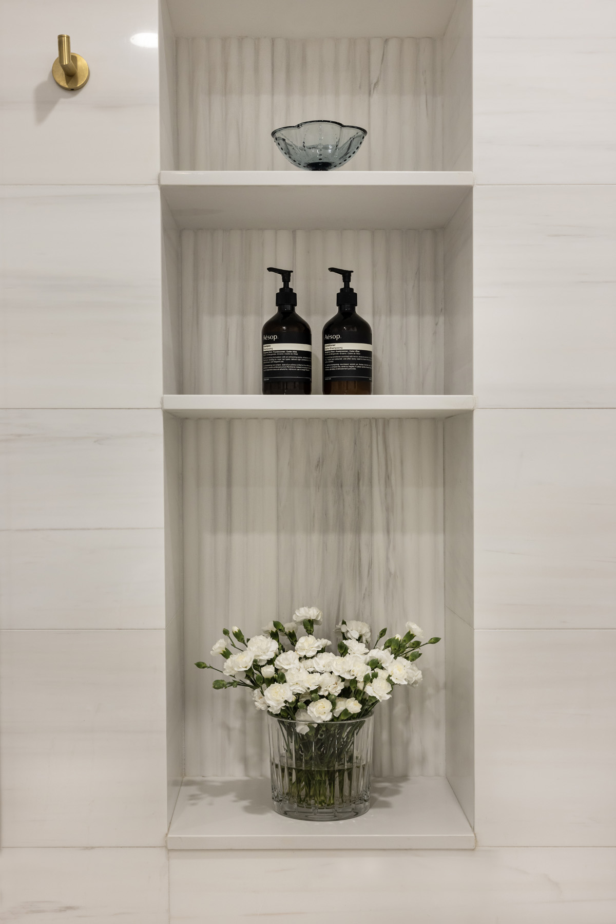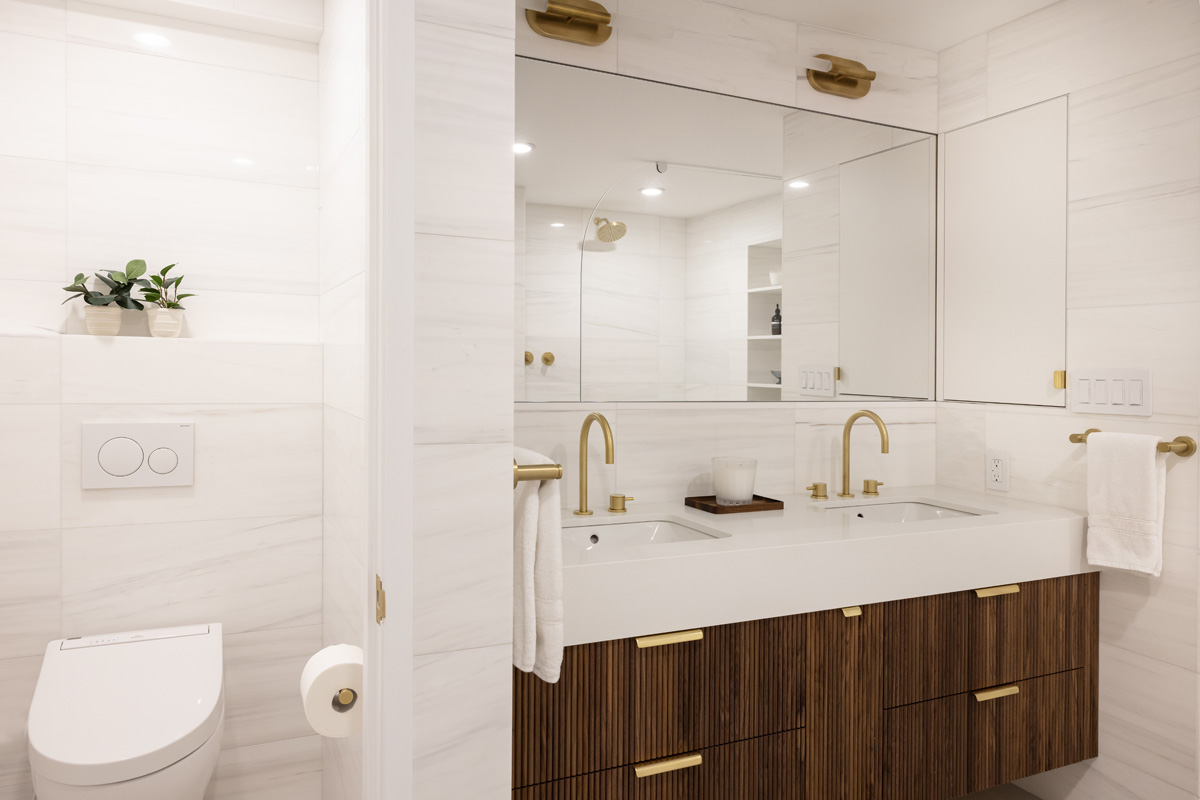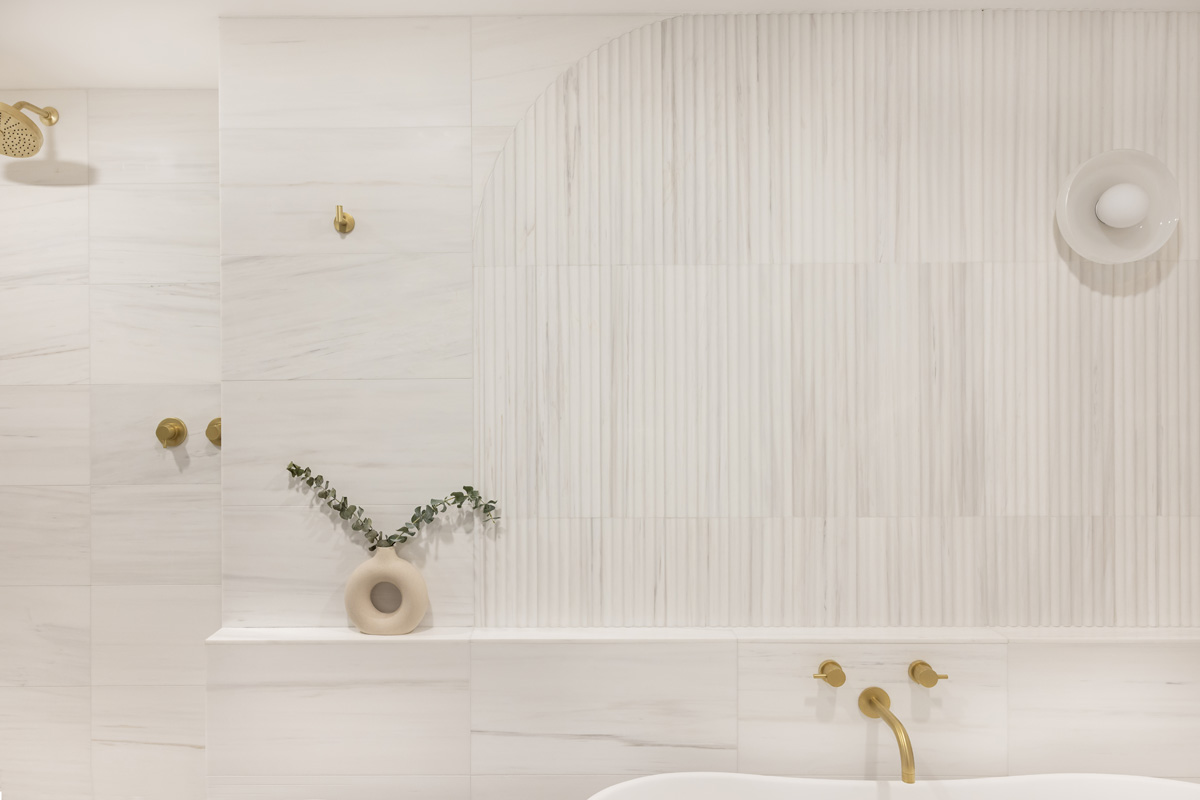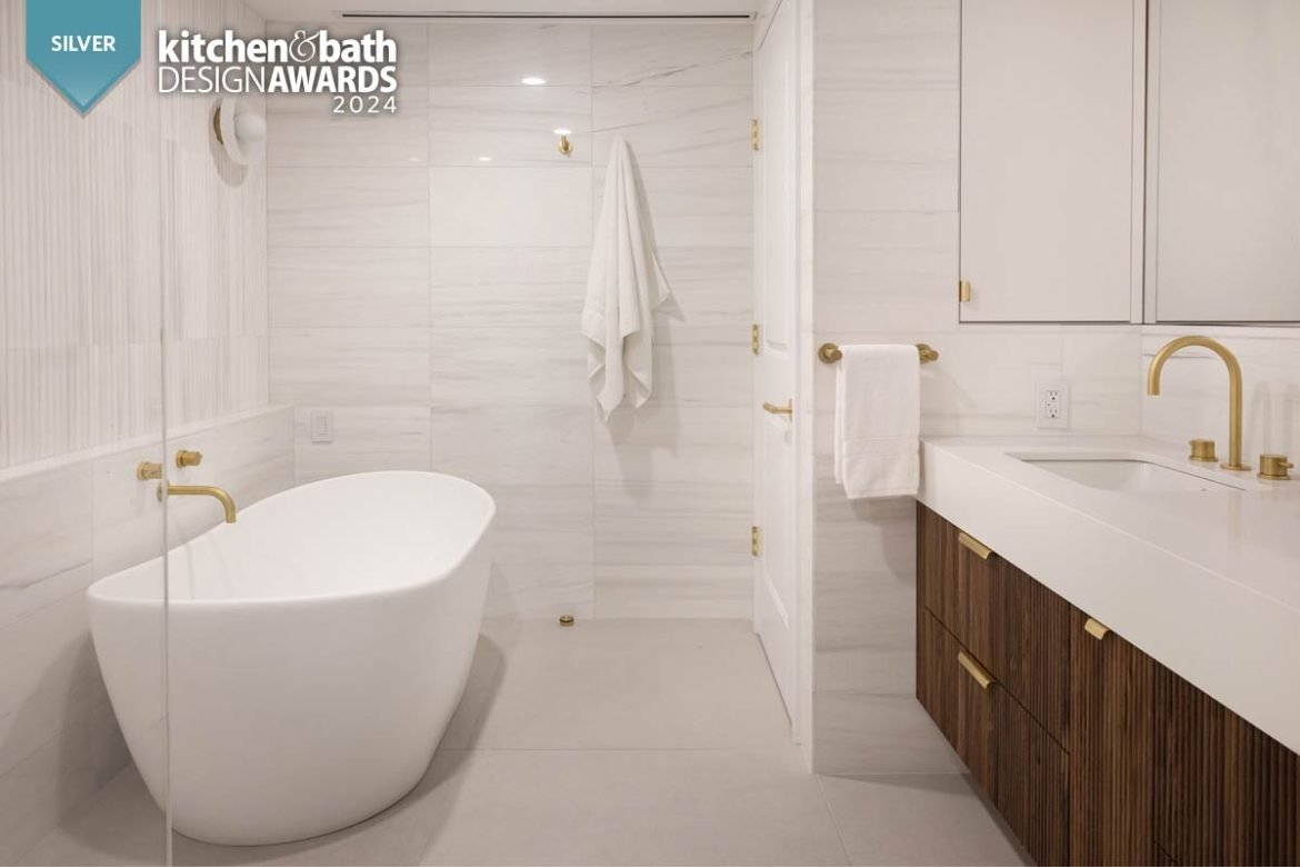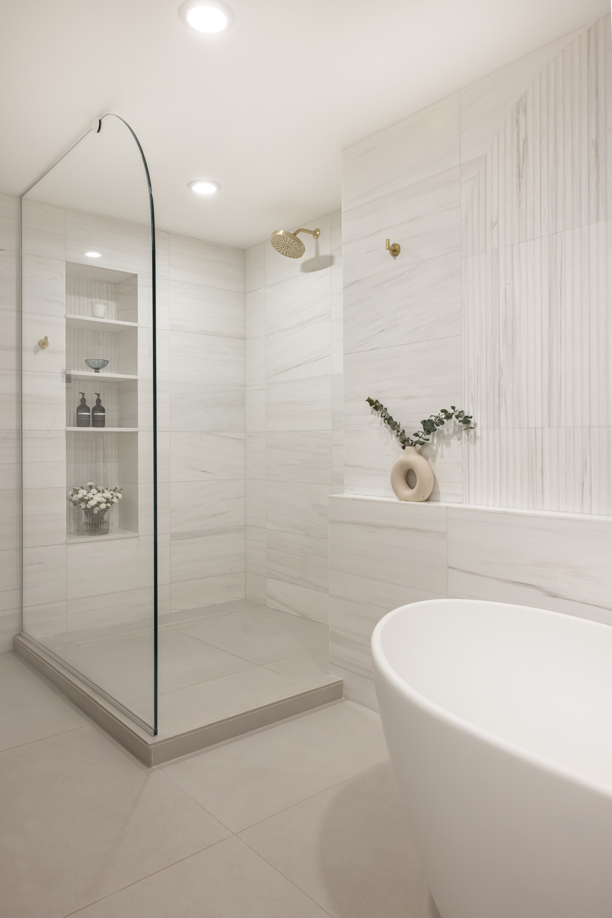 Natural marble tiles on the walls and shower, fluted accent marble behind the freestanding bathtub, natural brass fixtures and hardware by Watermark, a custom walnut vanity and an enormous shower elevate this space to a tranquil retreat. Floor heating was added to the bathroom, including the shower area, in order to provide additional comfort and an enjoyable experience in the clients’ zen space.