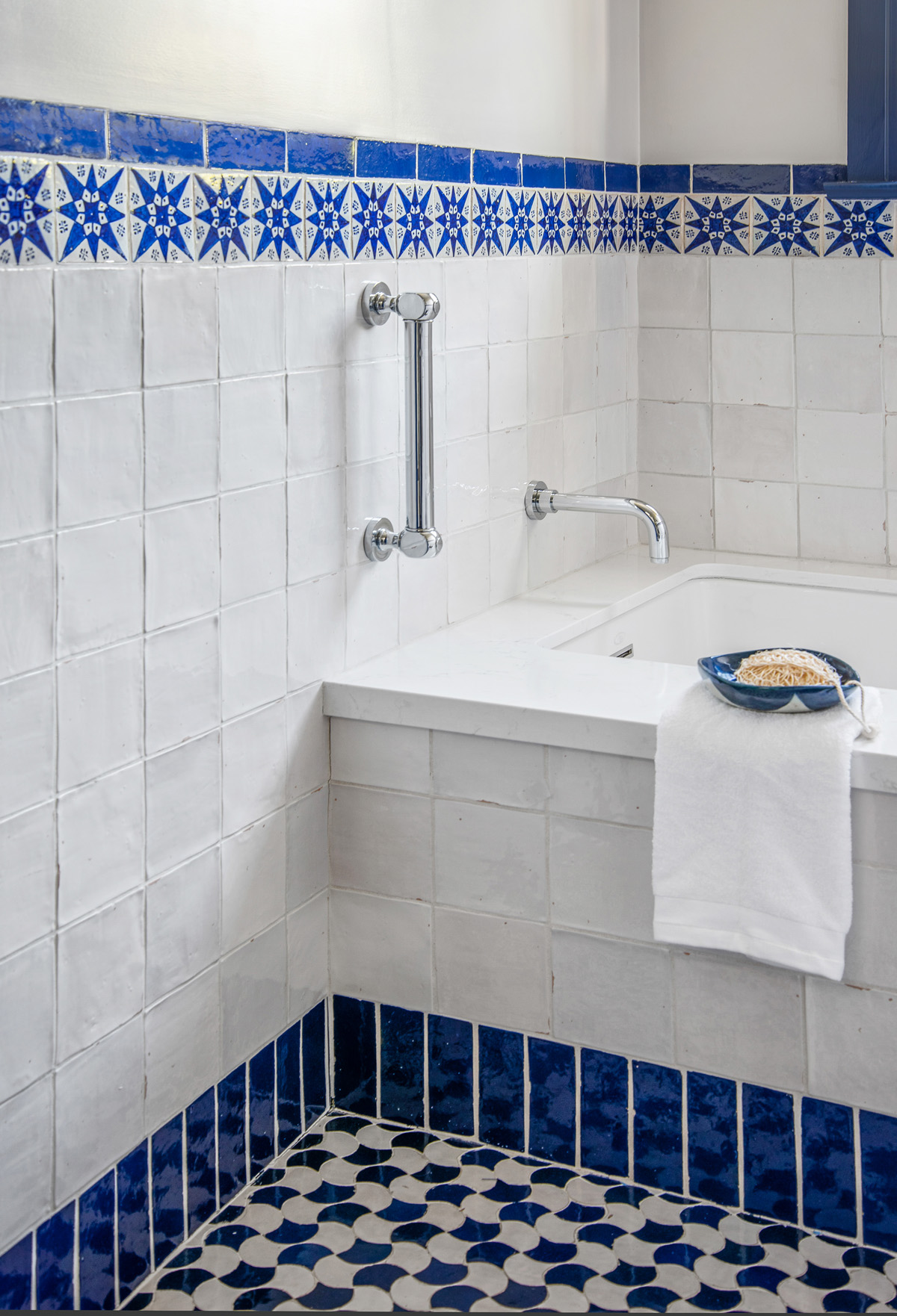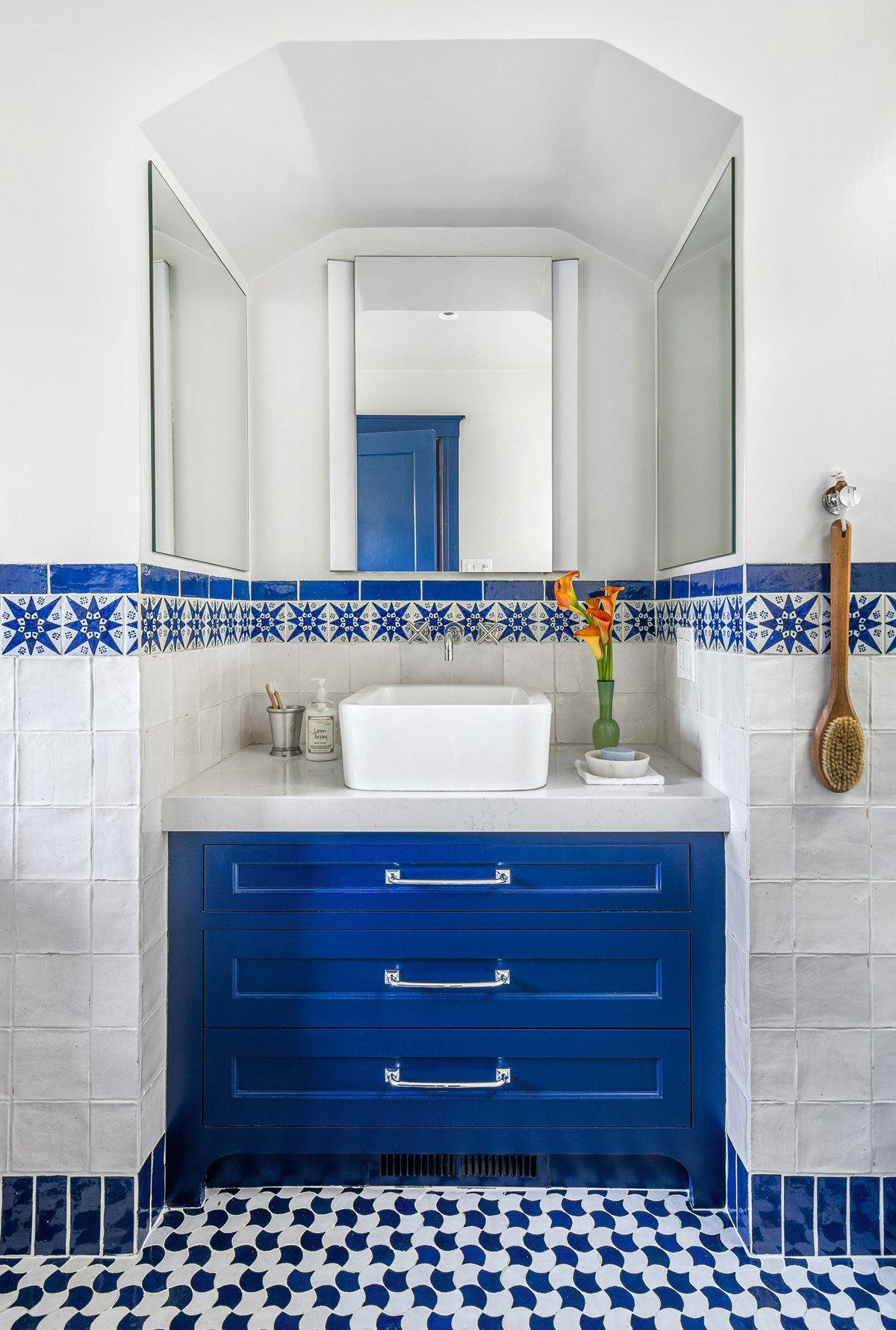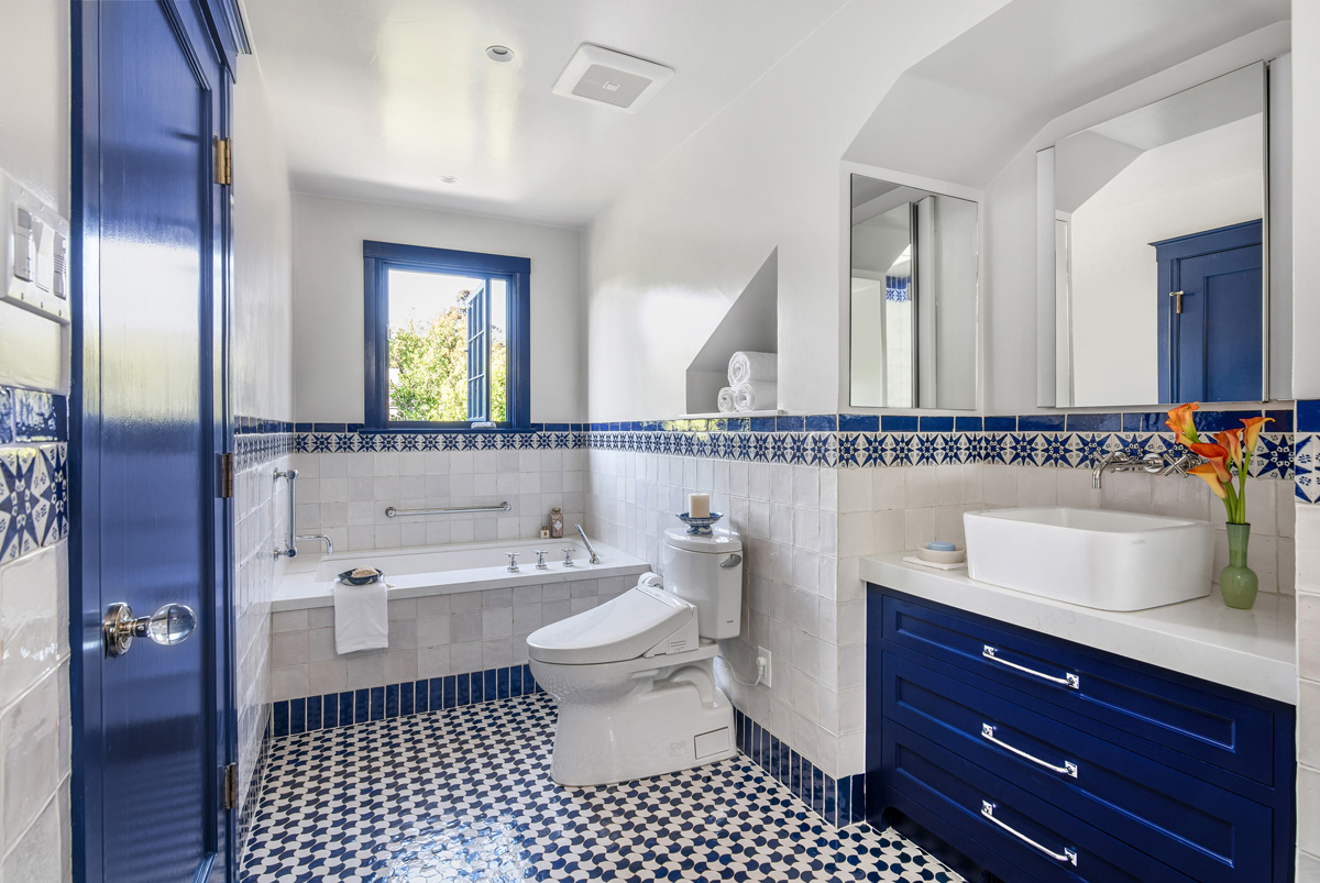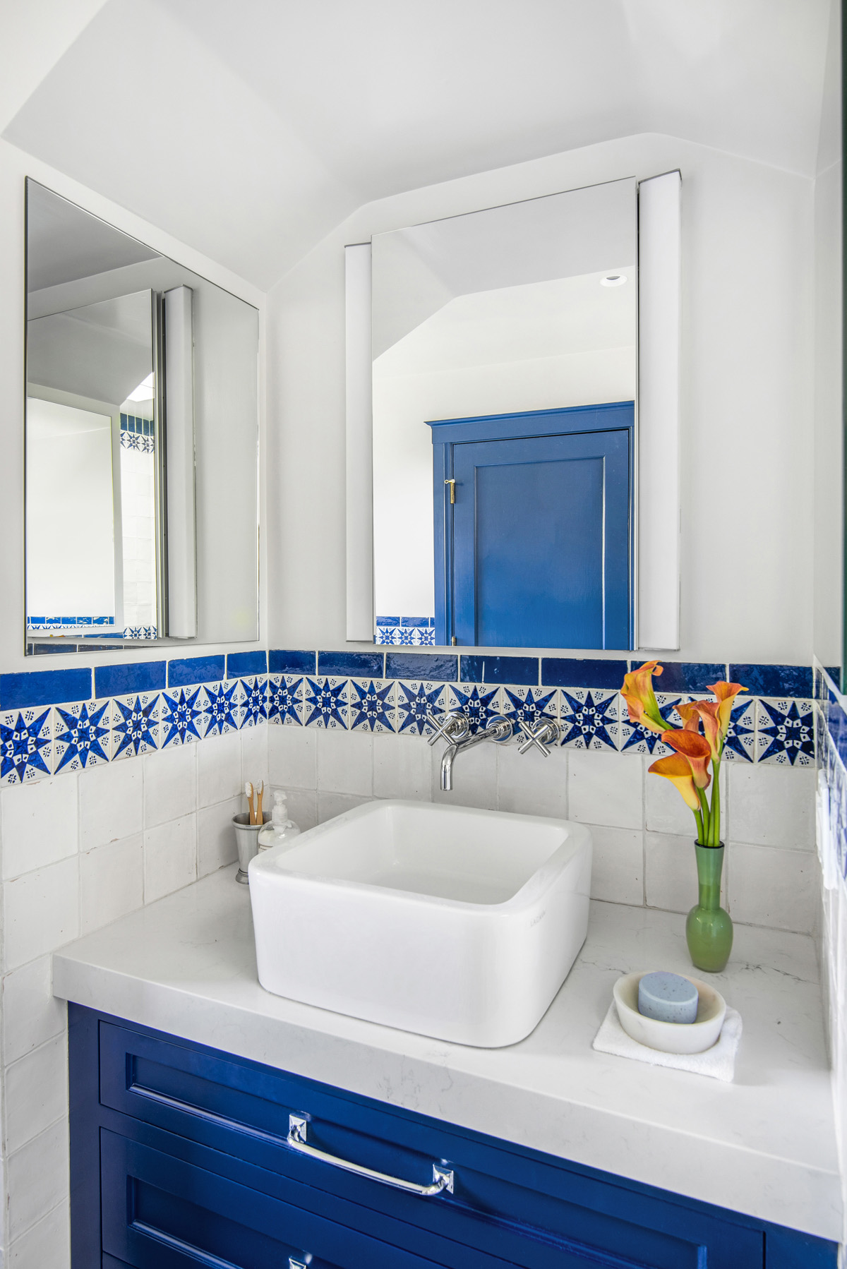 The bathroom design itself features a blue and white color scheme that is reminiscent of the Greek isles. Tiles in a range of patterns complement the palette and include Fleurs MOD mosaic tiles in white and cobalt, Mestizaje wall tiles in gloss white, Deco wall tiles by Etoile in blue and blue Bejmnat #15 trim tiles. Custom built by Spanish Galleon, the vanity showcases a rich blue repeated on the doors and trim. Fixtures include a tiled-in tub from HydroSystems, porcelain vessel sink from Lacava and Toto Vespin II toilet. Faucets and accessories in gleaming chrome are from California Faucets, Jaclo and Sigma Faucet, while the sconces and mirrored medicine cabinet are by Glass Crafters.