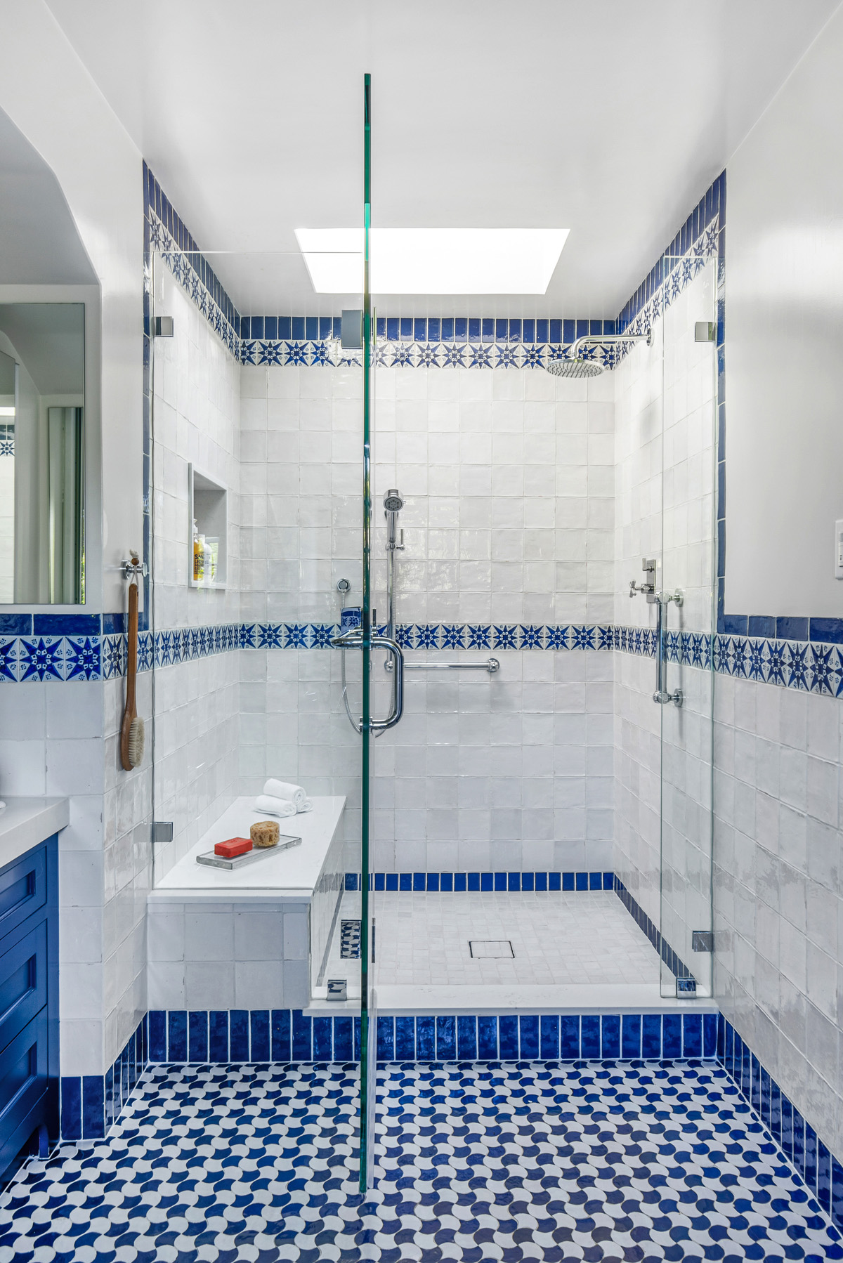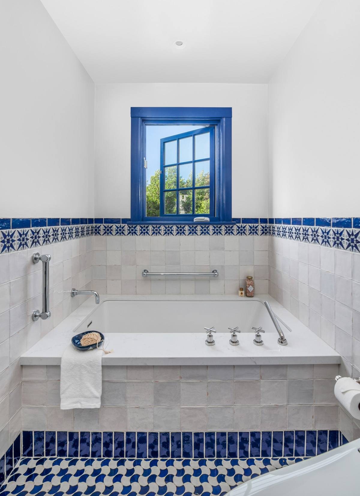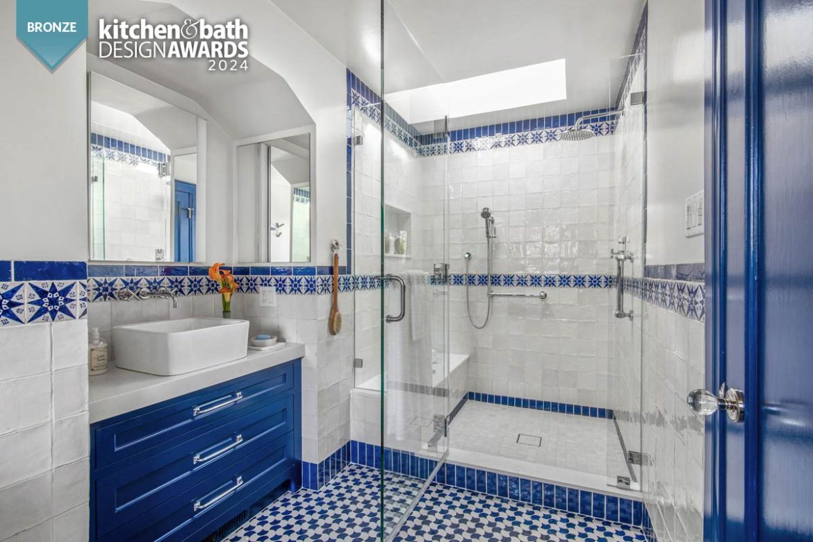 The bathroom design itself features a blue and white color scheme that is reminiscent of the Greek isles. Tiles in a range of patterns complement the palette and include Fleurs MOD mosaic tiles in white and cobalt, Mestizaje wall tiles in gloss white, Deco wall tiles by Etoile in blue and blue Bejmnat #15 trim tiles. Custom built by Spanish Galleon, the vanity showcases a rich blue repeated on the doors and trim. Fixtures include a tiled-in tub from HydroSystems, porcelain vessel sink from Lacava and Toto Vespin II toilet. Faucets and accessories in gleaming chrome are from California Faucets, Jaclo and Sigma Faucet, while the sconces and mirrored medicine cabinet are by Glass Crafters.