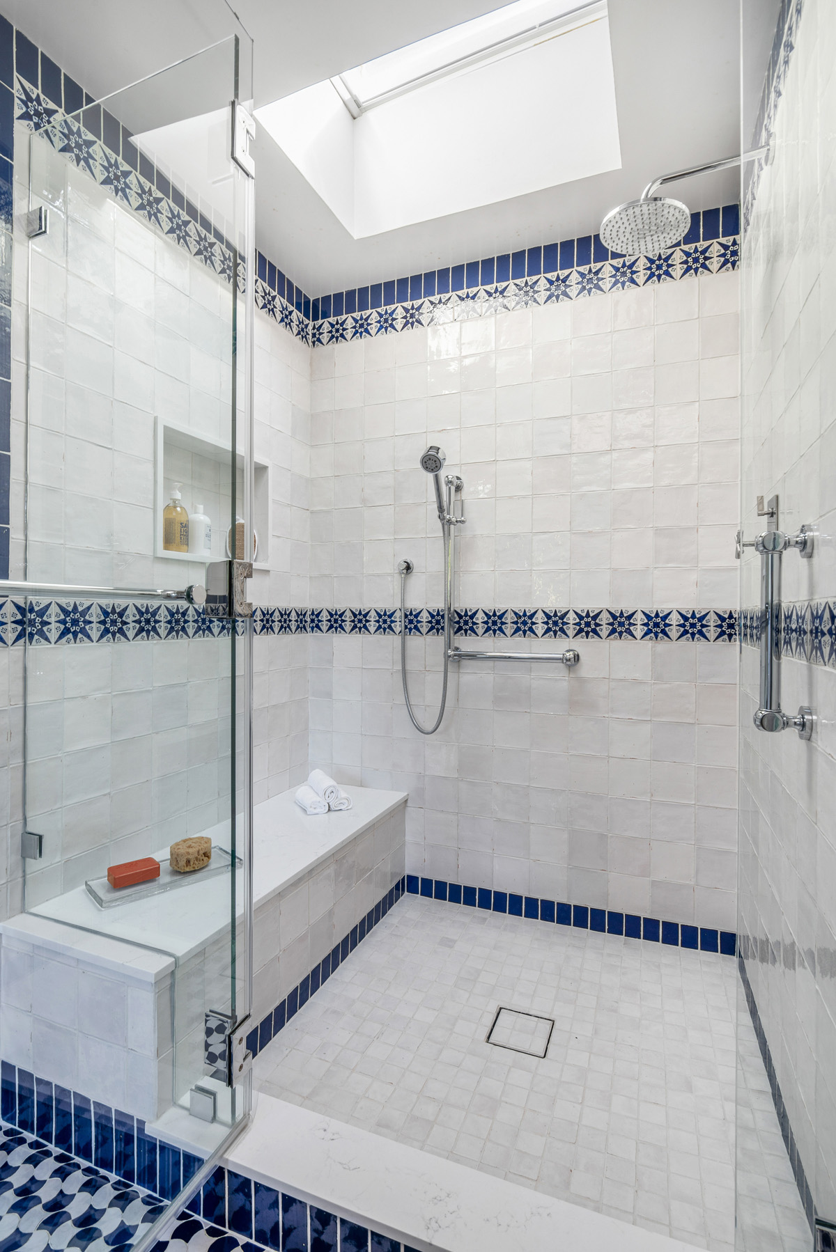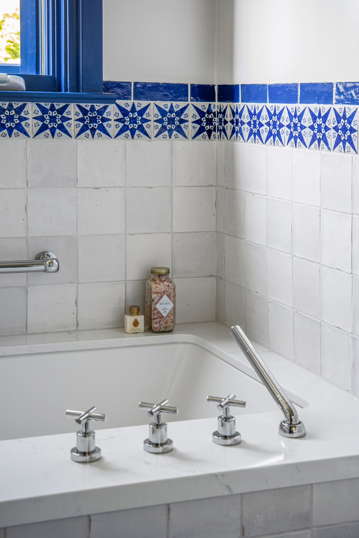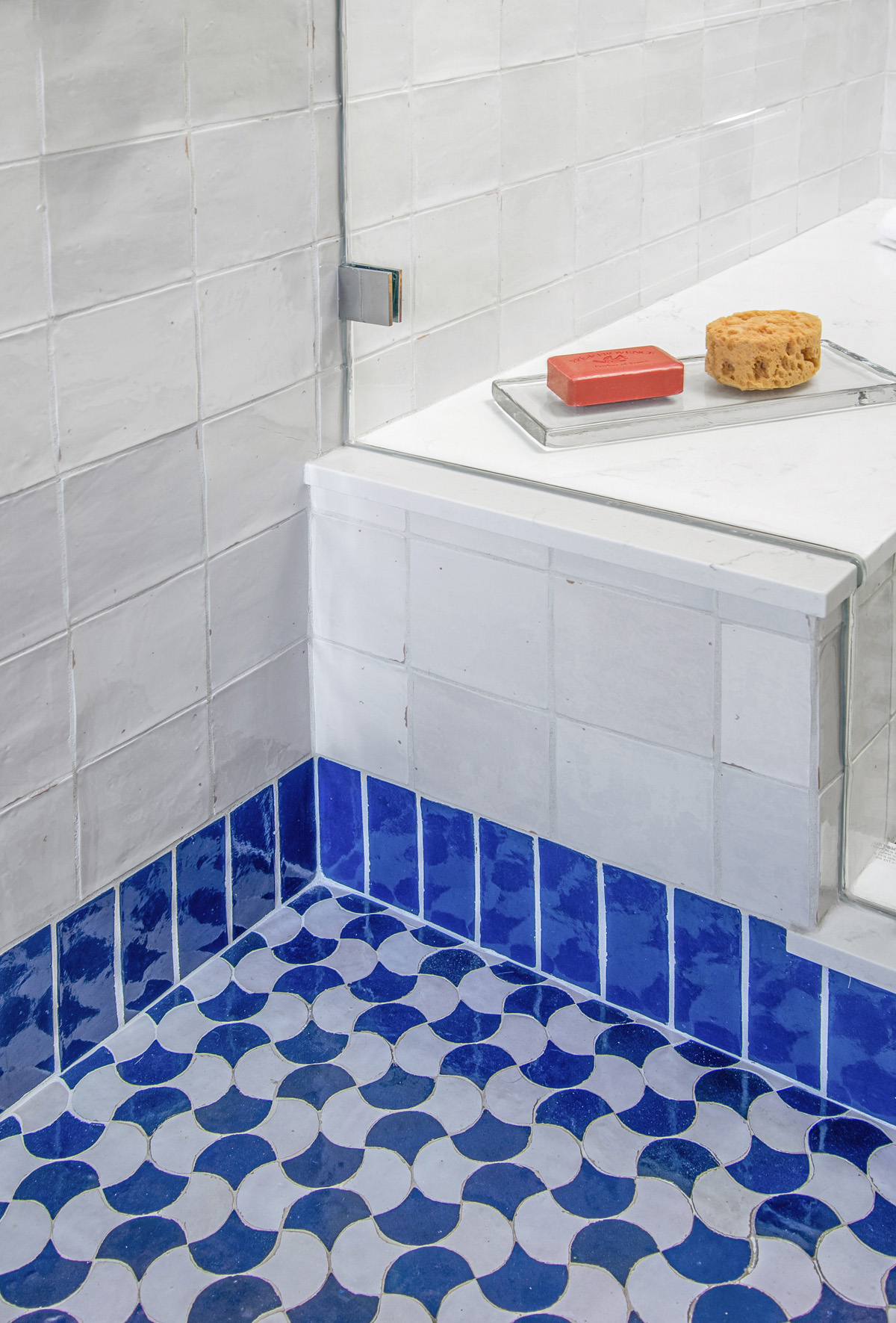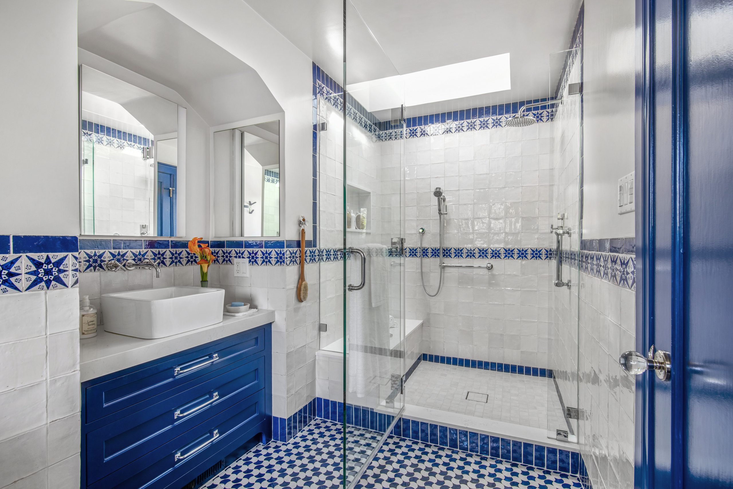 The bathroom design itself features a blue and white color scheme that is reminiscent of the Greek isles. Tiles in a range of patterns complement the palette and include Fleurs MOD mosaic tiles in white and cobalt, Mestizaje wall tiles in gloss white, Deco wall tiles by Etoile in blue and blue Bejmnat #15 trim tiles. Custom built by Spanish Galleon, the vanity showcases a rich blue repeated on the doors and trim. Fixtures include a tiled-in tub from HydroSystems, porcelain vessel sink from Lacava and Toto Vespin II toilet. Faucets and accessories in gleaming chrome are from California Faucets, Jaclo and Sigma Faucet, while the sconces and mirrored medicine cabinet are by Glass Crafters.