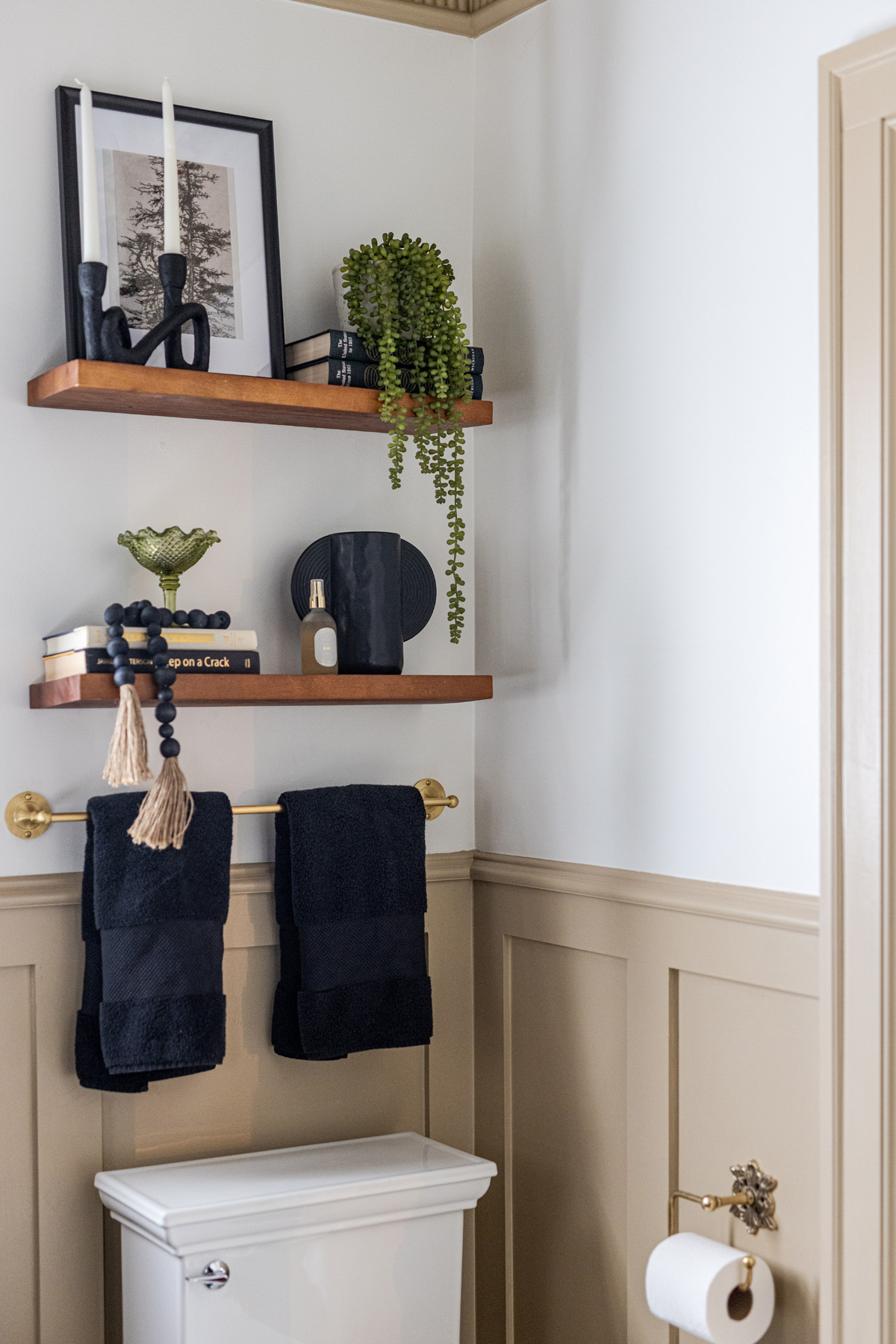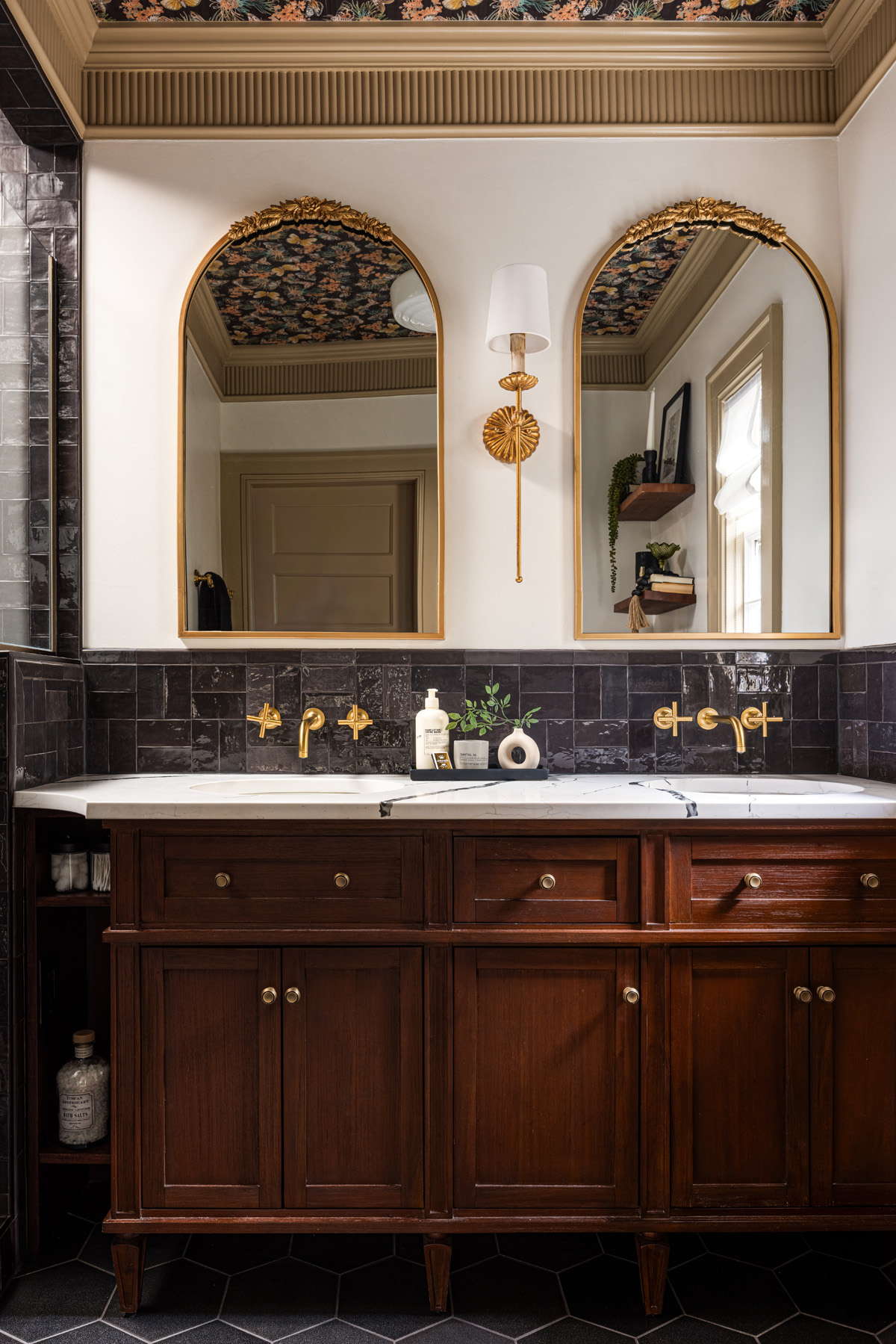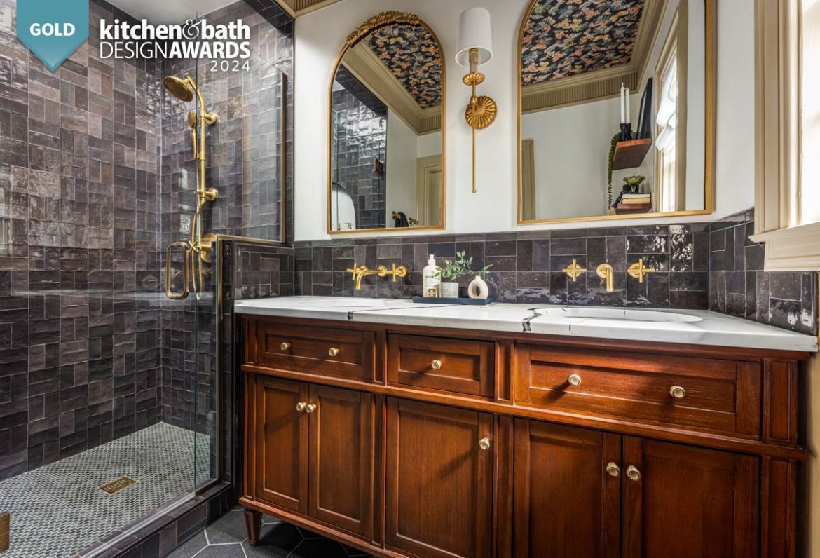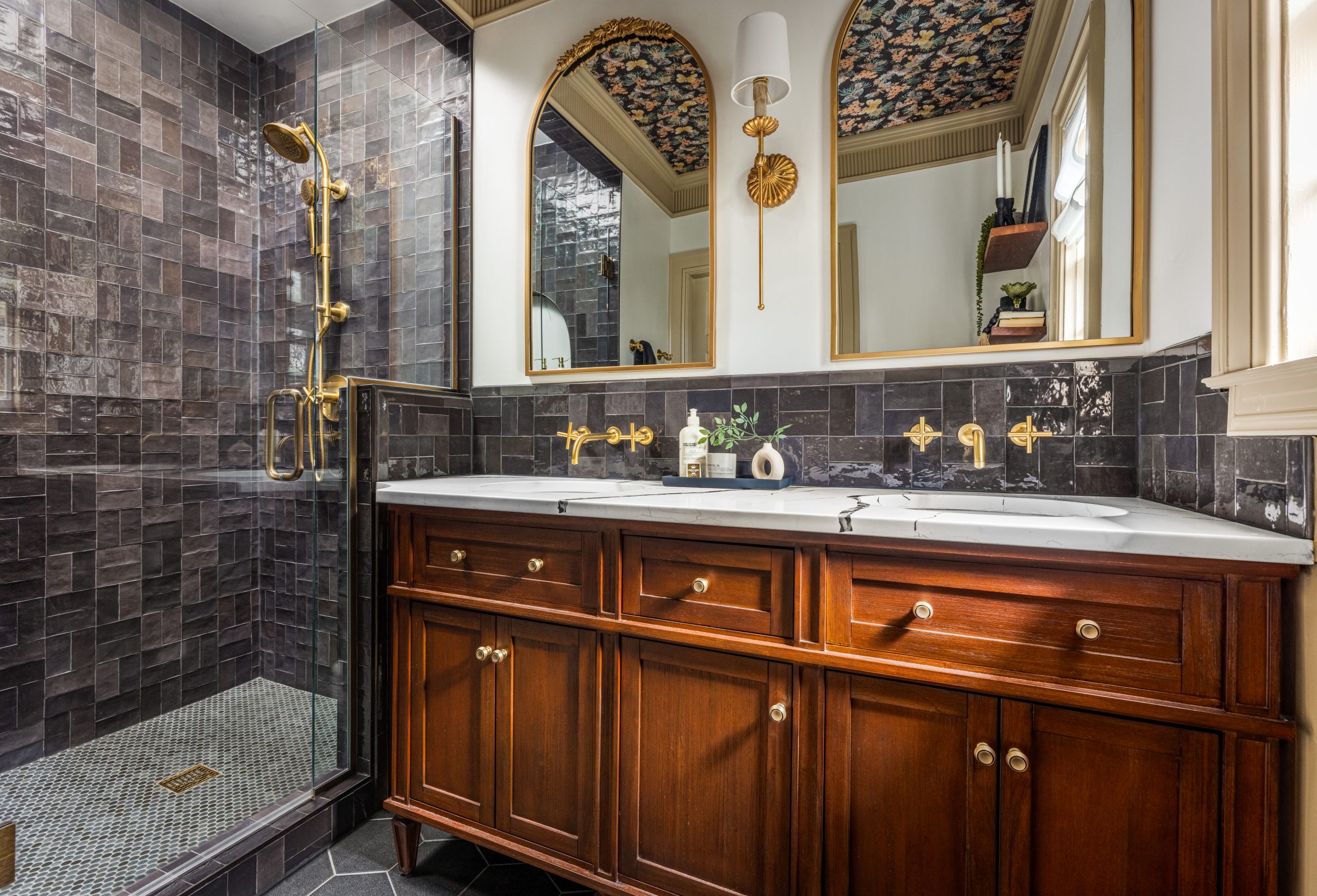 The walnut vanity mimics the tones found throughout the rest of the home while the wainscoting in the space mimics the style. Additional details such as the thick Victorian-inspired crown molding, the whimsical Milton & King wallpaper on the ceiling and vintage-inspired light fixtures helped this bath achieve an authentically historic look.