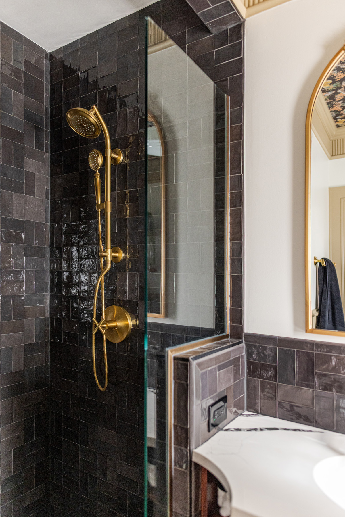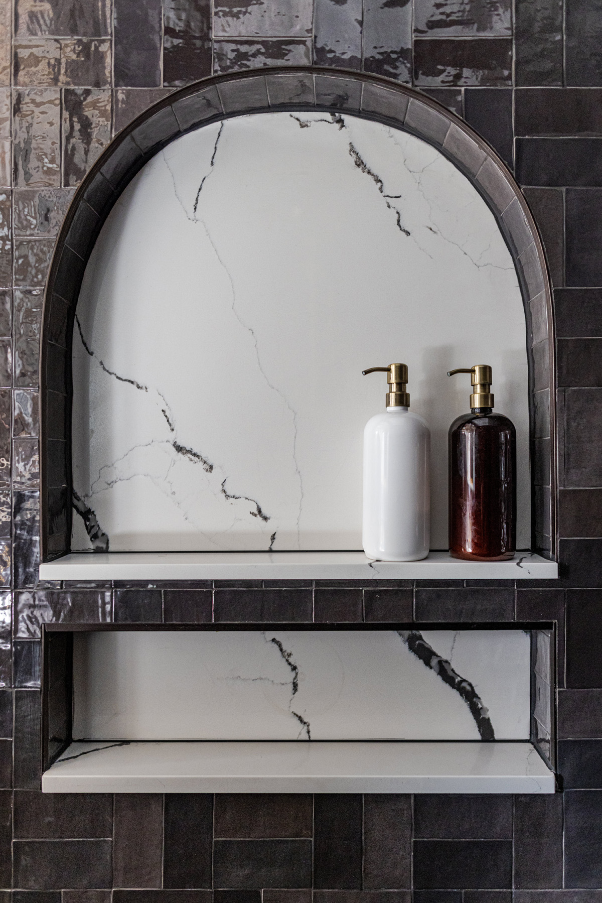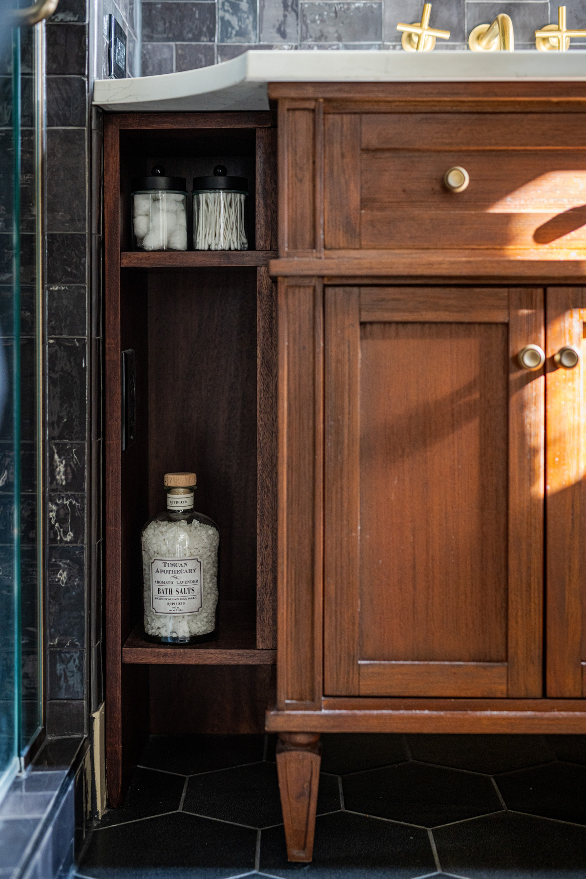 A double vanity went where the nursery door had been and more shower space was added thanks to the space where both bedrooms’ closets were previously. The double vanity was an innovative schematic solution to the biggest design challenge: the shower entrance would have been too tight if the standard vanity depth had been carried all the way across. Instead, a custom vanity with a clipped, curved countertop was added with color-matched open shelving underneath to provide additional towel storage and an electrical outlet. This solution freed up counter space and provided room for a half wall/full entry shower.