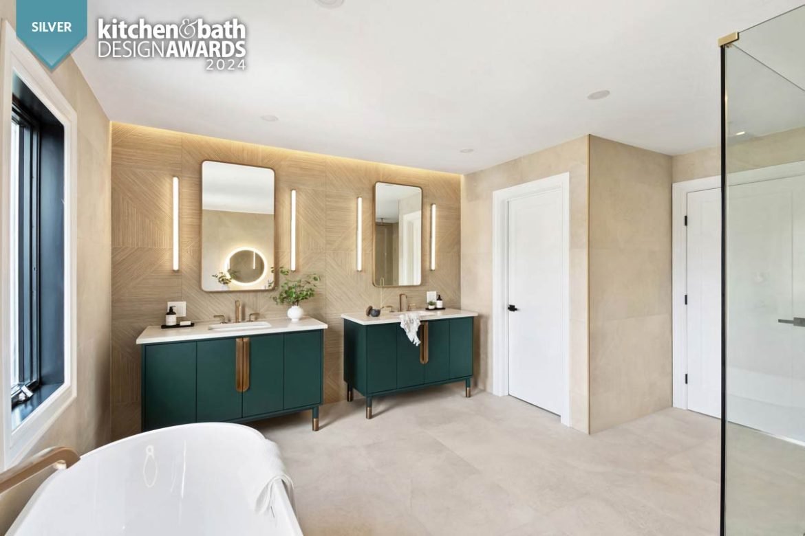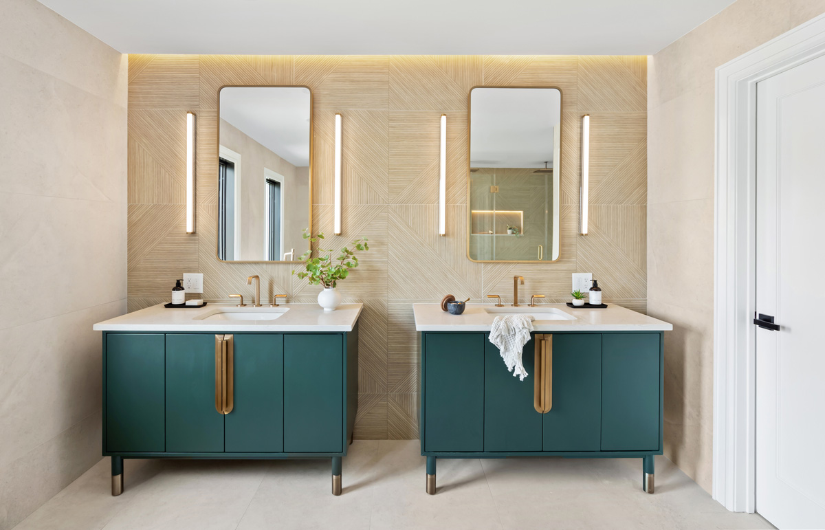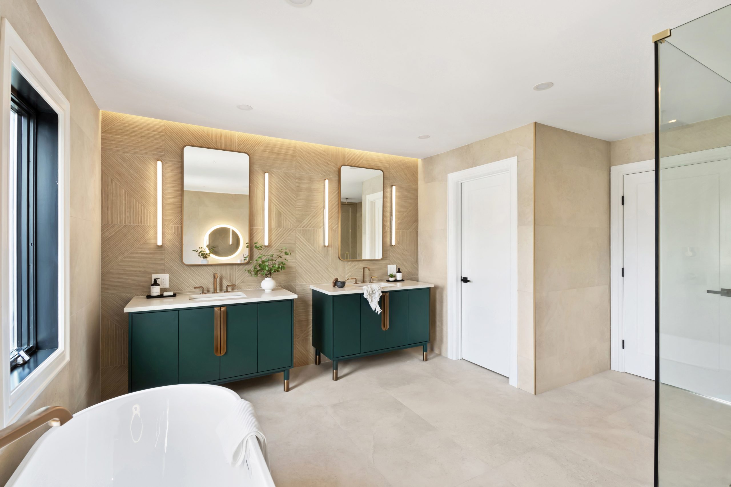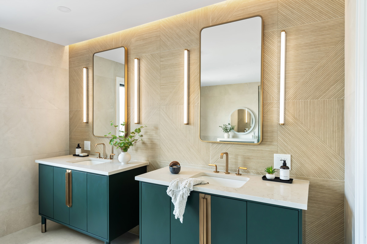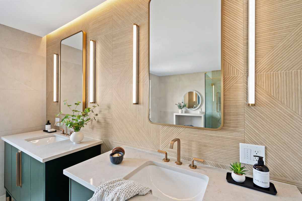 The design included two Robern Islamorada 48″ vanities in Nori green with Brizo Allaria faucets and two Kohler Caxton undermount sinks. The countertop is Zeus Extreme White Quartz. Enso 24″x48″ ribbed matte porcelain wood-look tile adorns the backsplash wall, which also includes a decorative mirror above each vanity. Fluted sconces are connected to an automated system to control the homeowners’ experience at the mirrors. The sconces offer the flexibility to adjust the color temperature and brightness to personal preferences and to suit different activities in the morning or night.