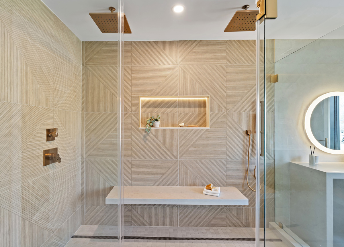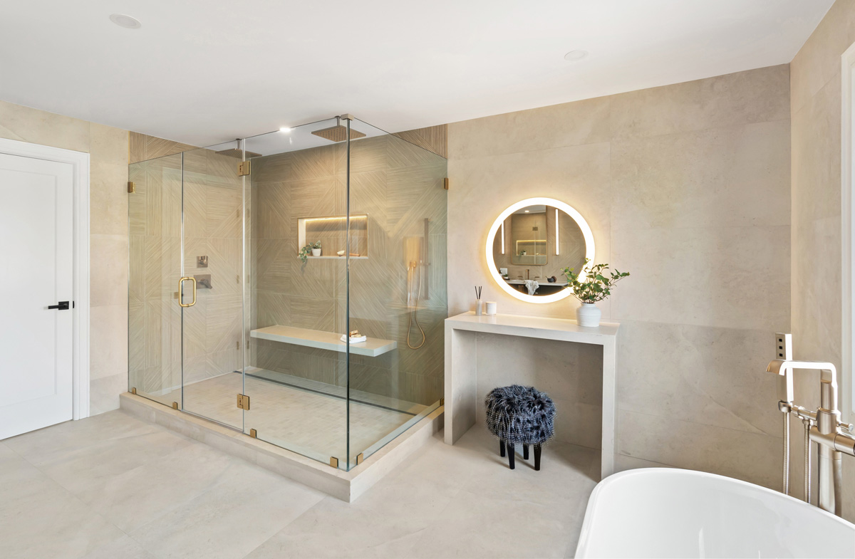This spa bathroom was designed for a real estate investment group focused on renovating and selling a newly constructed home at a premium price. The design had to appeal to a broad audience while integrating high-end products to lend a touch of sophistication to the bathroom. Use of earthy color palettes, clean lines and pronounced textures fostered a feeling of relaxation and well-being.