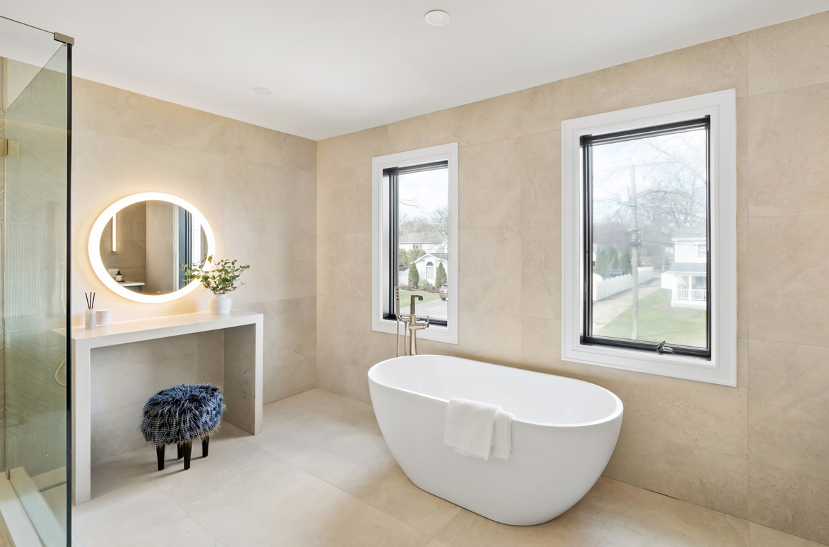 In the bathing area, the Wyndham Brooklyn 60″ freestanding acrylic tub features a Delta Faucet Tetra floor mount tub filler and sits beneath two windows. The shower, which is large enough for two people, has two Delta Faucet Ceiling rainshowers and a repeat of the Enso 24″x48″ ribbed matte porcelain tile. The flooring is Instinct Light gray 32″x32″ concrete-look matte from TileBar.