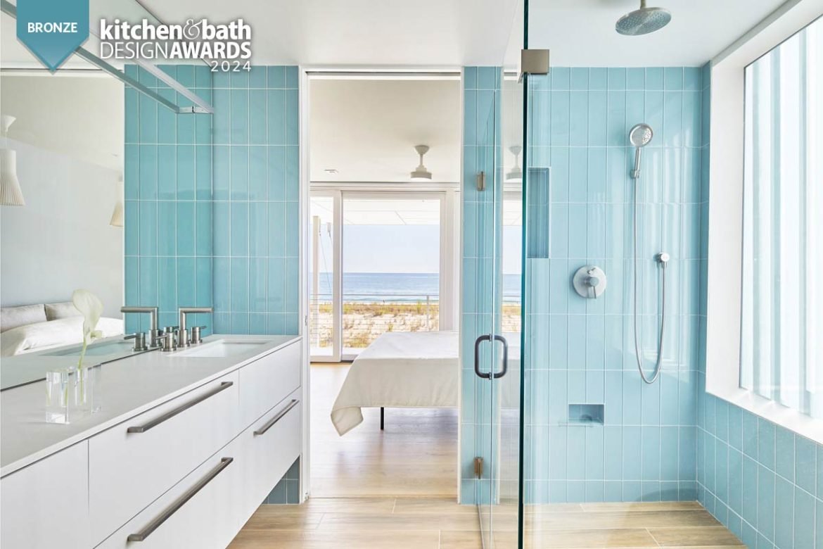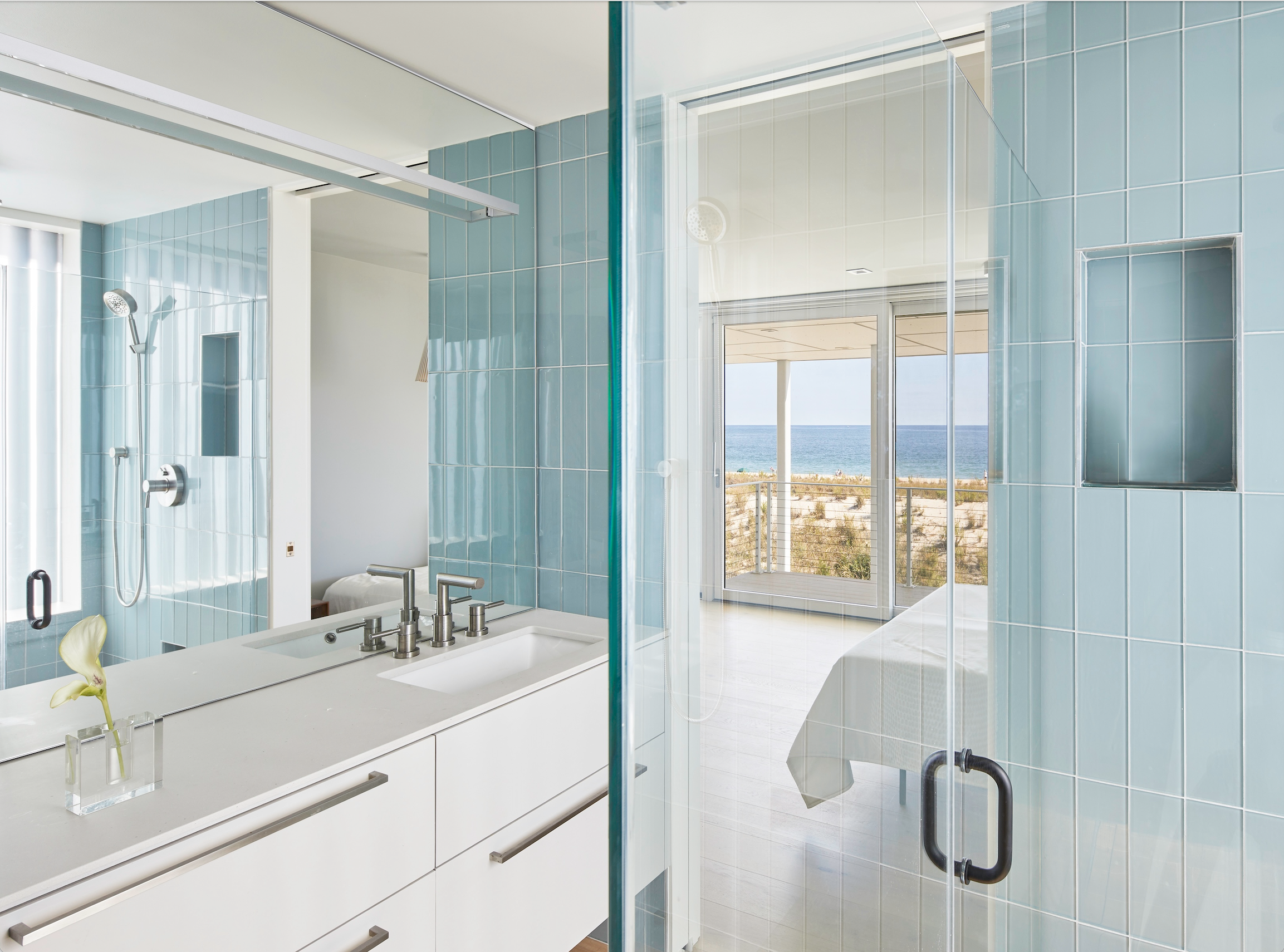 Custom cabinets by Shay Gallo Construction are topped with Caesarstone Fresh Concrete countertops and a Kohler sink with Speakman Vector faucets. The shower tiles are Glazzio’s Crystille Series in Morning Mist, a watery blue that mimics the ocean. Floor tile by Happy Floors in Acorn Natural matches the color of sand, and the bedroom’s light oak wood flooring makes the transition even more seamless.