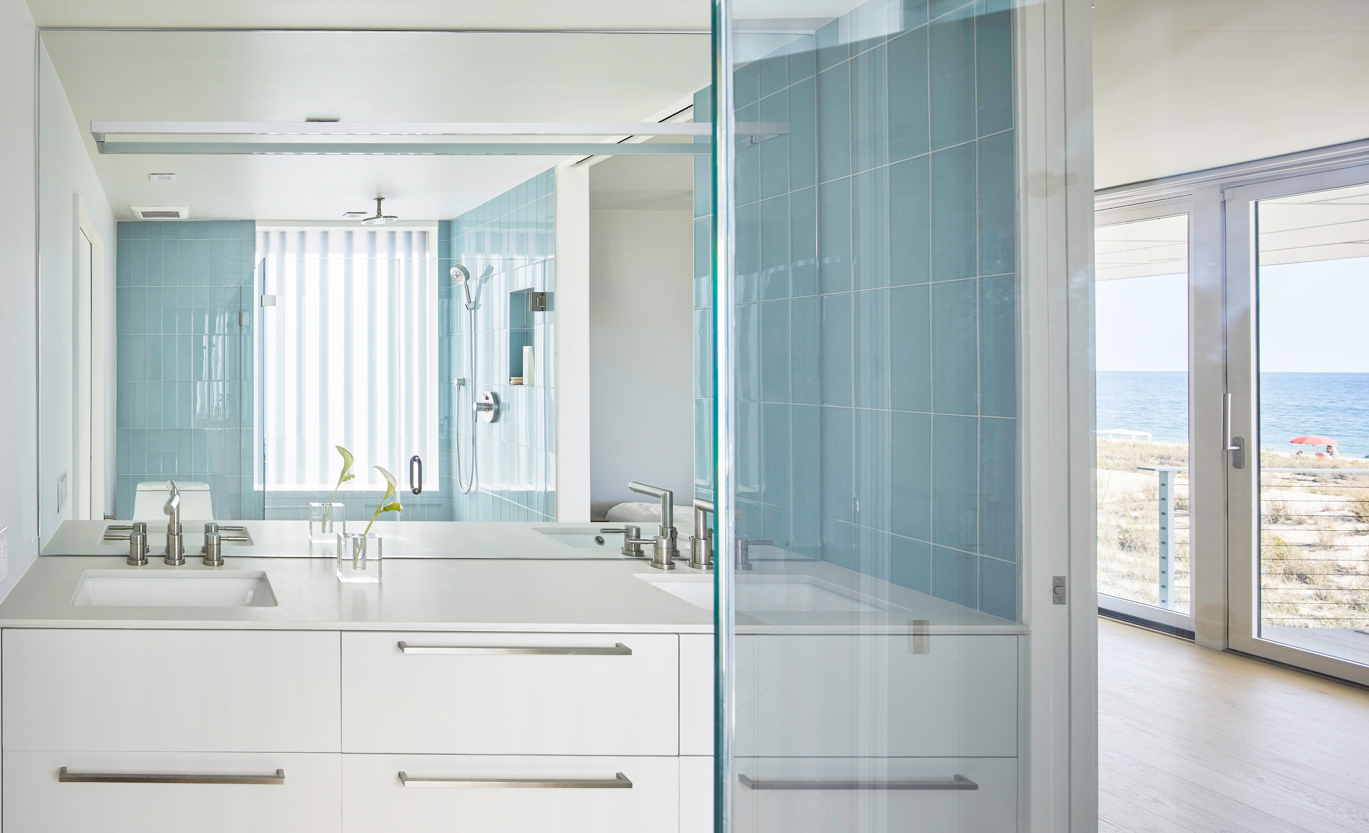 At this summer home on the ocean, the tight footprint of this 63-sq.-ft. bathroom was hampered further by a window that provided limited privacy from the neighbors and no real view of the water. The solution became all about “touching” the ocean.