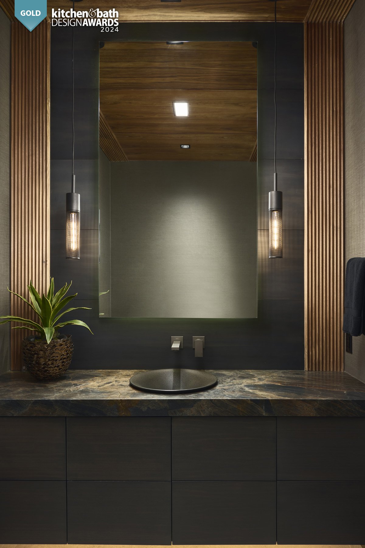 The vanity wall is sheathed in cold rolled steel paneling, flanked by V-groove walnut paneling that recesses into the walnut ceiling. (Of note: since this V-groove paneling preceded the grooved trend that has appeared in the last year, a local fabricator created custom knives to achieve the effect!) The vanity itself features custom cabinetry by Cutting Edge Woodworking, and the Capolavoro leathered granite countertop by Stone Collection is topped with a semi-recessed Kohler sink and wall-mount Graff faucet.