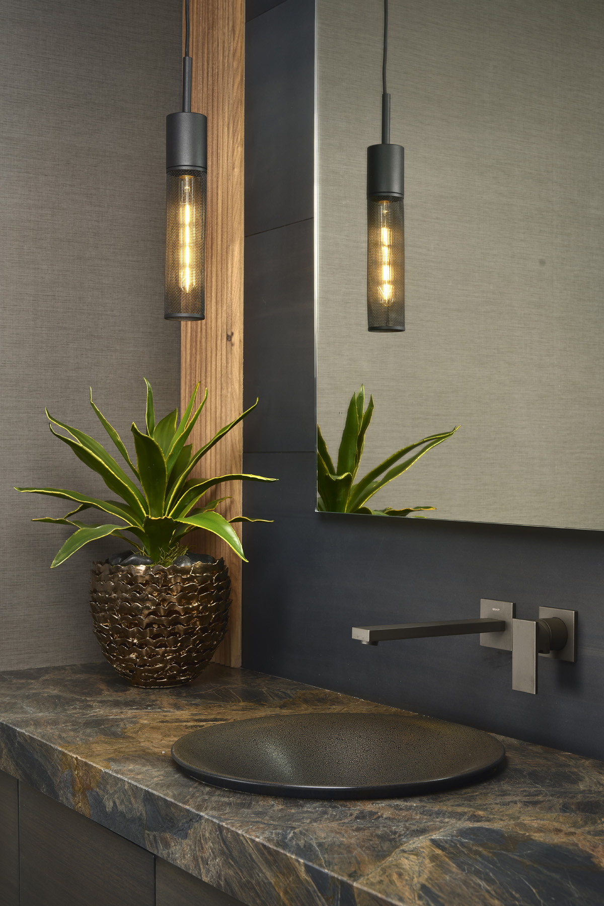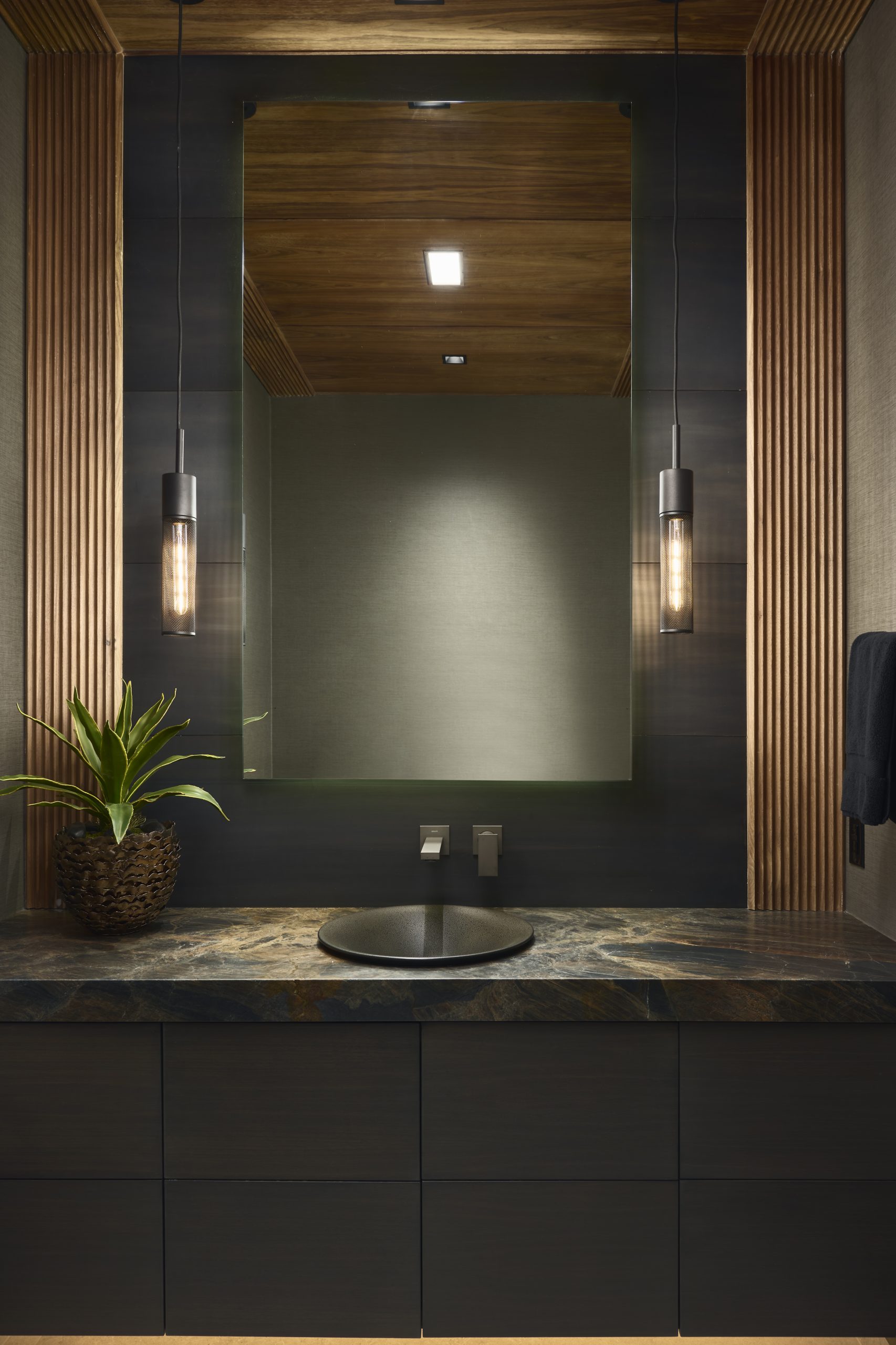 Furthering the sexy, moody ambiance of the space is programmable pendant lighting, as well as a distinctive black toilet and urinal from Kohler.