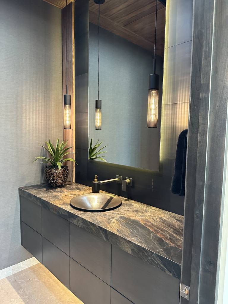 Just one of a whopping eight baths in a 9,850-sq.-ft. new-build vacation home in Scottsdale, AZ, this powder room is set adjacent to the billiards room. Because the powder room, which was designed by Klosterman and co-designer Michelle Jefferson, sees frequent use during “guys’ night” pool games and hangouts, this necessitated an elevated masculine aesthetic to really bring the Rat Pack vibe.