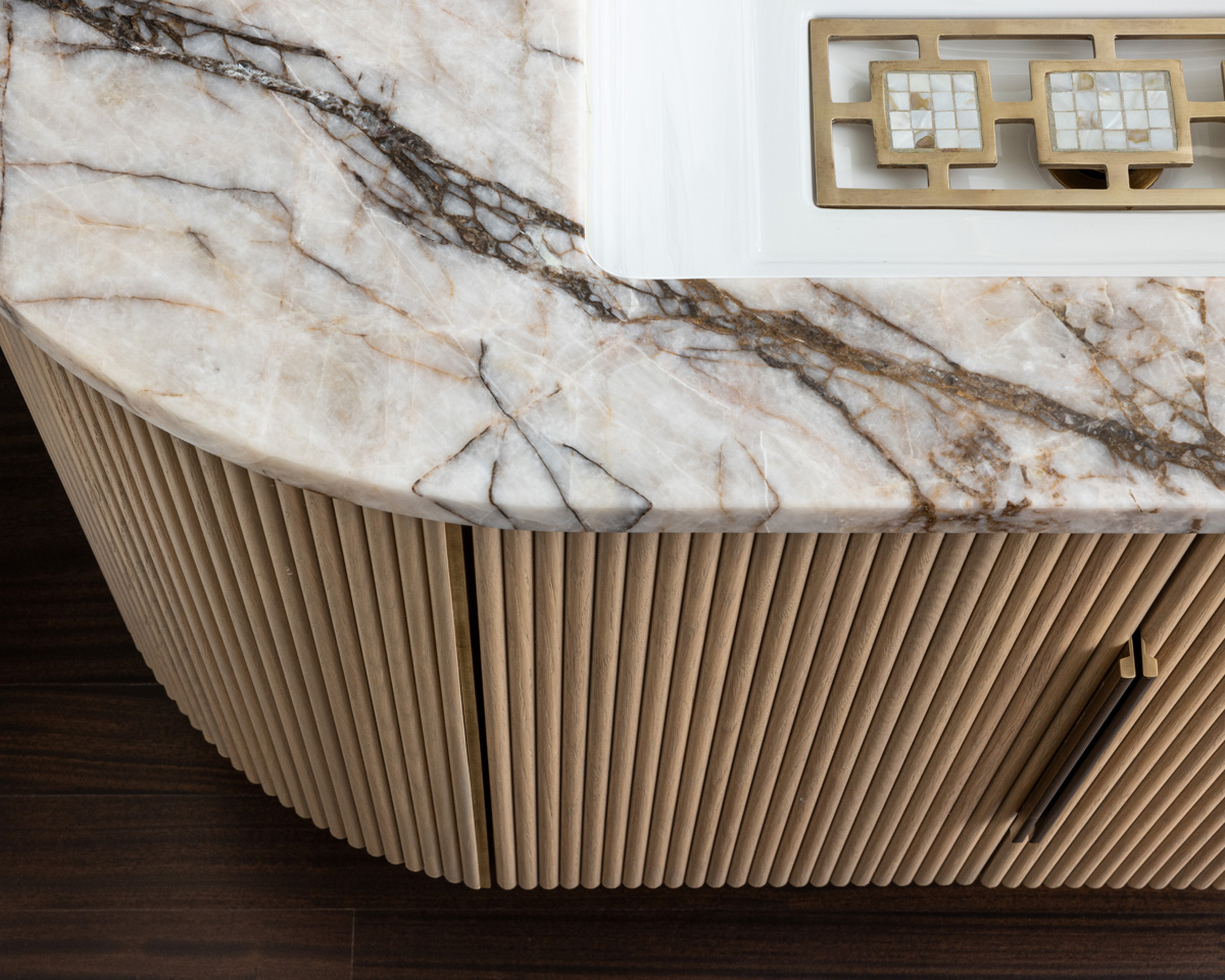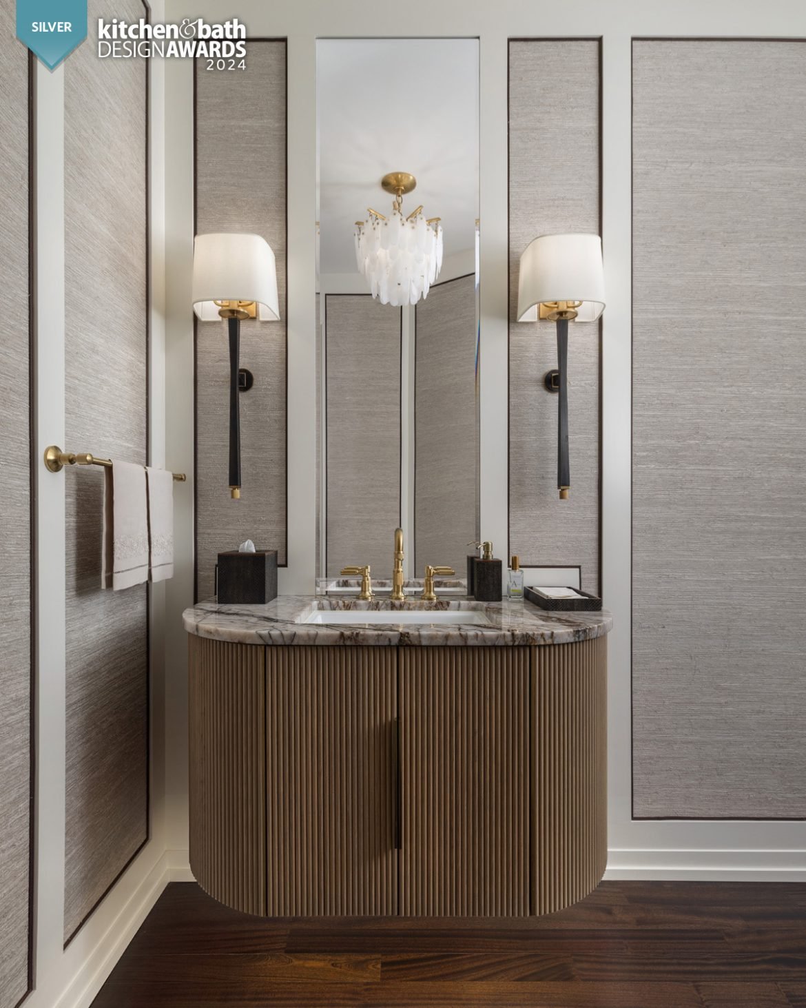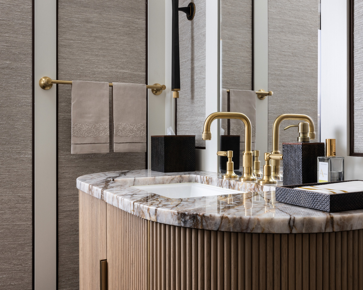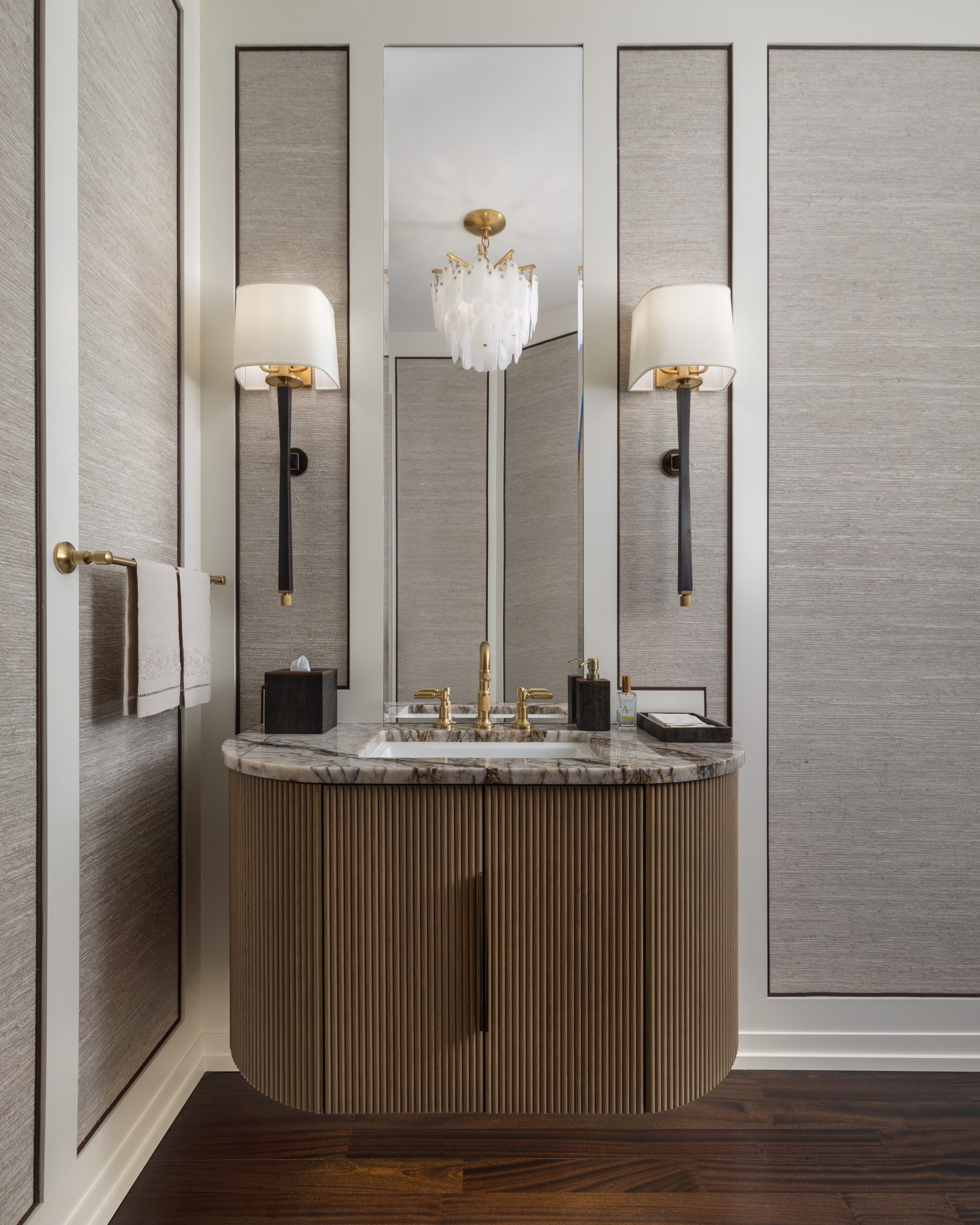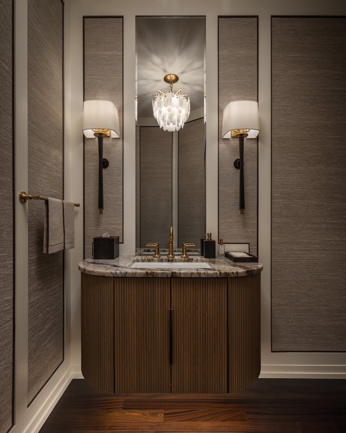 In order to harmonize with the curvature of the wall, intricate wainscoting with a textured wallcovering inlay and cord trim was selected. Additionally, the curve of the reeded white oak vanity calls back to the room’s shape while providing a rich, elevated look. Details such as a sink drain sculpted in brass and mother of pearl further the sumptuous yet formal aesthetic.